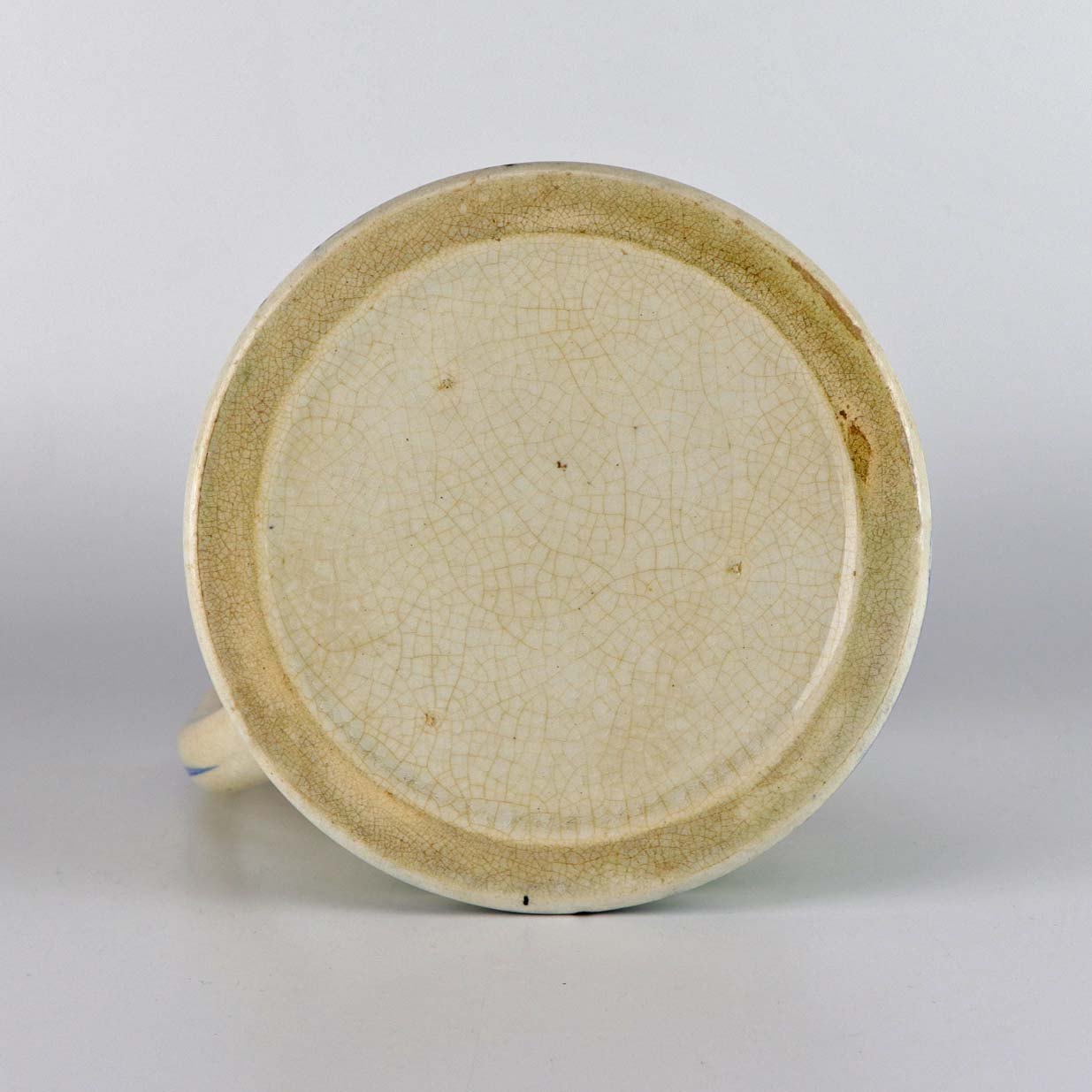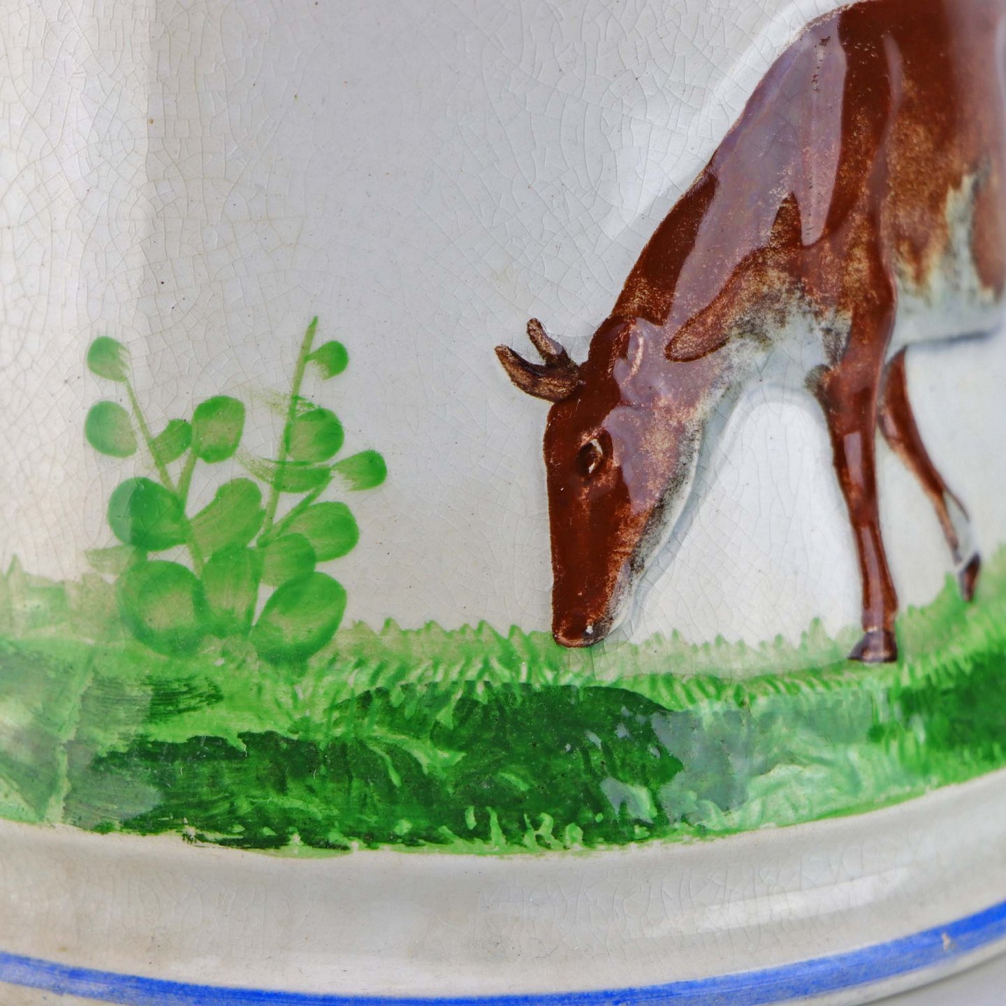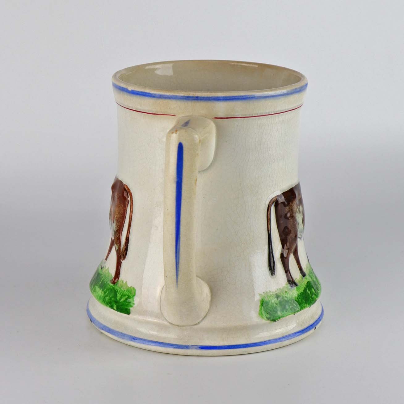 Antik ølkrus i fajance, som også er kendt under navnet Portlands krus. Dette krus er fremstillet i perioden år 1885-1905 og er dekoreret med motiv af en tyr og en ko