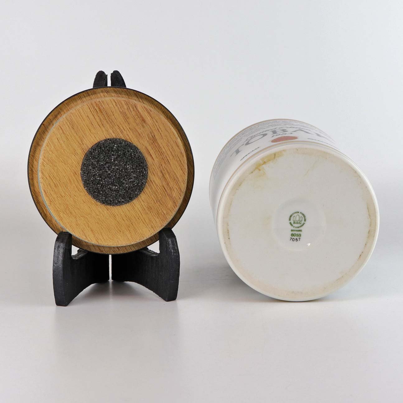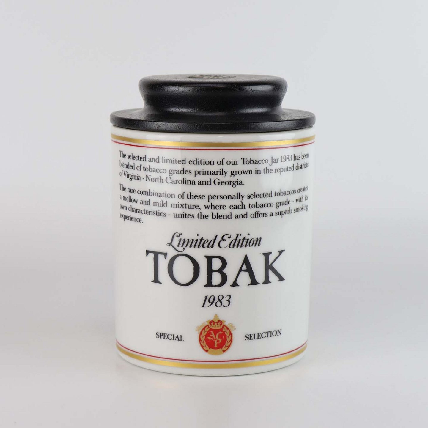 Krukke i porcelæn med låg af mørkt træ til opbevaring af pibetobak. Tobaksdåsen har motiv og tekst fra den tidligere tobaksfabrik i Horsens Alfred og Christian Petersen Ltd. Nr. 6053/7057