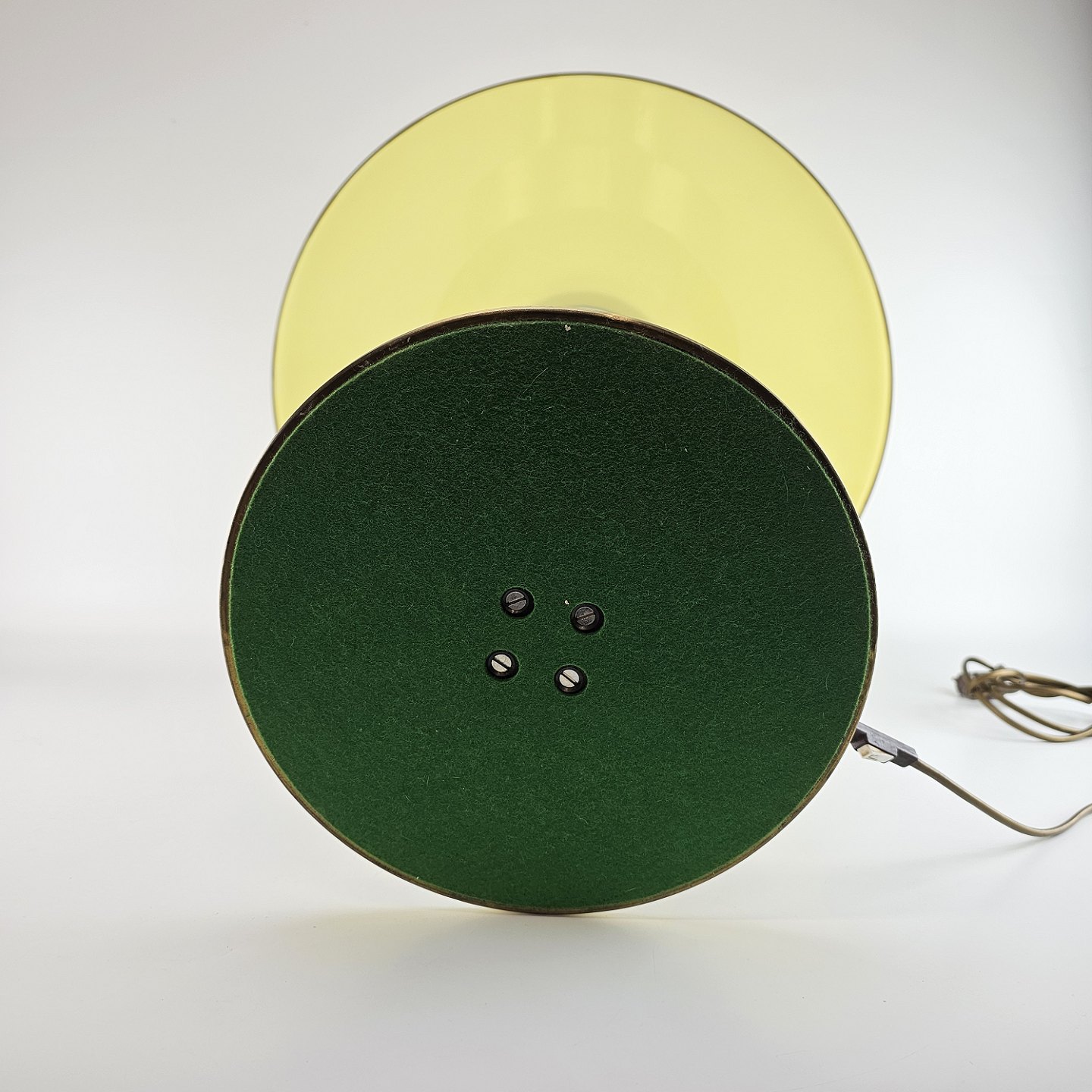 Lampen er lavet af messing og har en akrylskærm med et bånd og top af messing.
