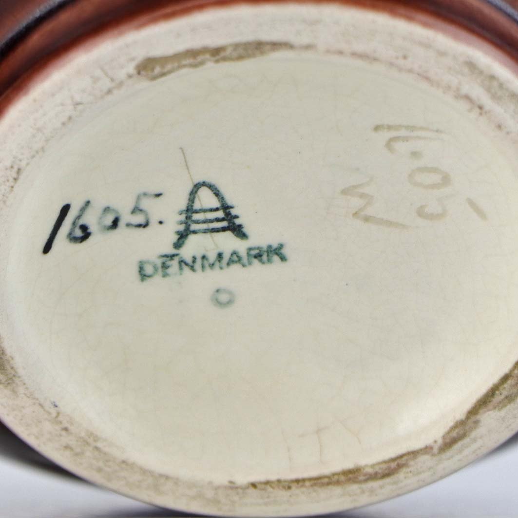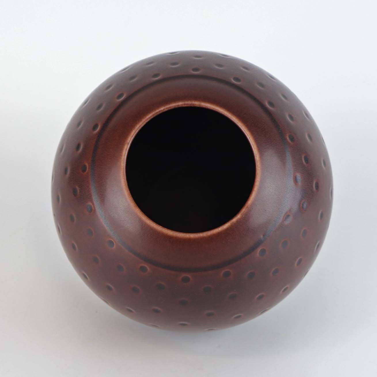 Rund kugleformet Solbjerg vase i brun fajance med enkelt prikformet mønster. Nr. 1605