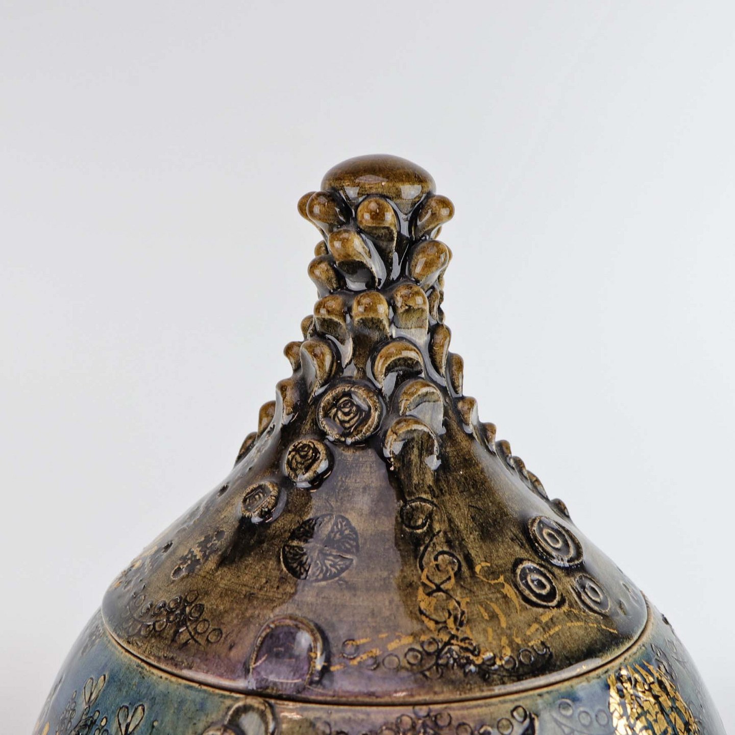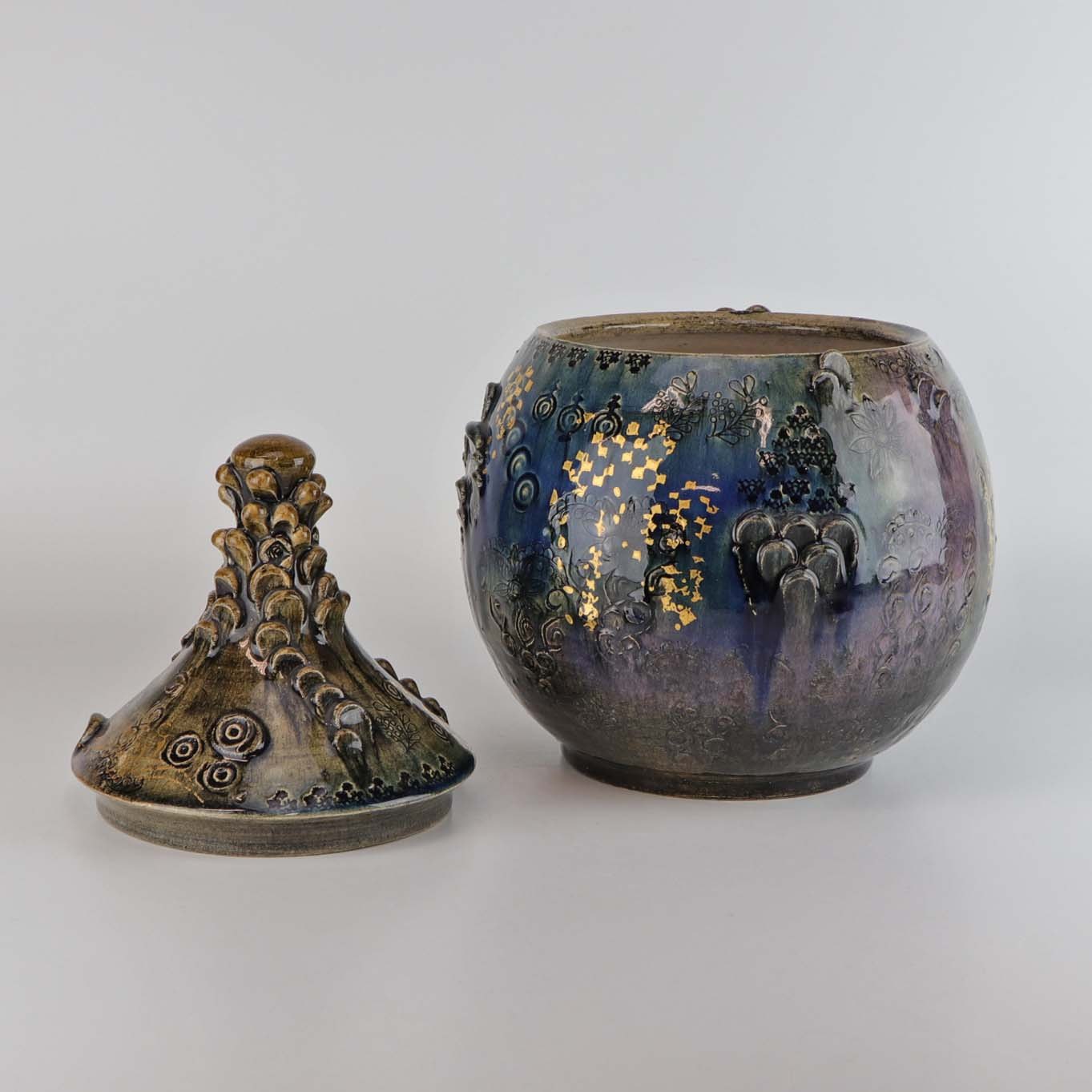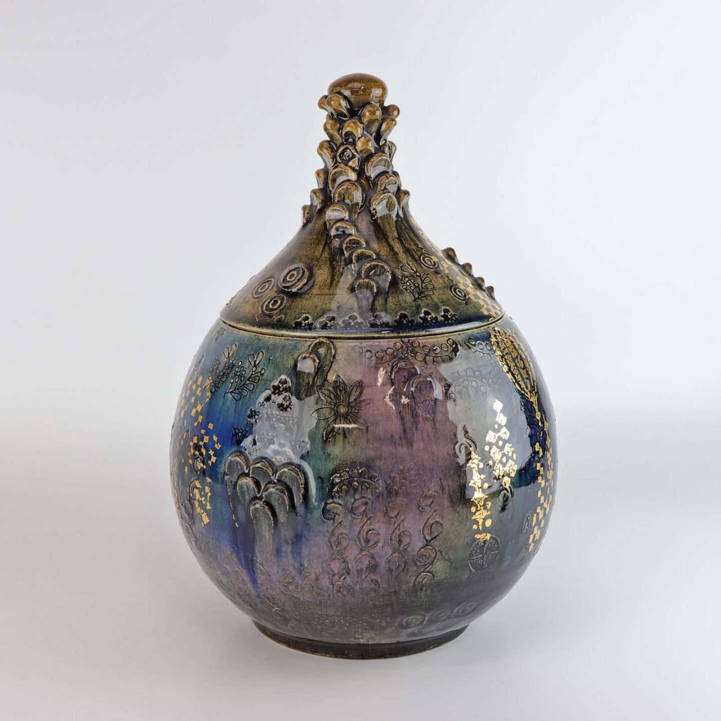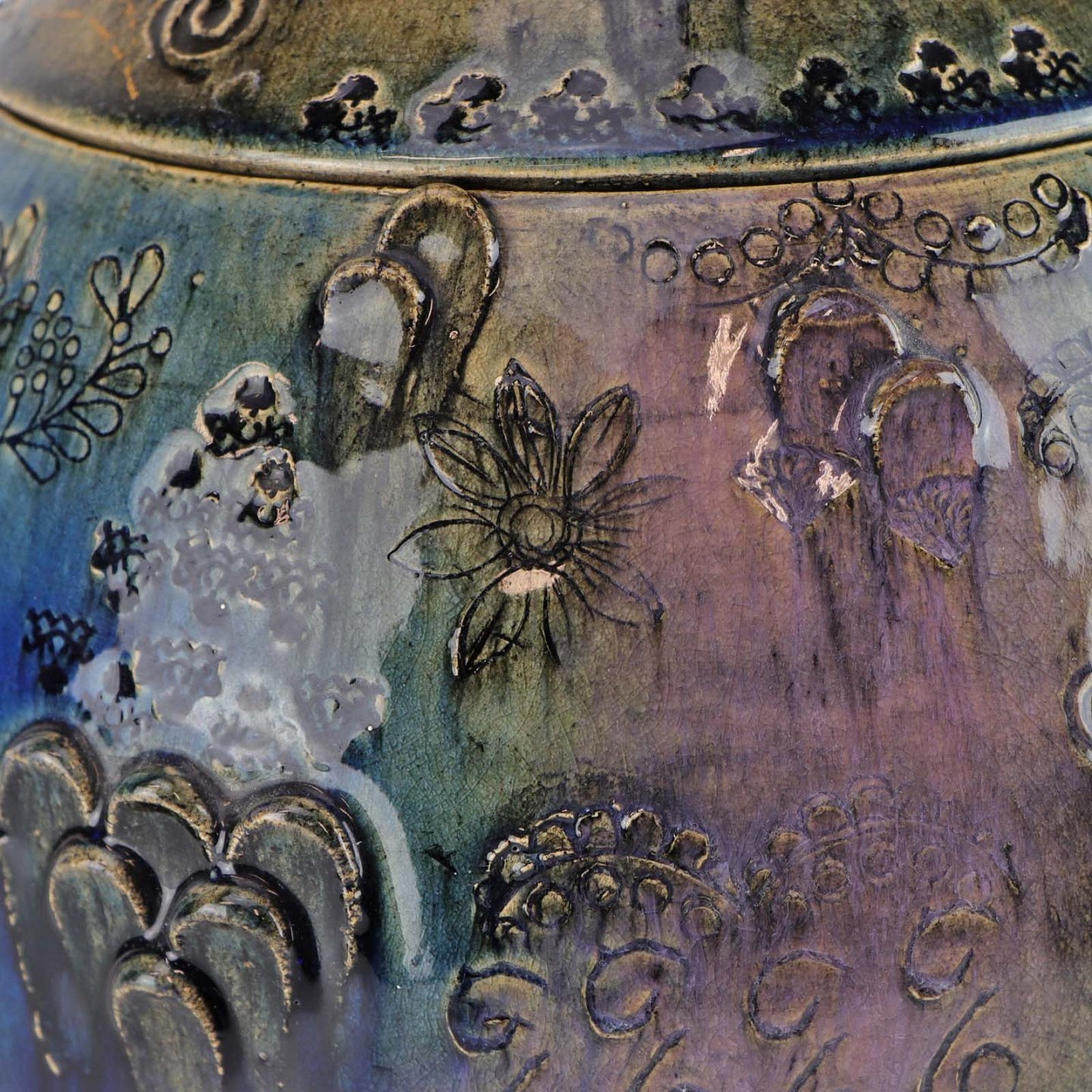 Stor lågkrukke i keramik med multifarvet glasur og dekoreret med forskellige abstrakte og naturmotiver.