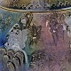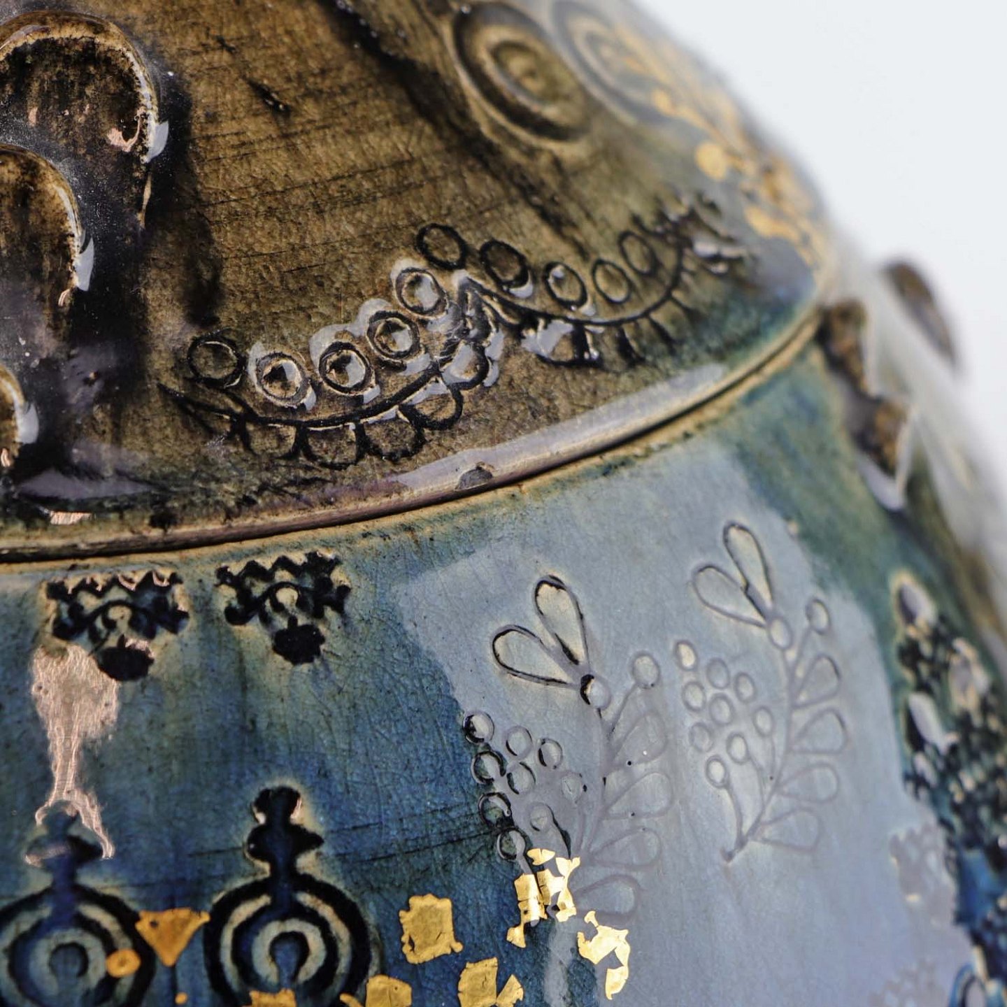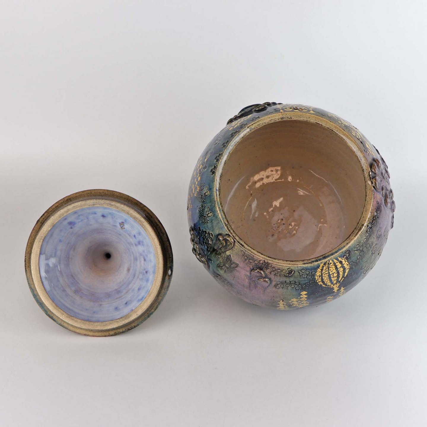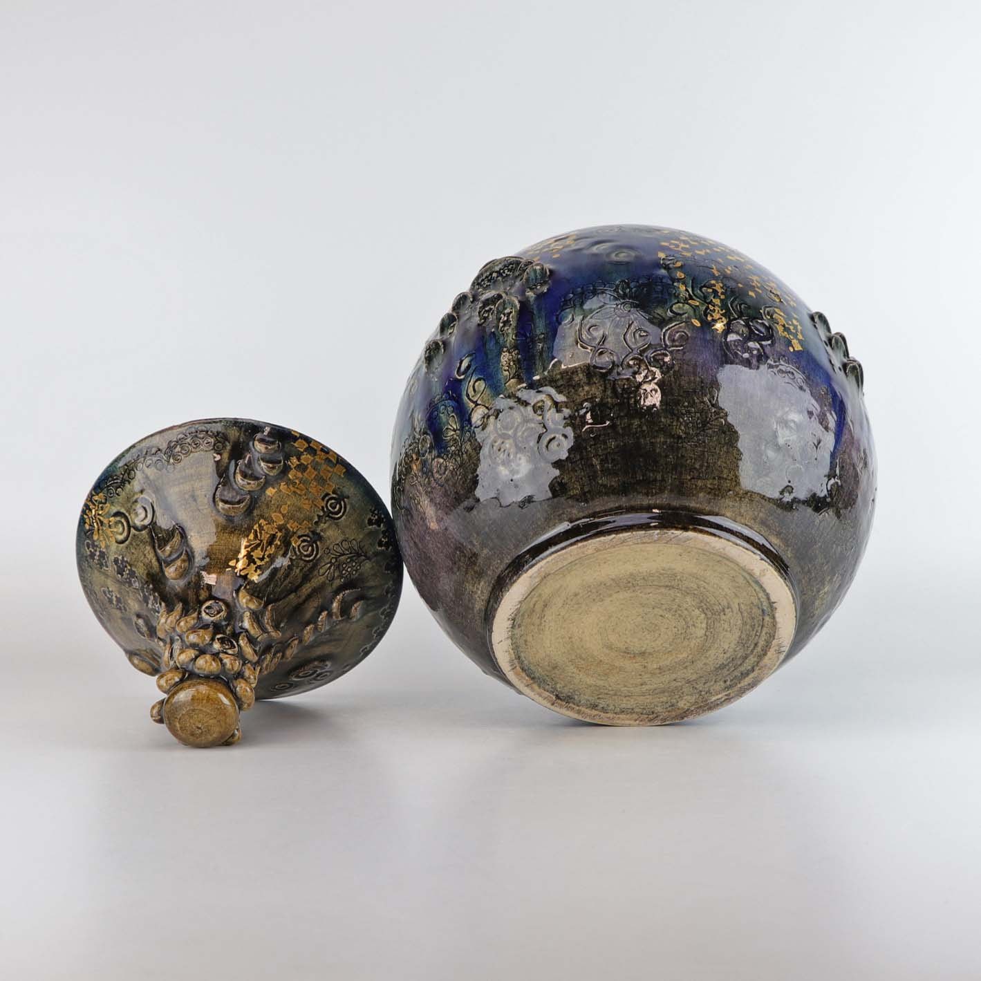 Stor lågkrukke i keramik med multifarvet glasur og dekoreret med forskellige abstrakte og naturmotiver.