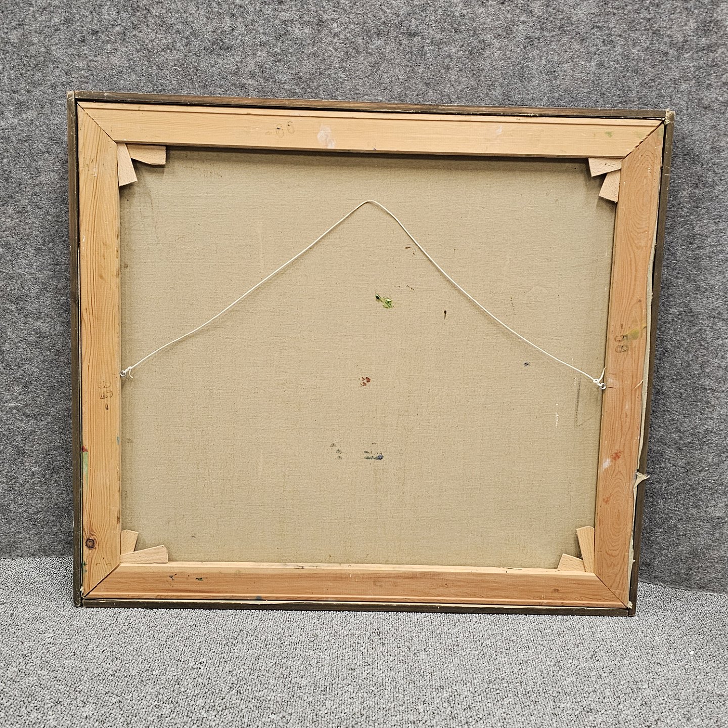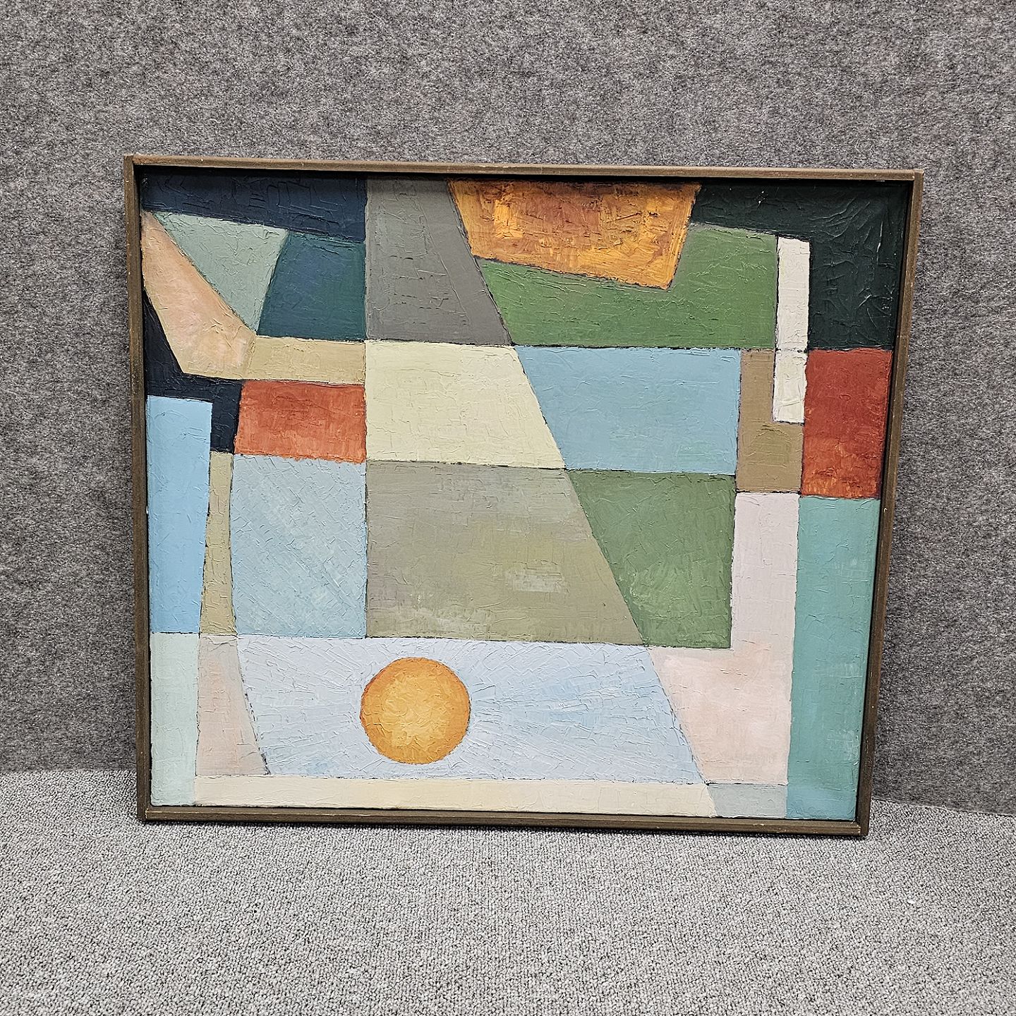 Oliemaleri i smal ramme, med motiv af geometriske former.