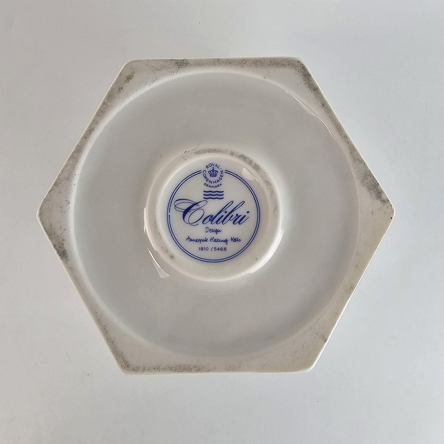 Sekskantet krukke med låg, med motiv af kolibrier og blade.