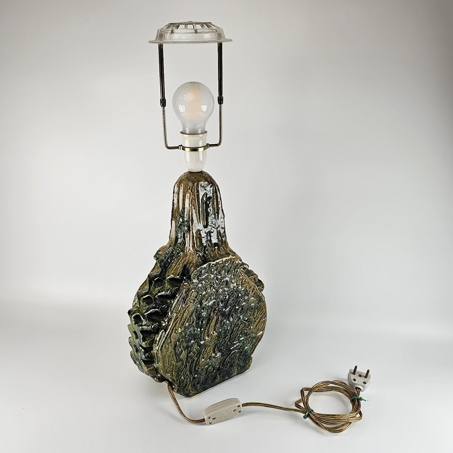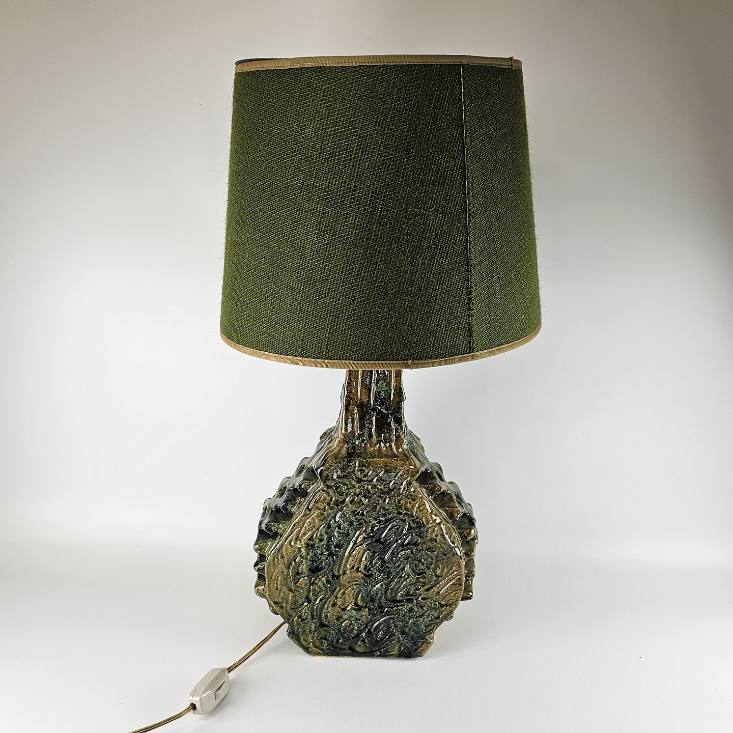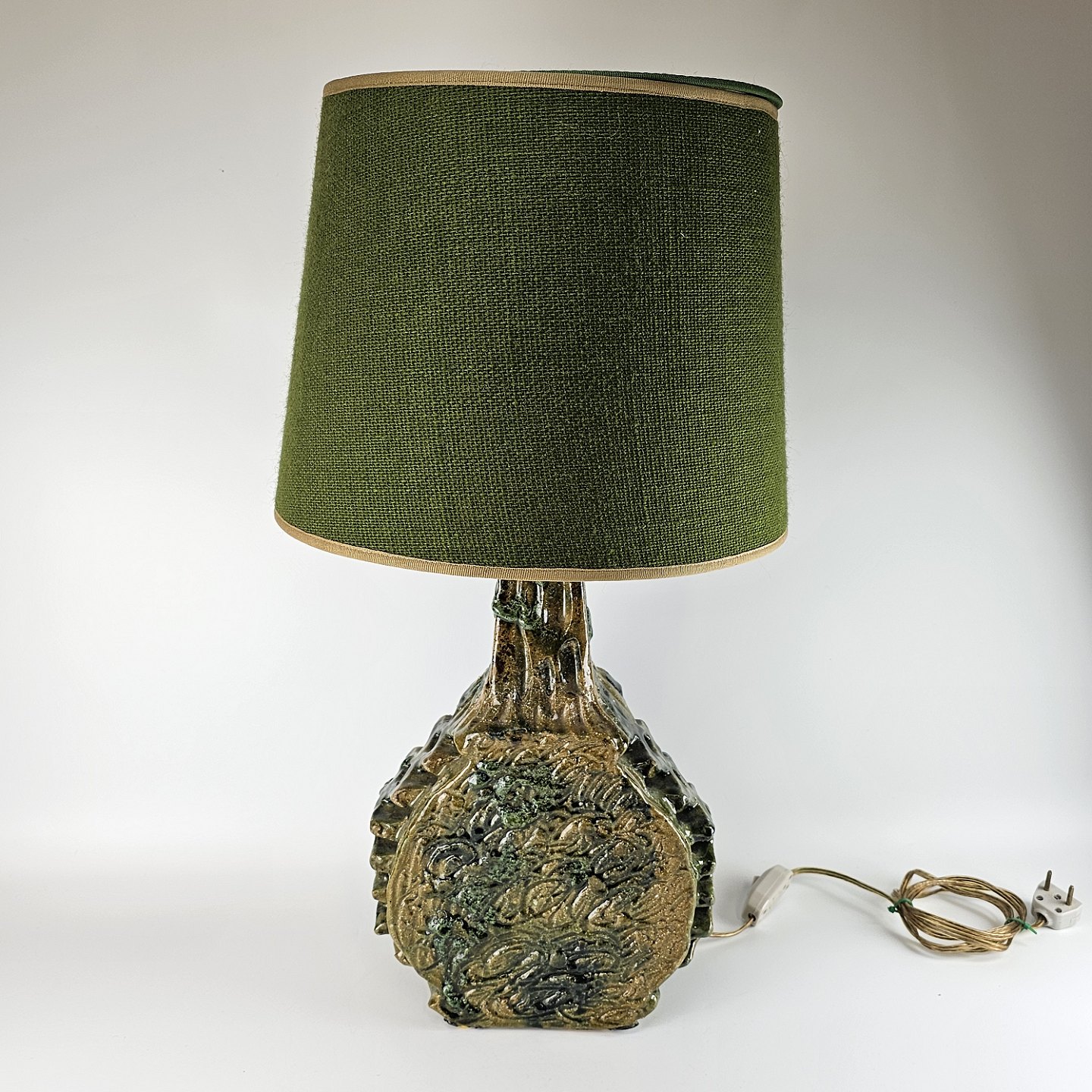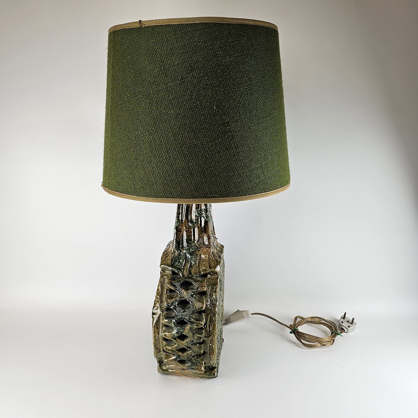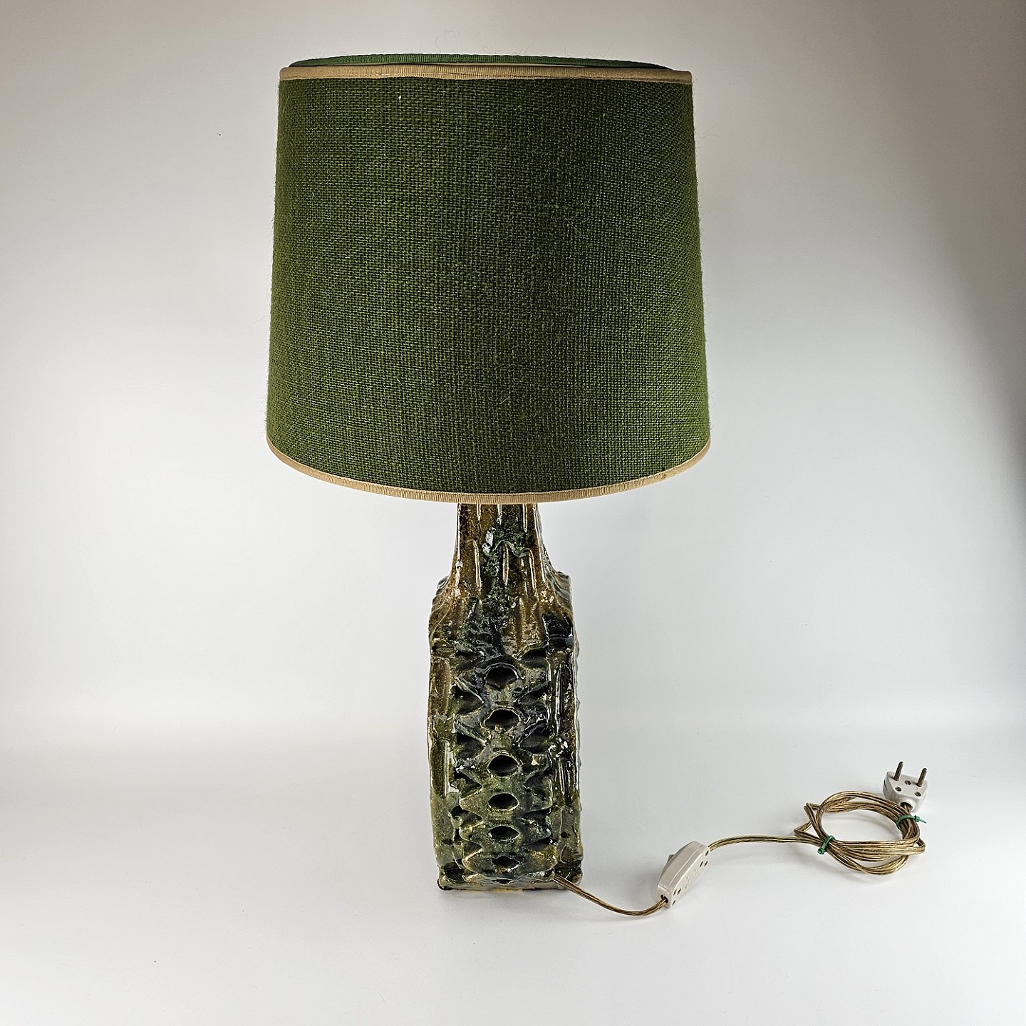 Bordlampe af keramik med grøn stofskærm.