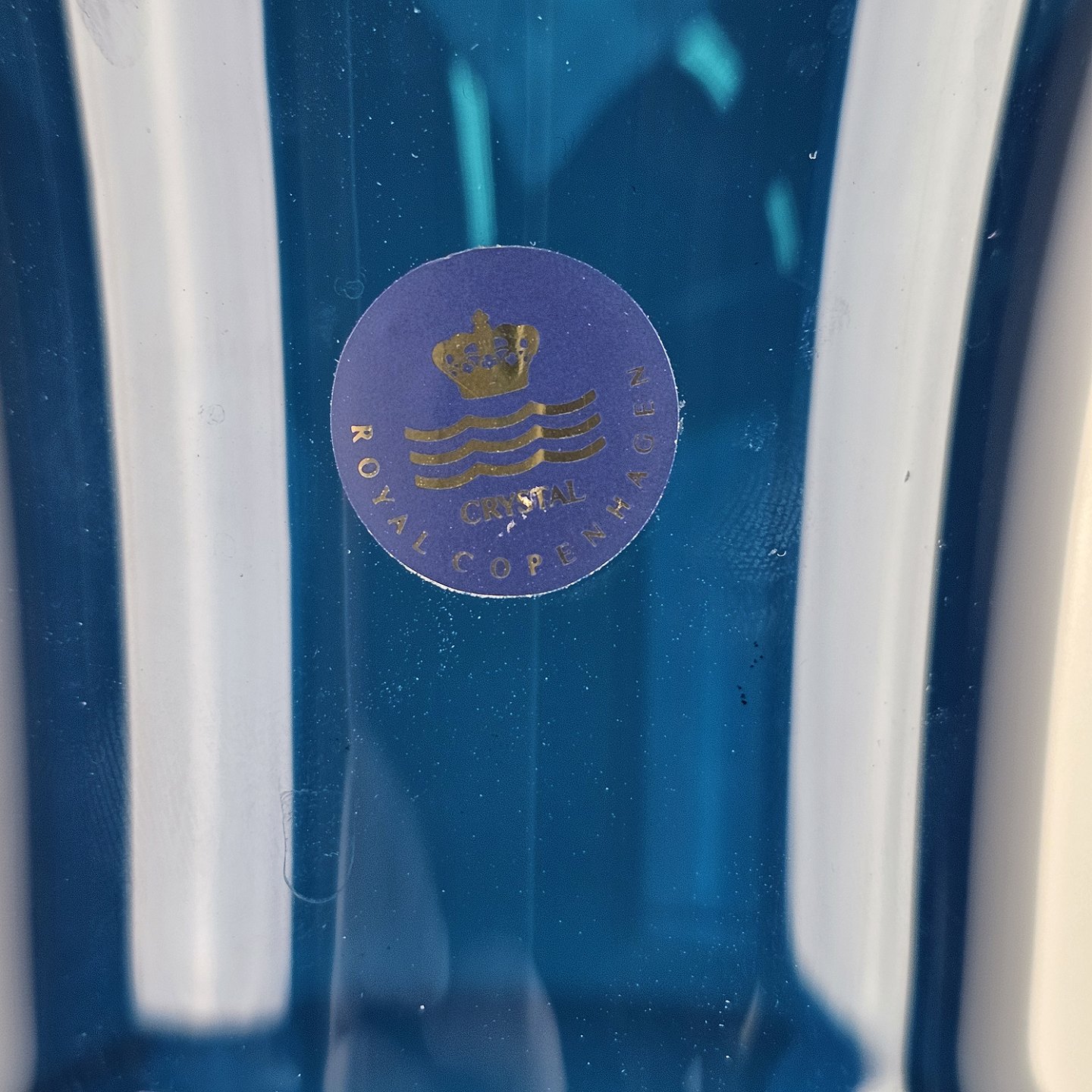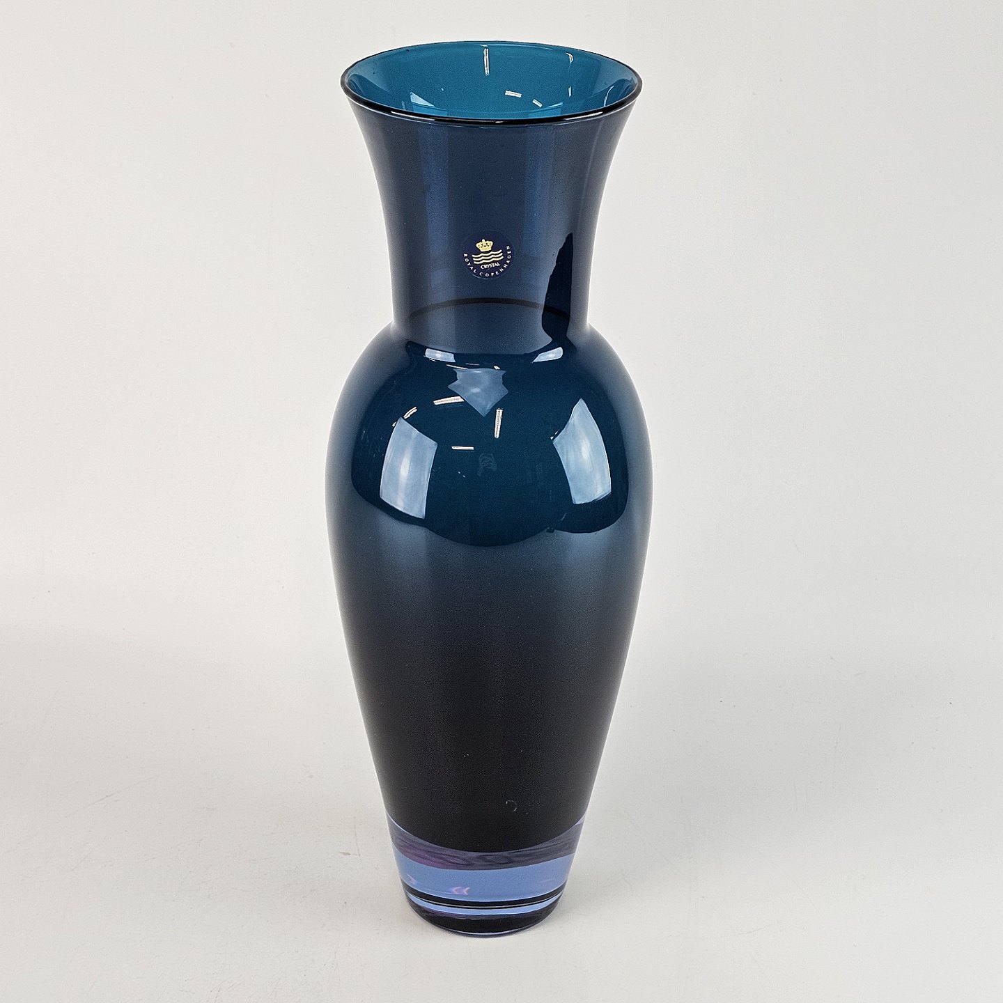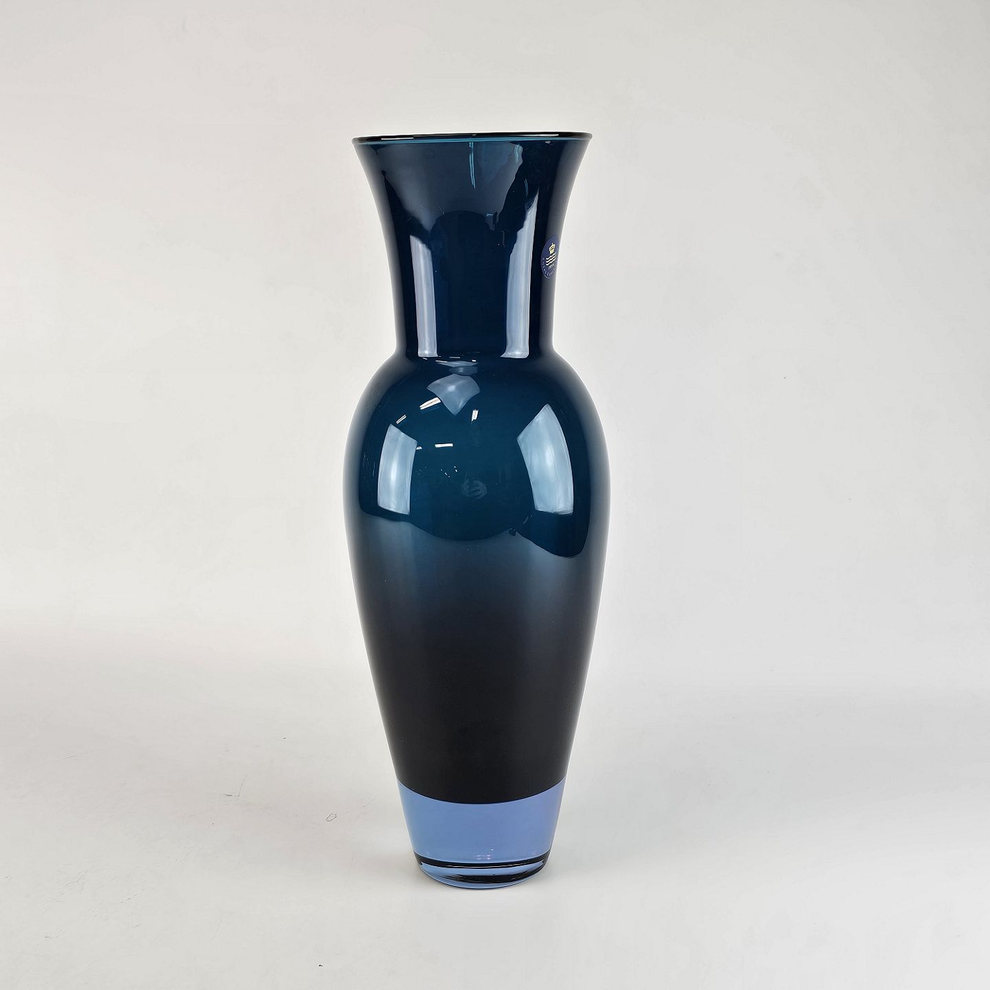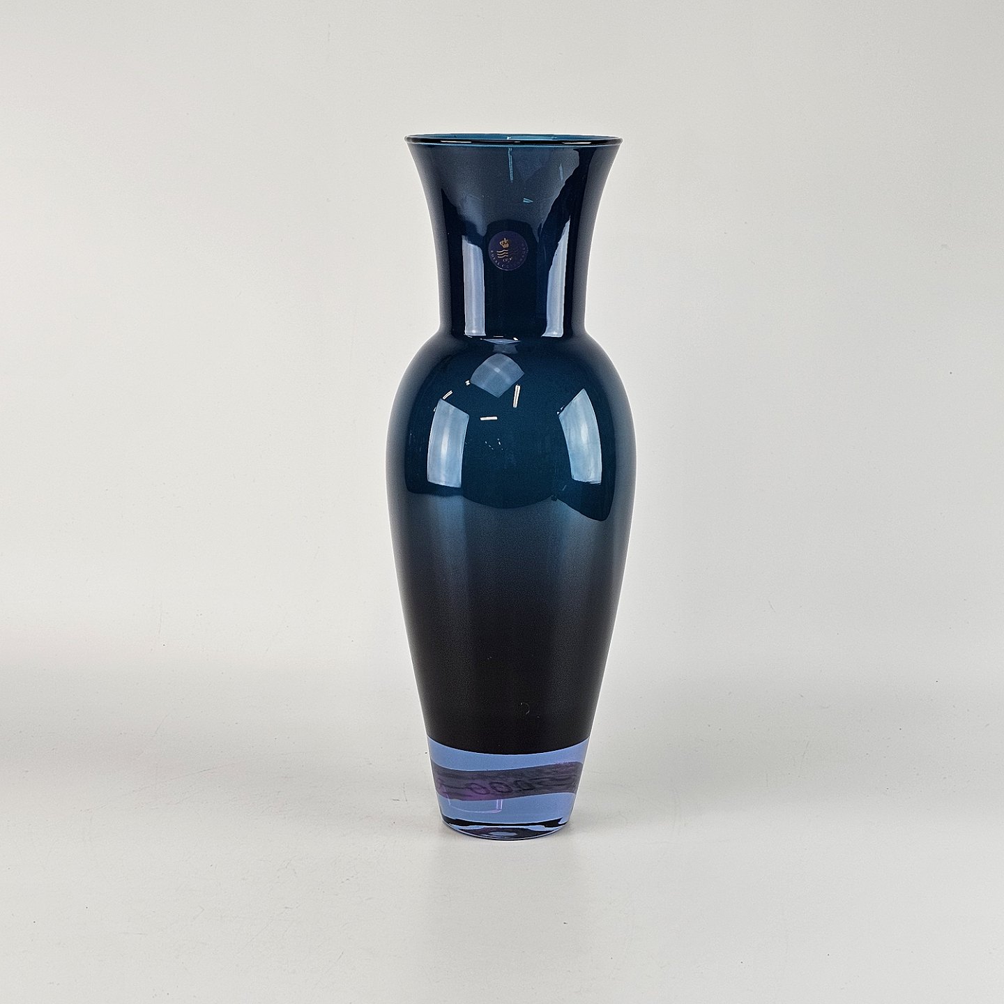 Harlekin vase i gennemsigtigt blåt glas med en sjov detalje med klart glas i bunden.