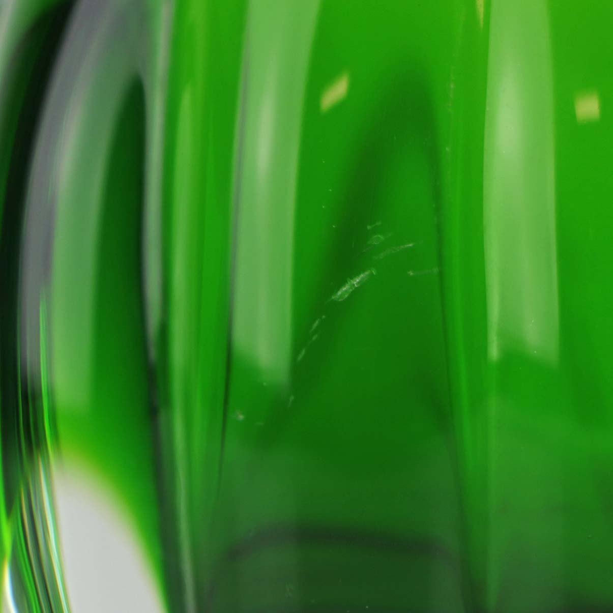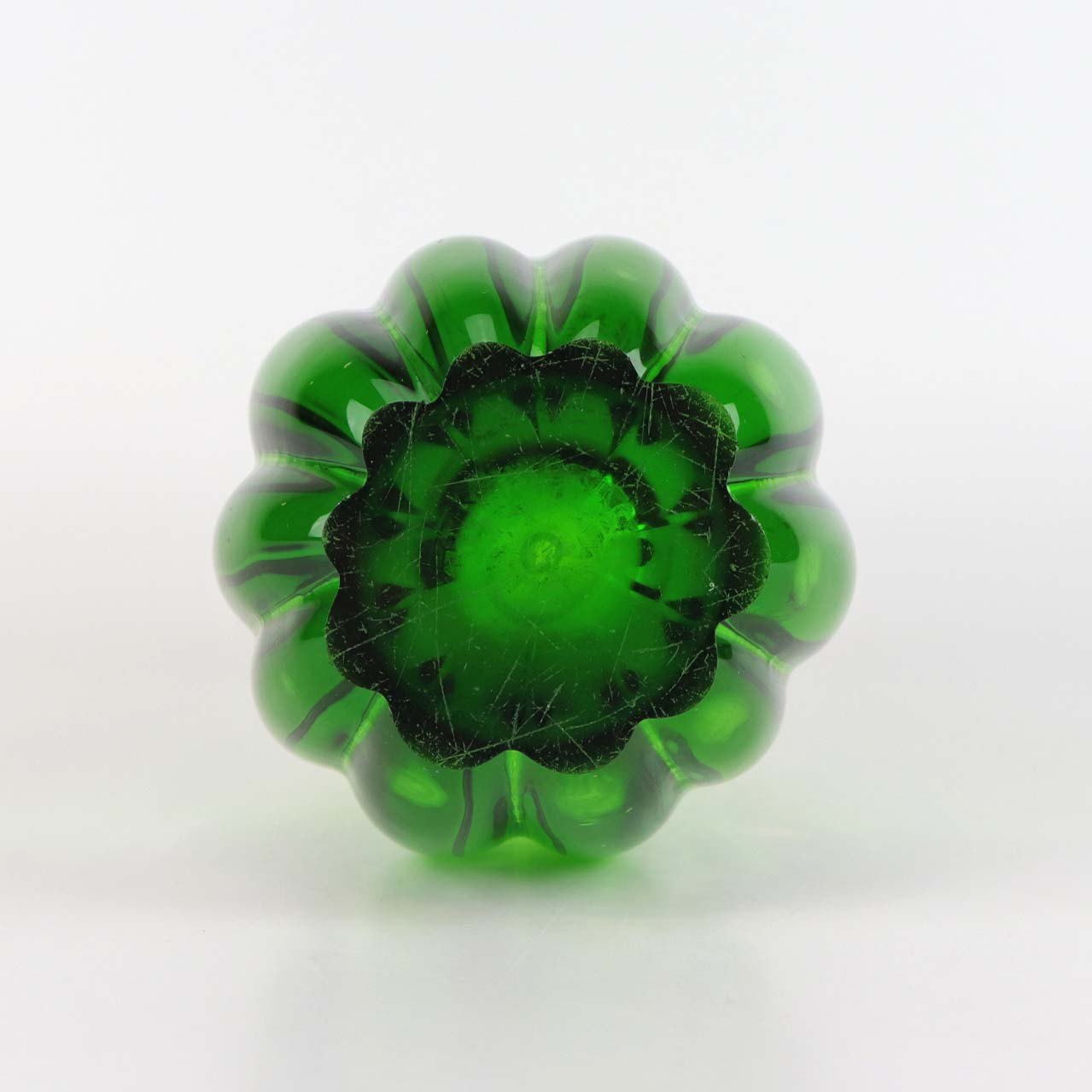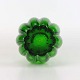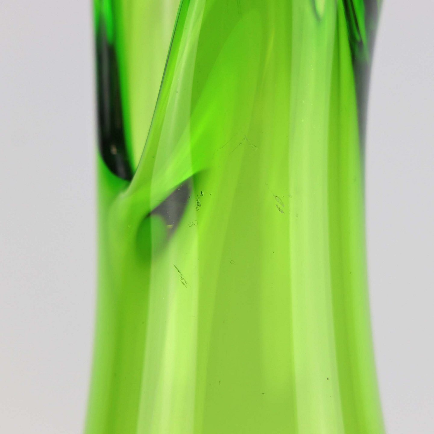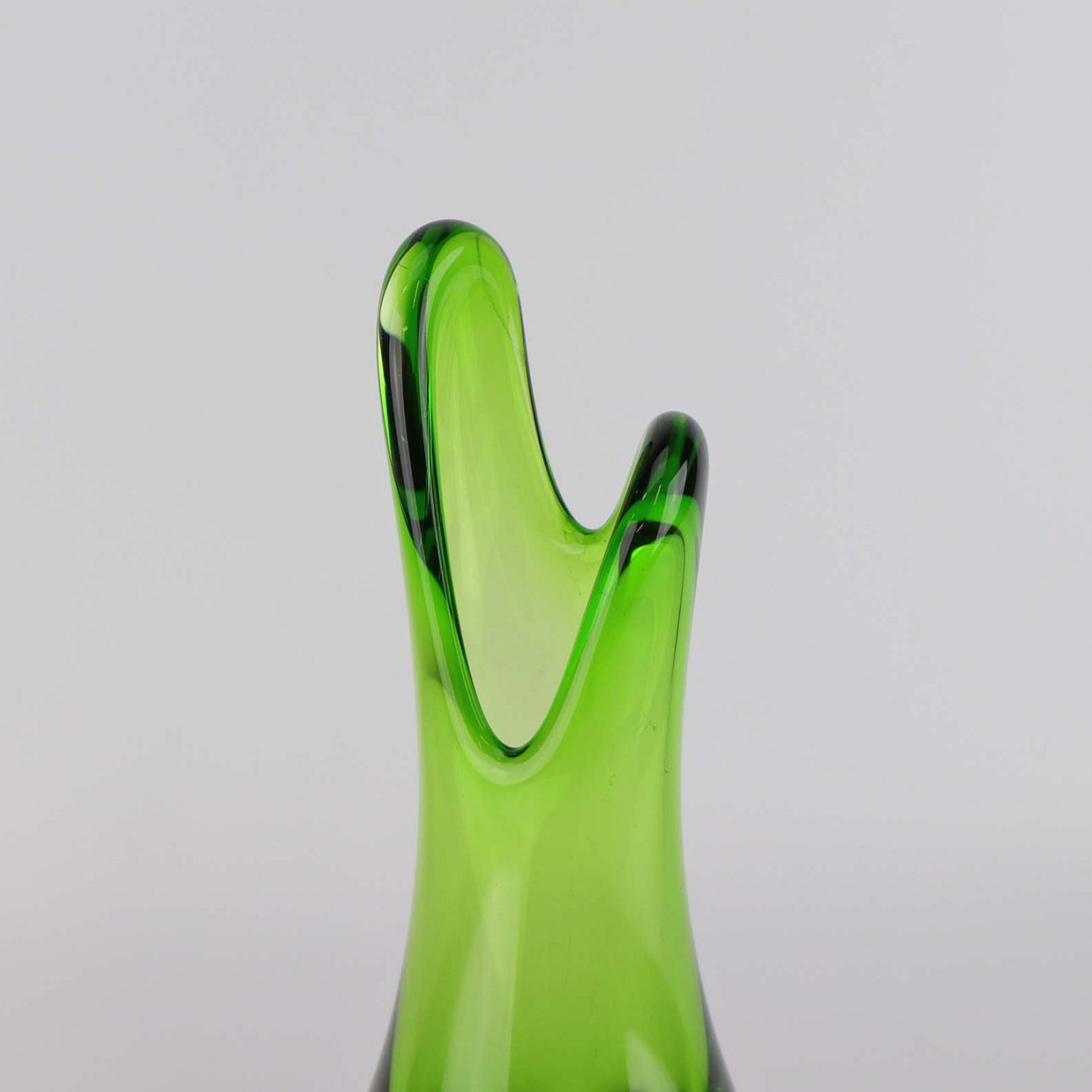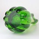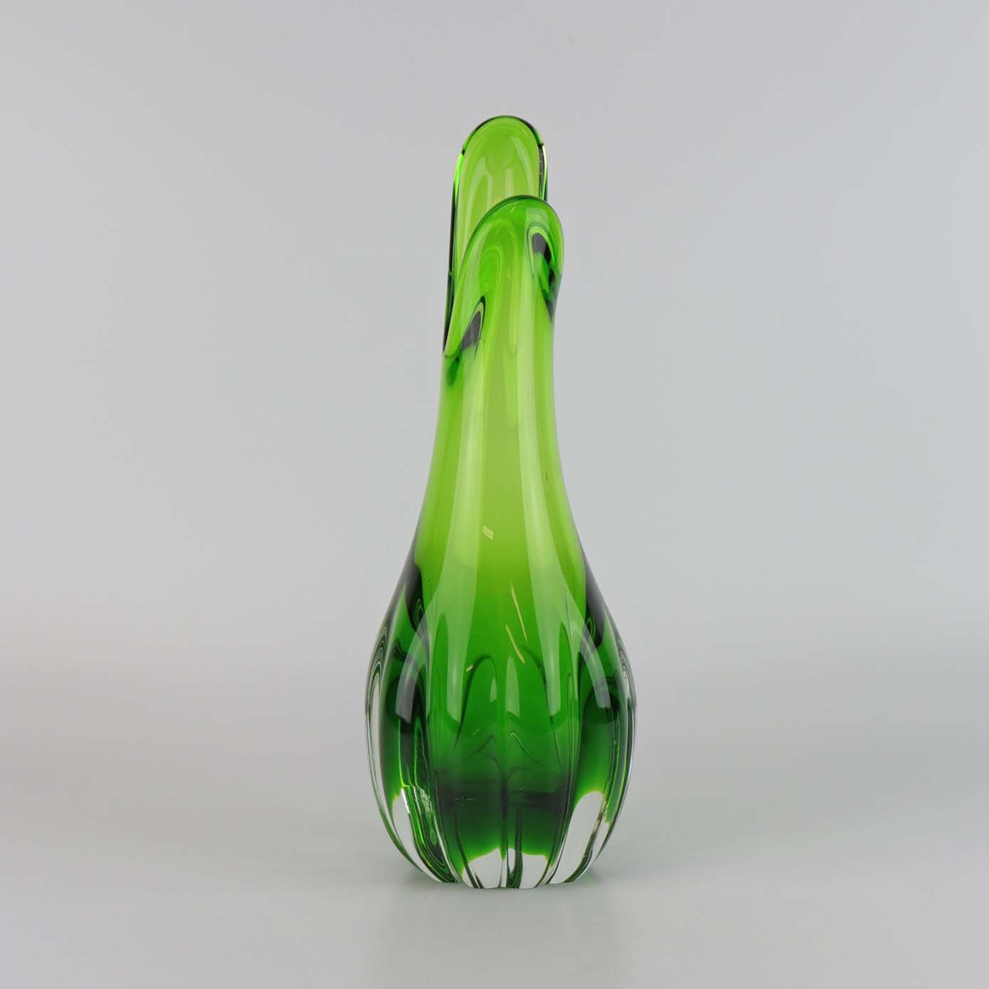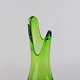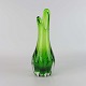 Næbvase i grønt glas med klart overlagsglas og rillet krop fra ca år 1956.
