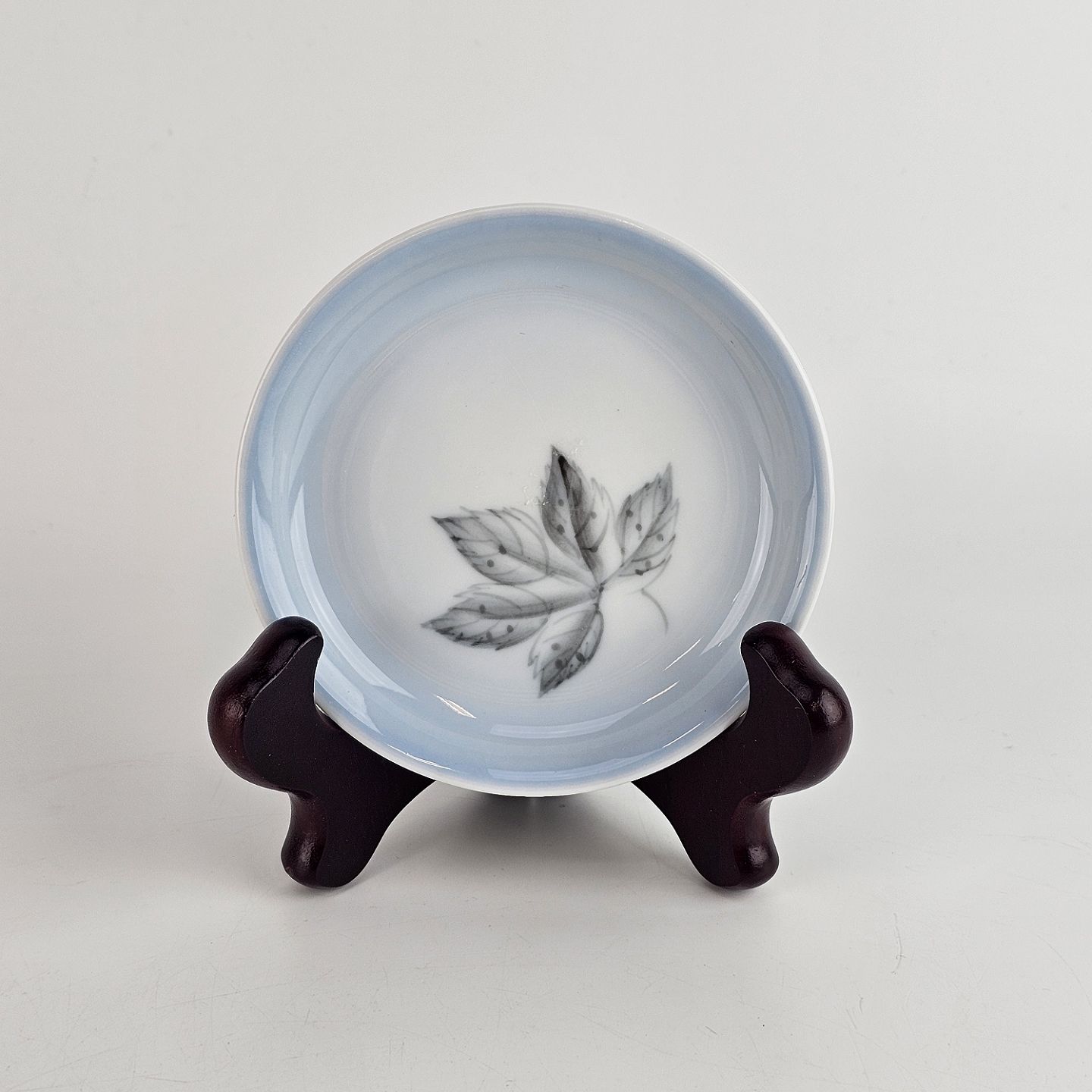Løvfald er hvidt porcelæn som toner ud i blå, dekoreret med faldende blade i sort og rødt.