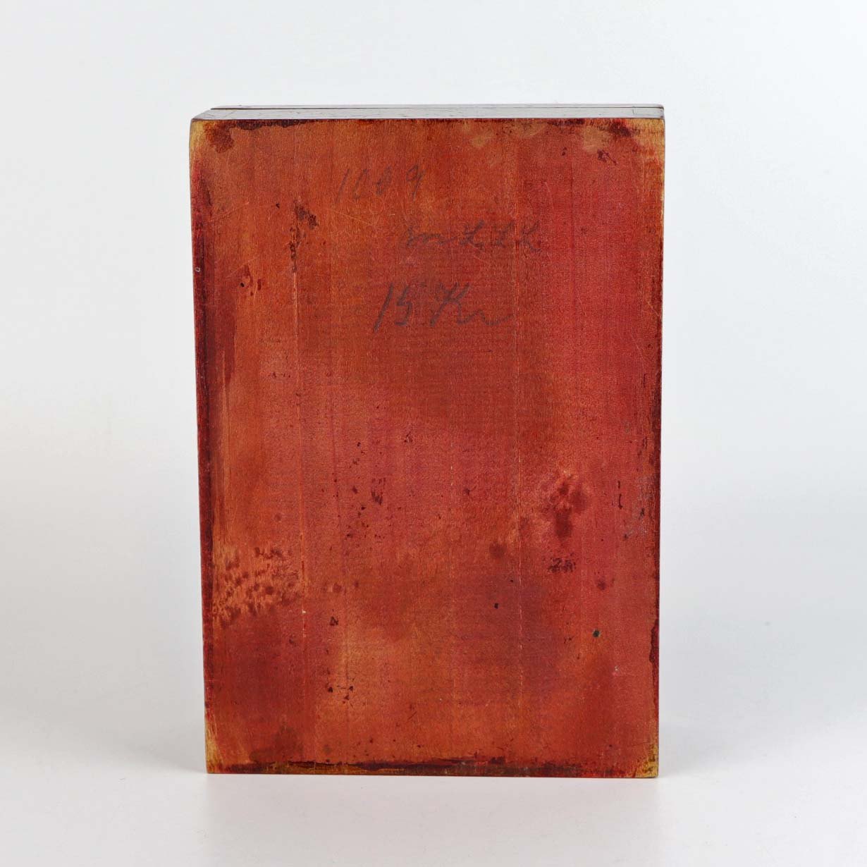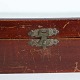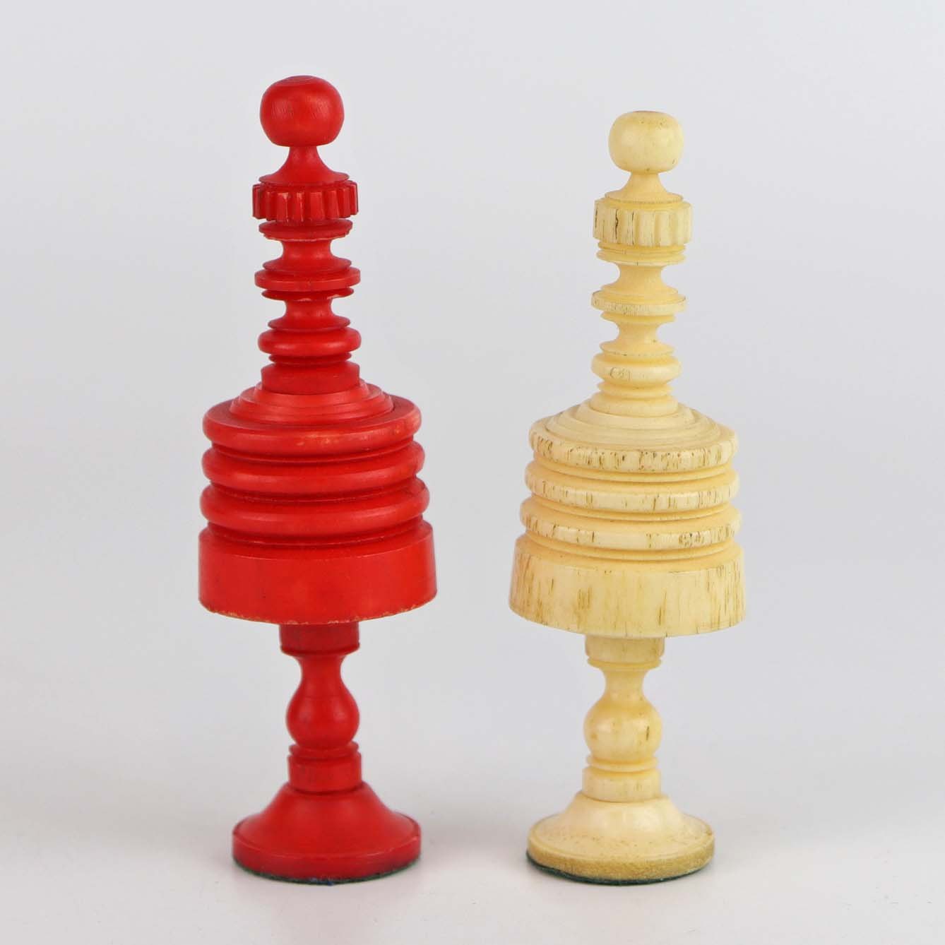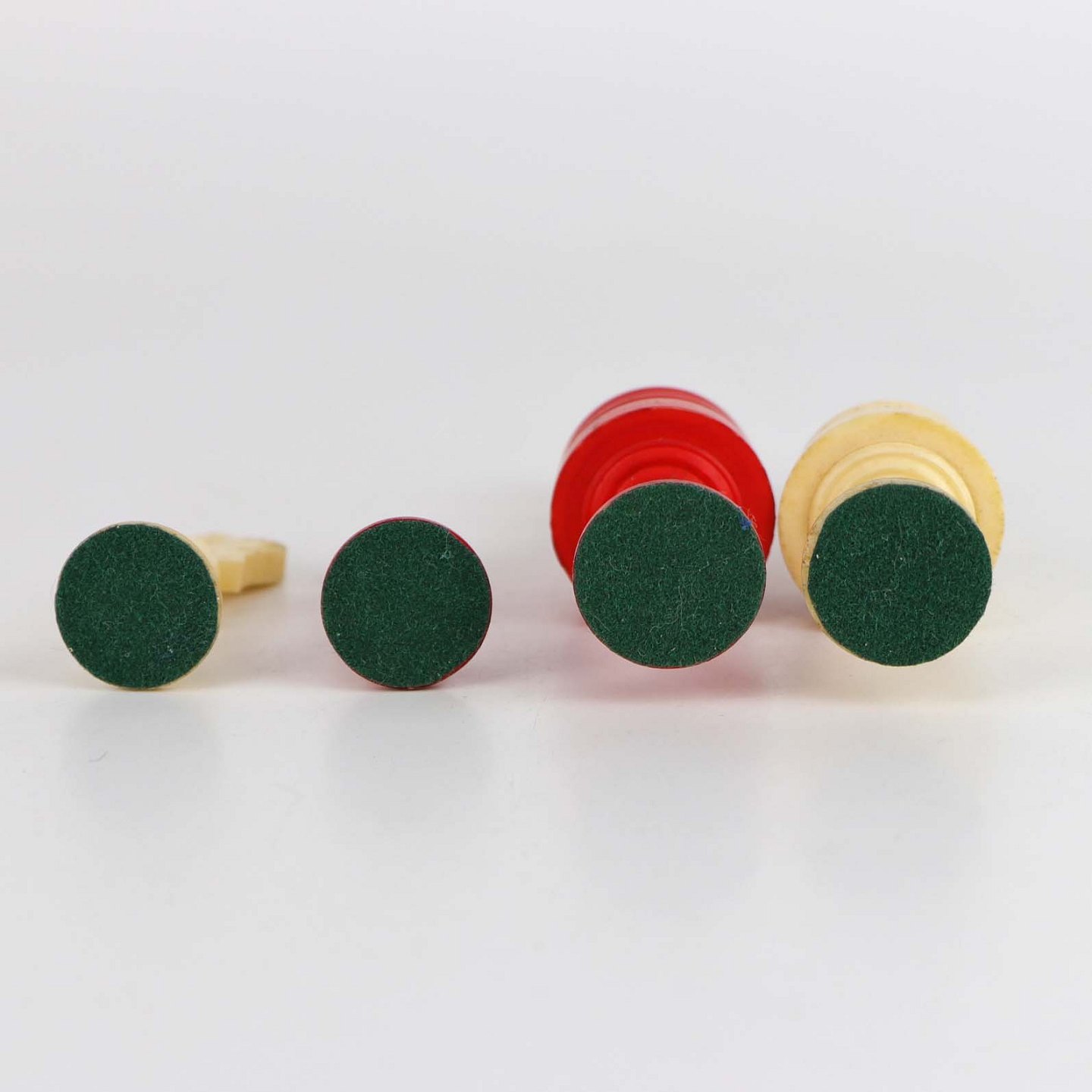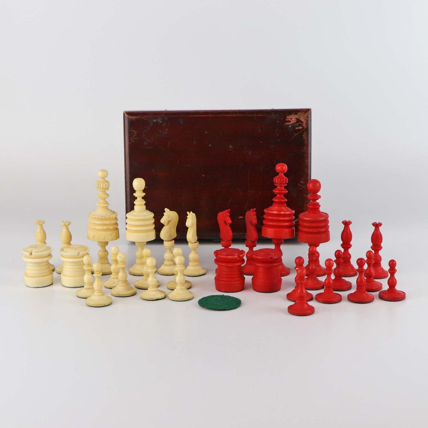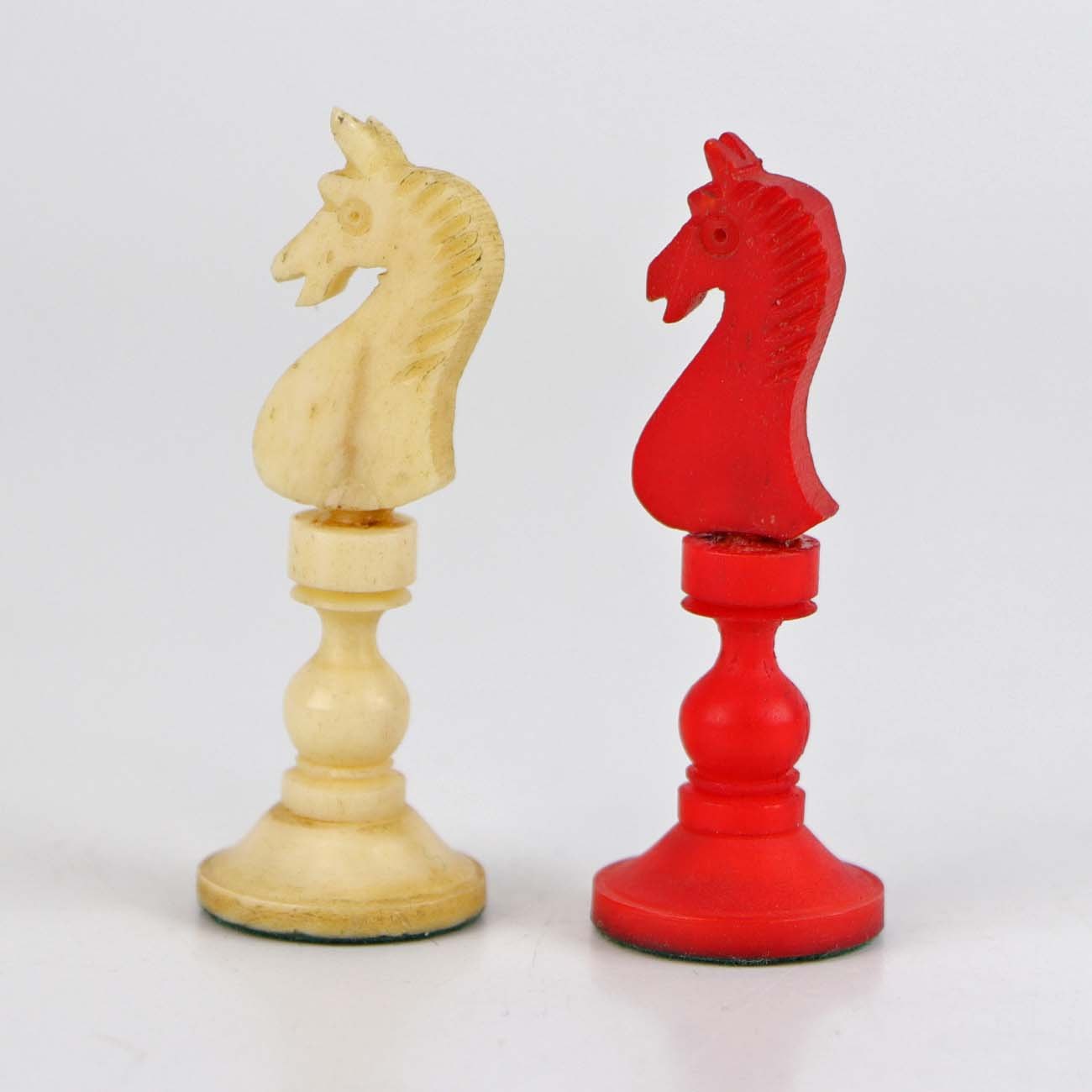 Ældre sæt røde og hvide skak brikker af ben med bund af grøn filt i ældre træboks. i alt 32 brikker.