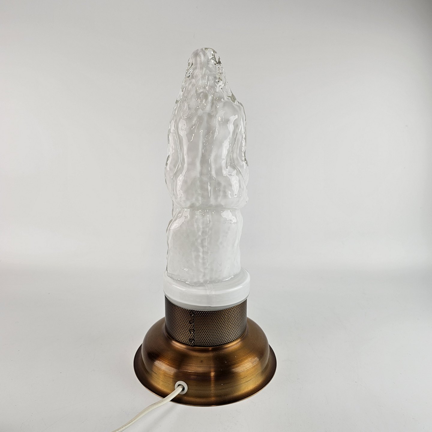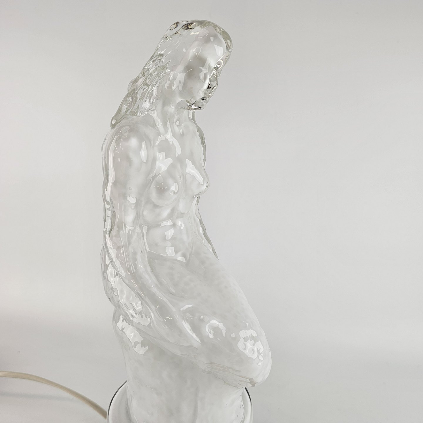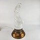 Lampe af hvidt opalglas med klart overfangsglas, med motiv af en havfrue siddende på en sten. Kaldt Sjöjungfru (havfrue).