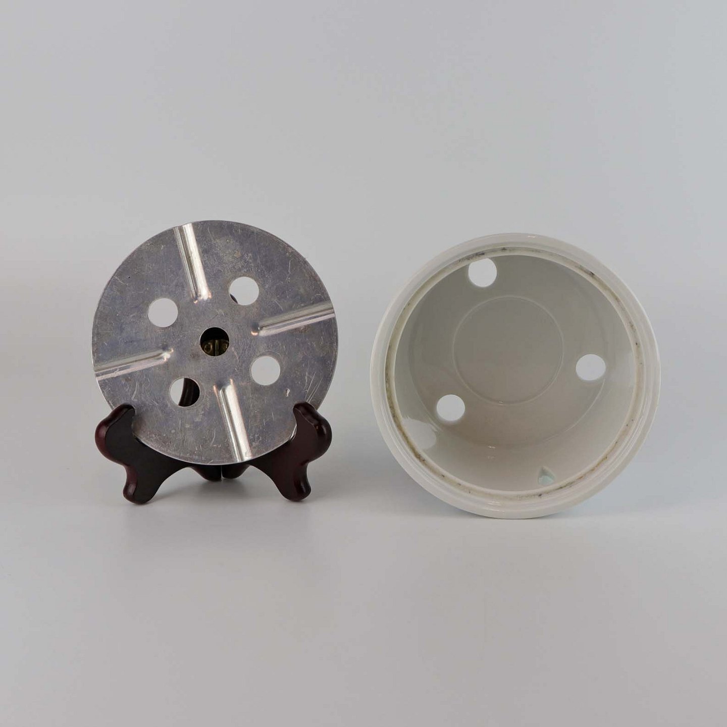 Tekande varmer i porcelæn og metal fra stellet Sommerfugl. Nr. 237
