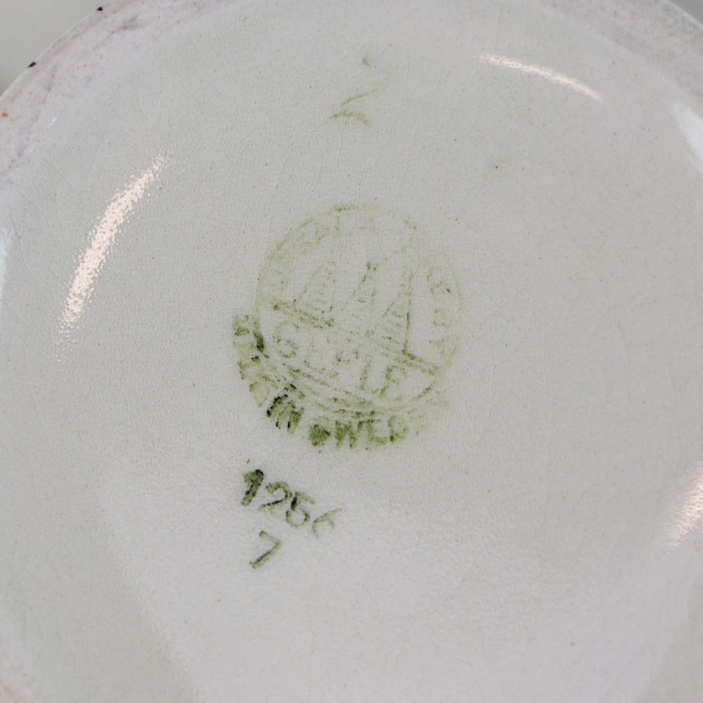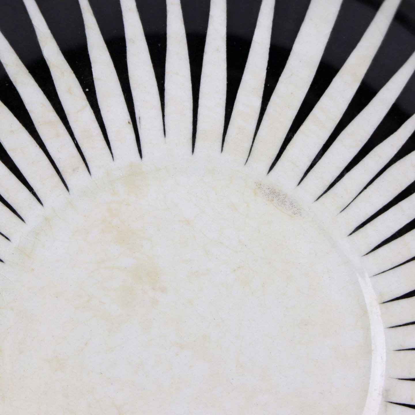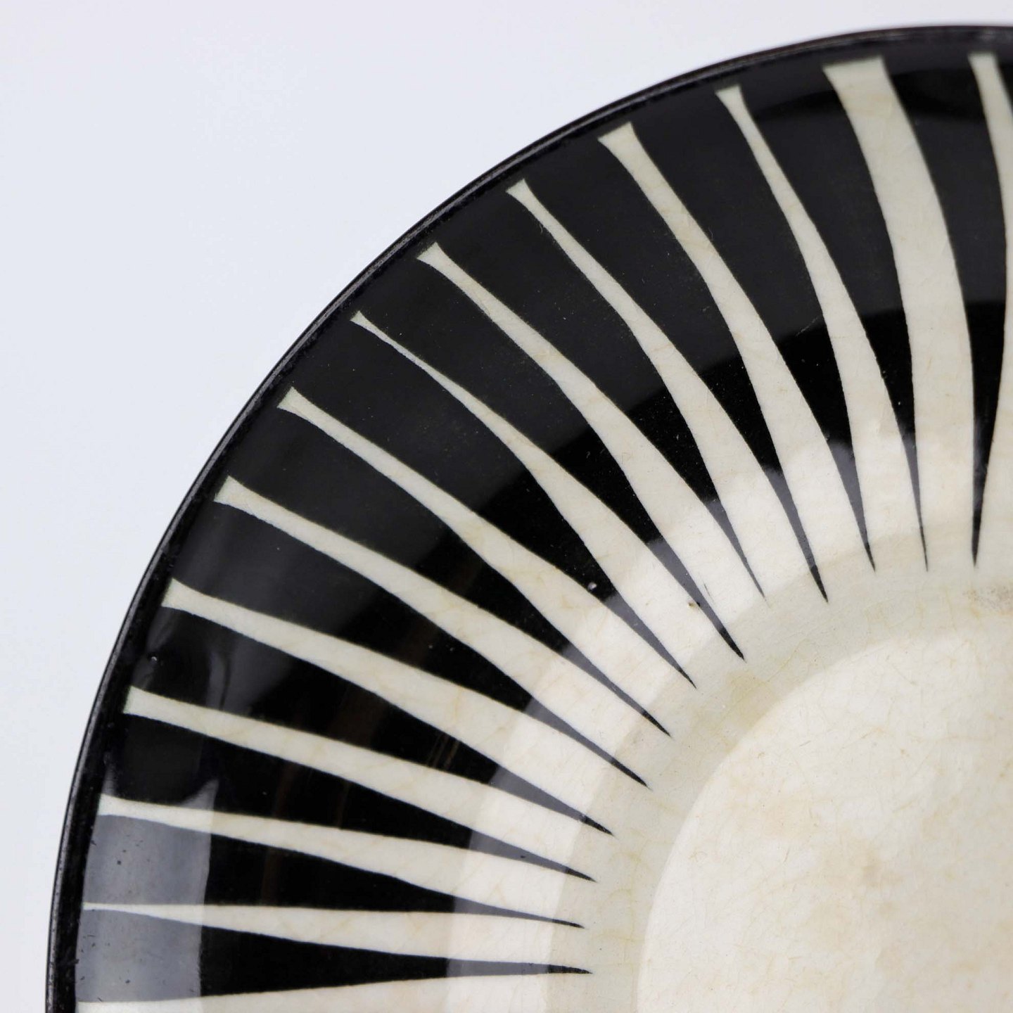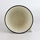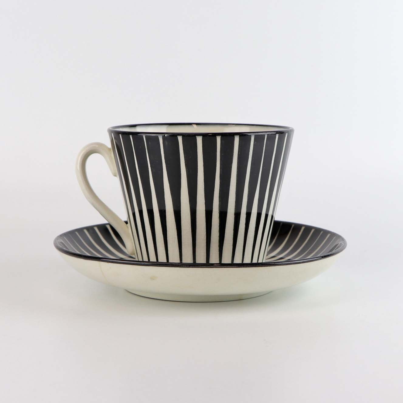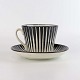 Håndmalet tekop eller chokoladekop med underkop i fajance fra stellet Zebra med mønster i sorte og hvide striber. Nr. 1256/7 og 1256/32