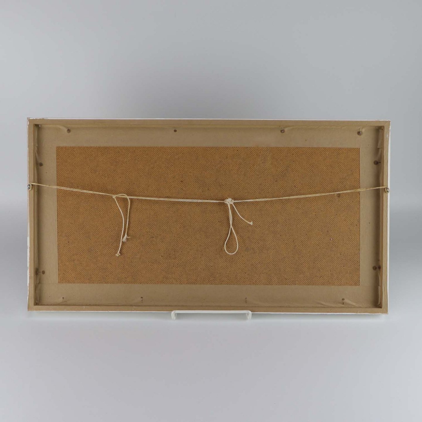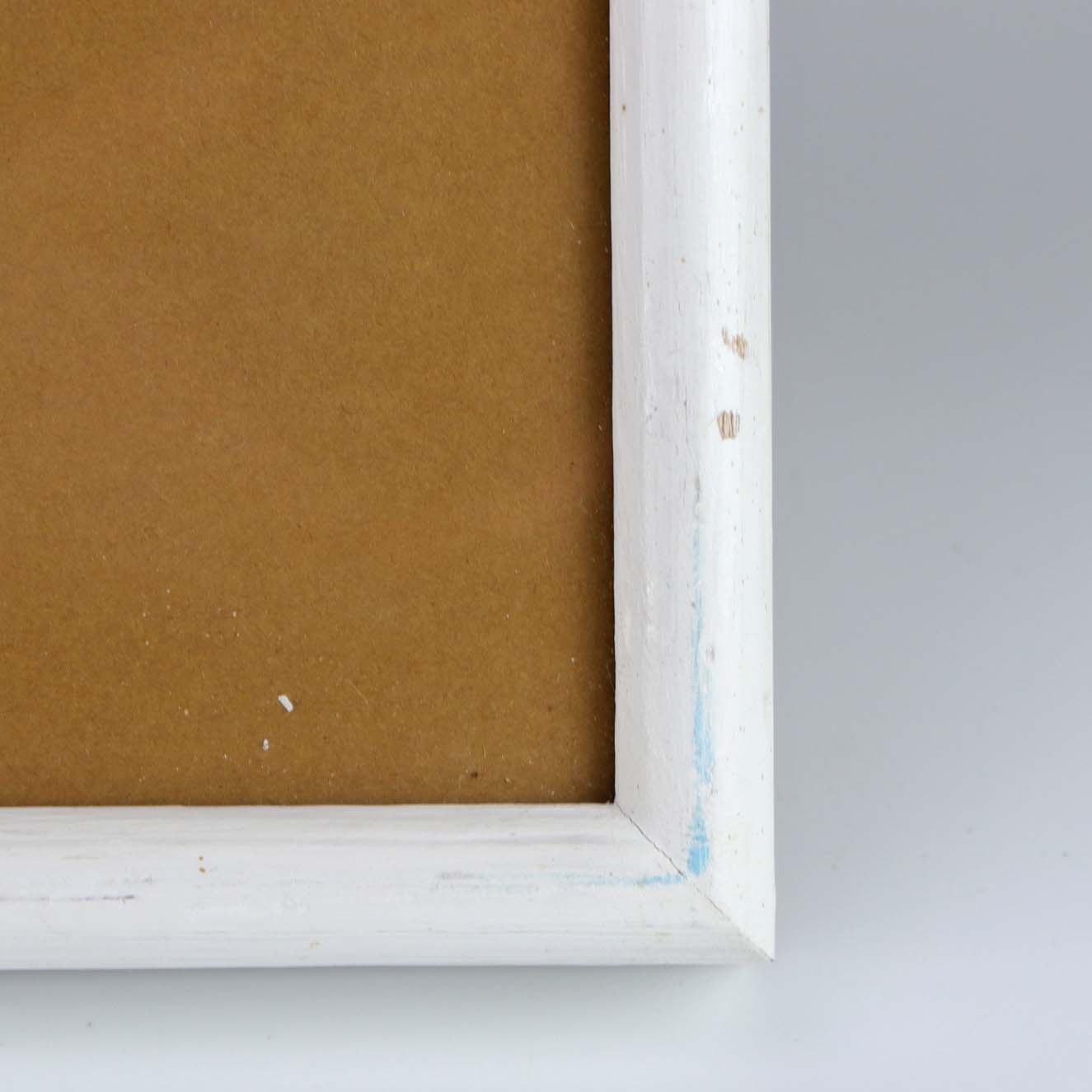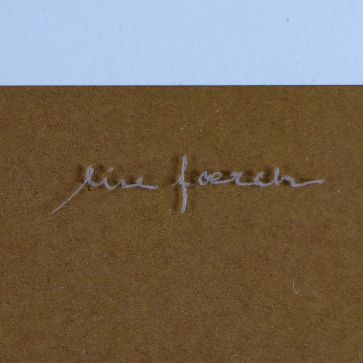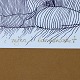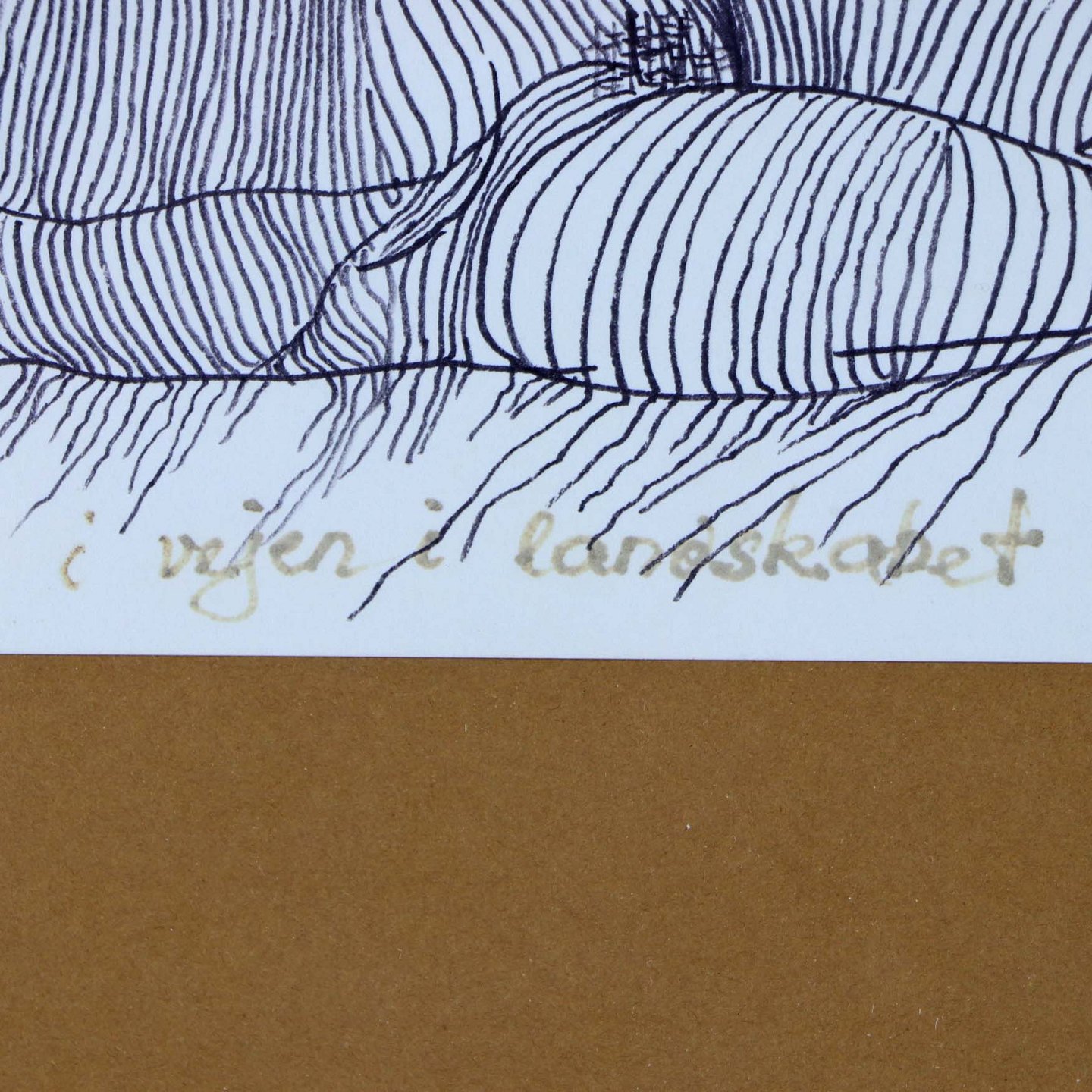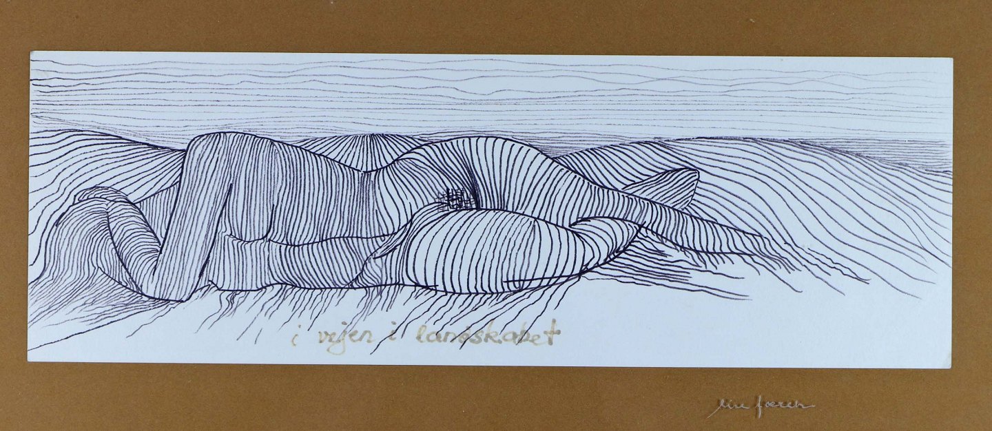 Indrammet tegning med sort pen på papir i hvidmalet træramme med nøgenmotiv af kvinde liggende i bakket landskab med titlen I vejen i landskabet.