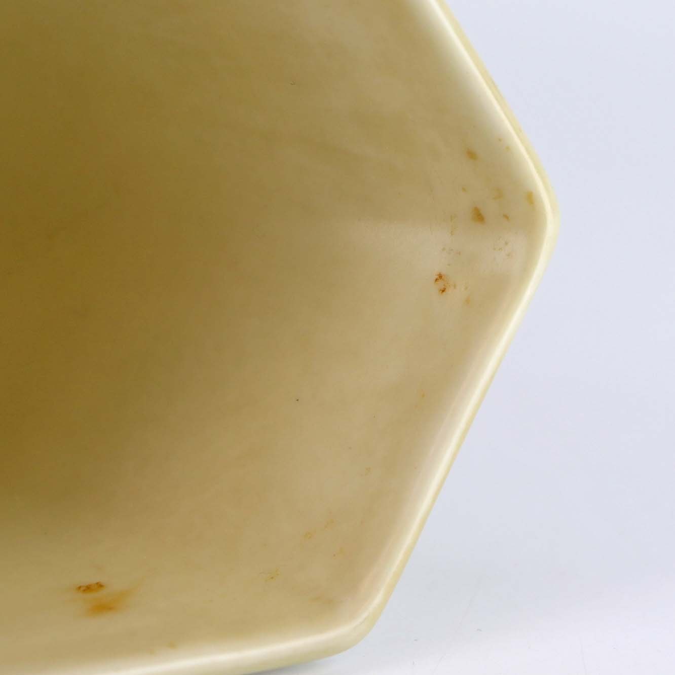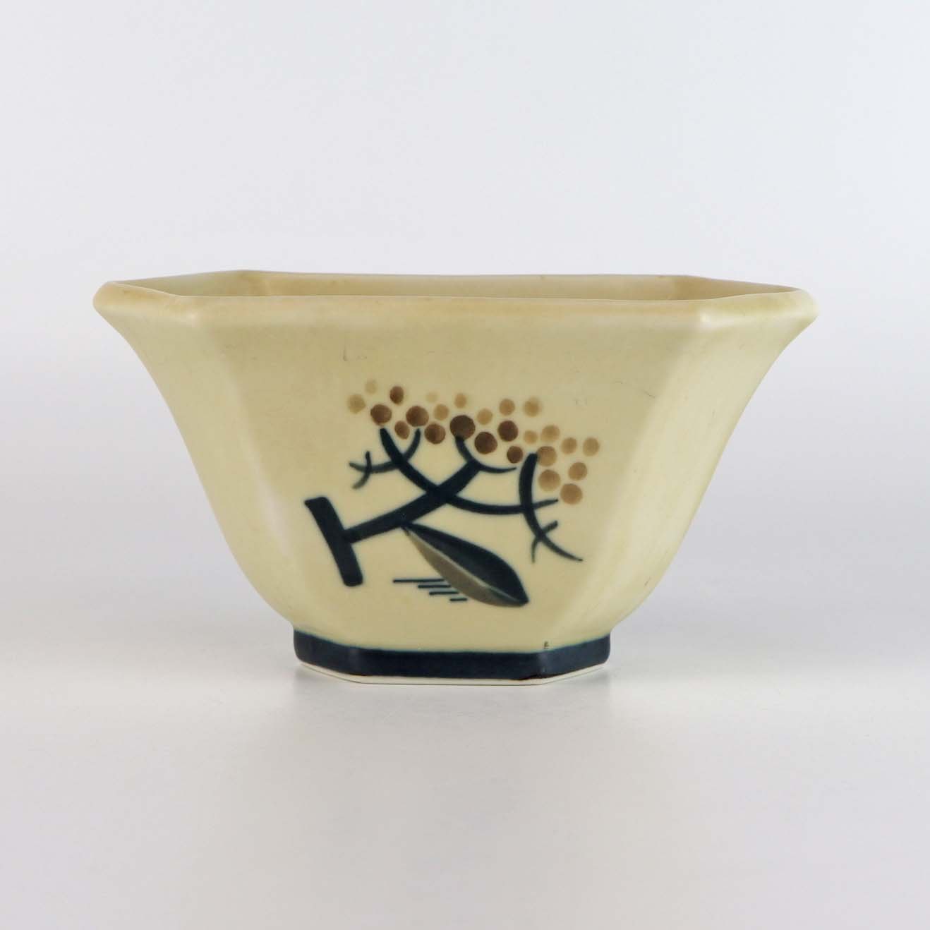 Kongelig sekskantet vase i mat porcelæn med motiv af blomster med blå streg på cremefarvet baggrund. Nr. 28/6