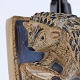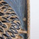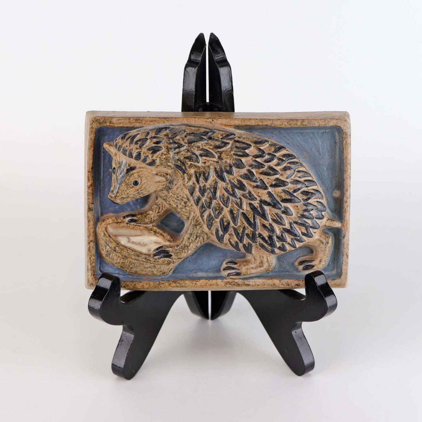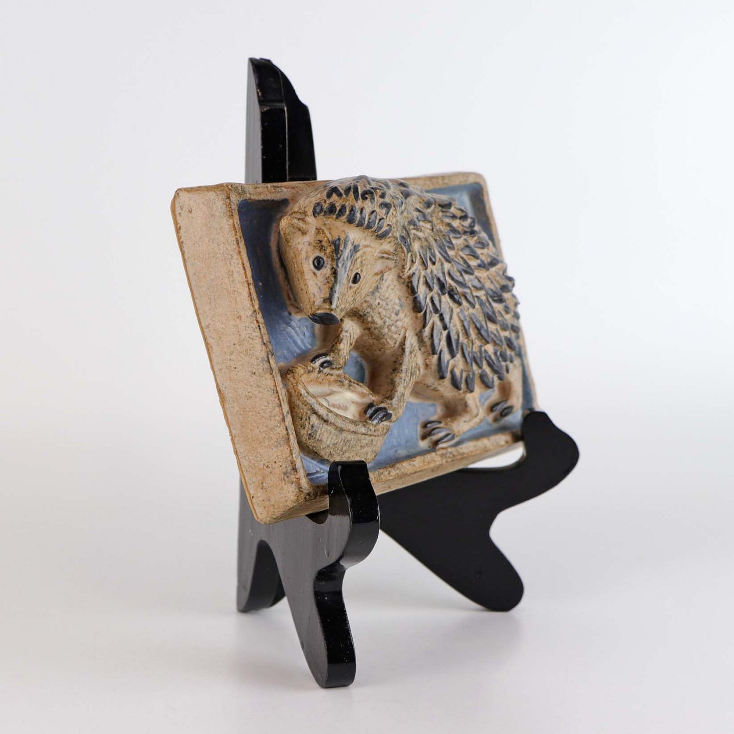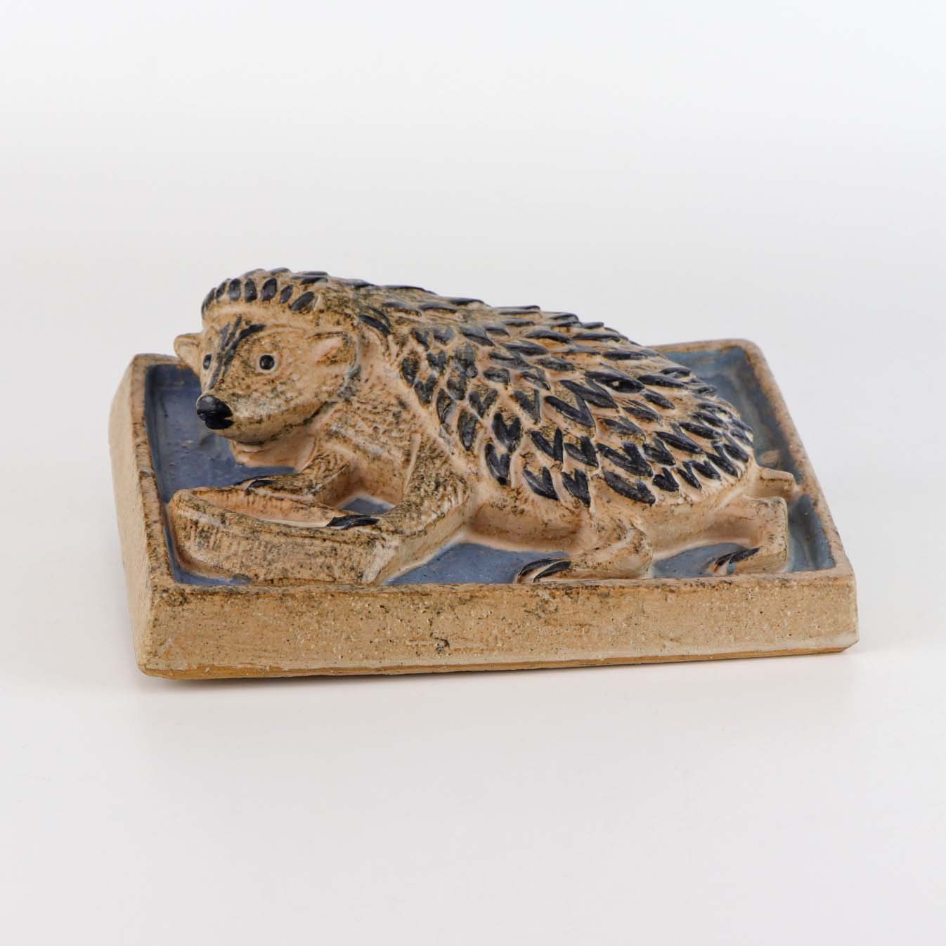 Relief i glaseret keramik med motiv af pindsvin ved drikkeskål på blå baggrund.