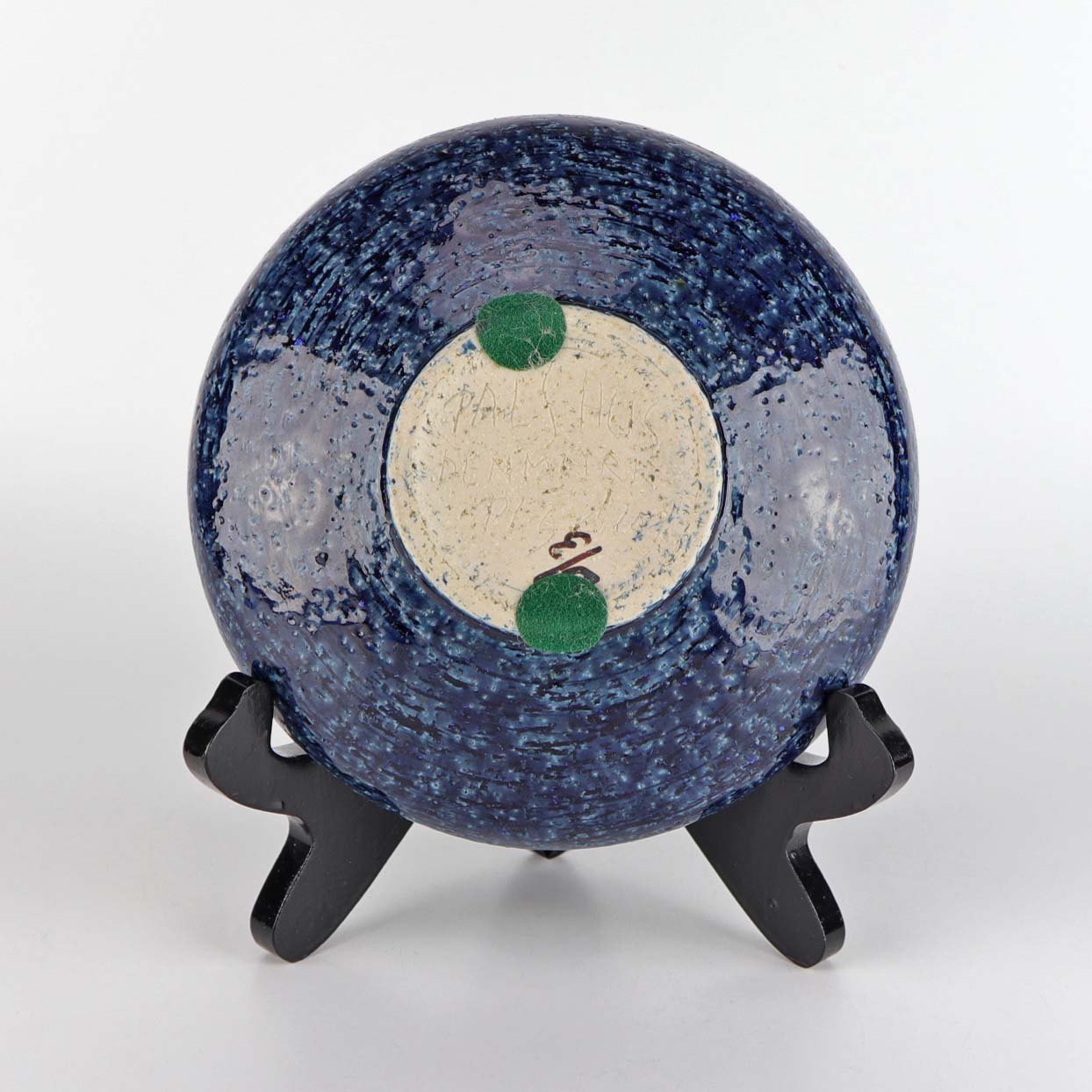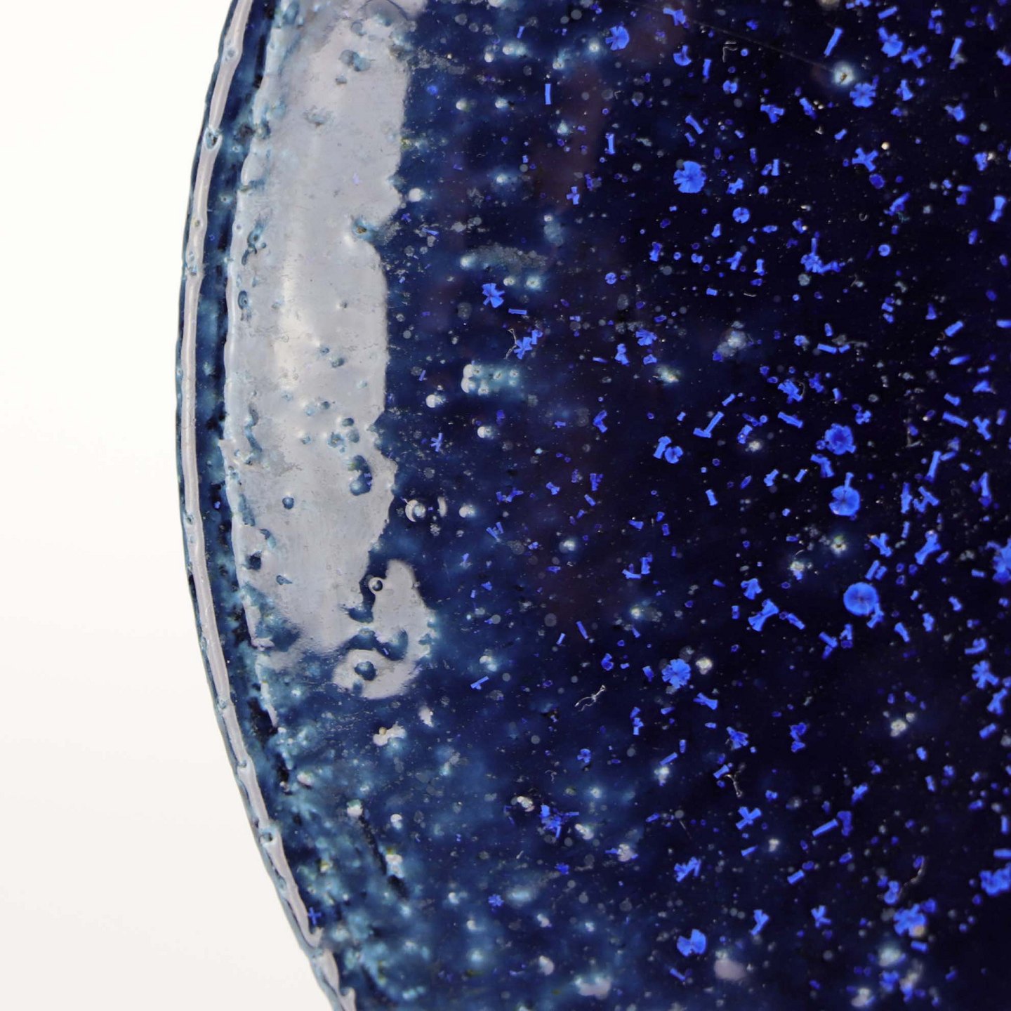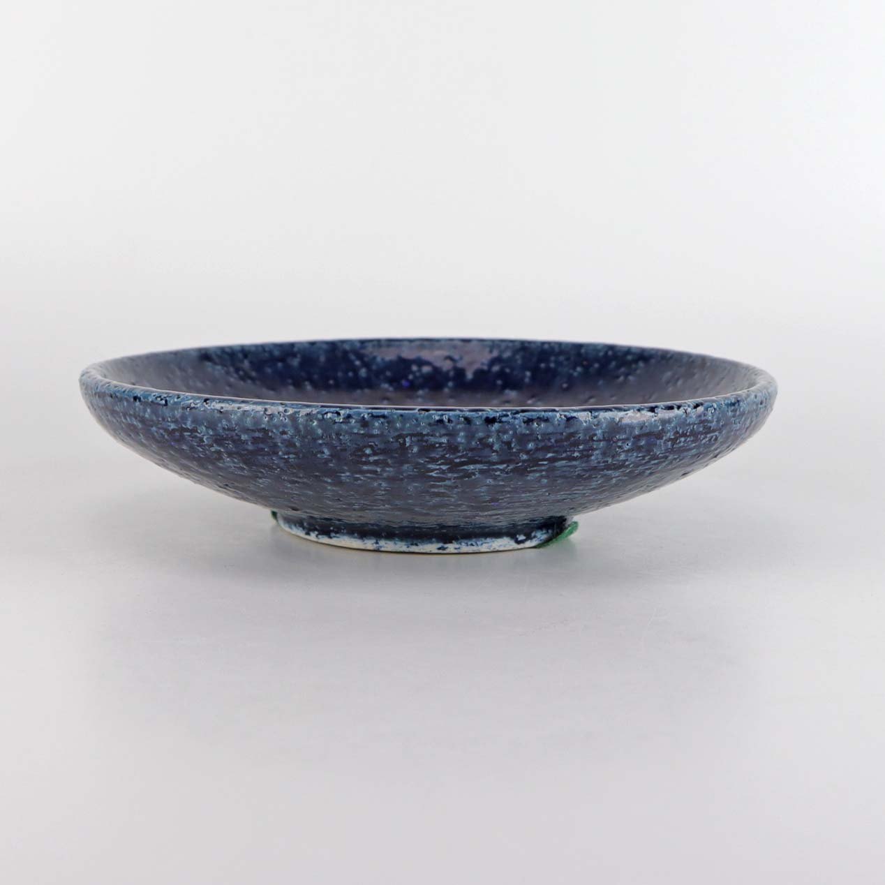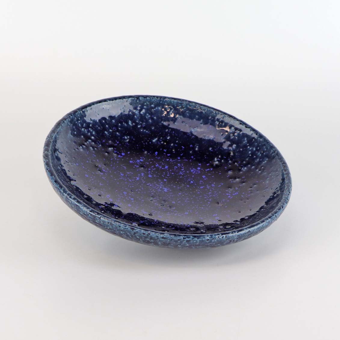 Mindre rund skål i stentøj med glasur i blå nuancer. Skålen er fremstillet i et nubret design. Nr. 1102