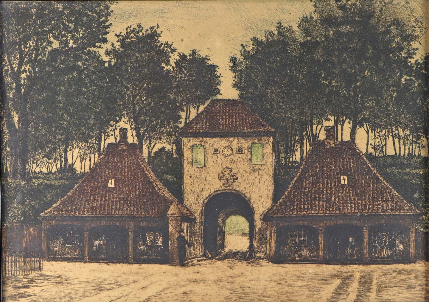 Indrammet farvelagt radering i sortmalet træramme med motiv af Sjællandsporten til Kastellet.