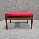 Fodskammel med stel i teaktræ og løs hynde med rødt stof betræk.