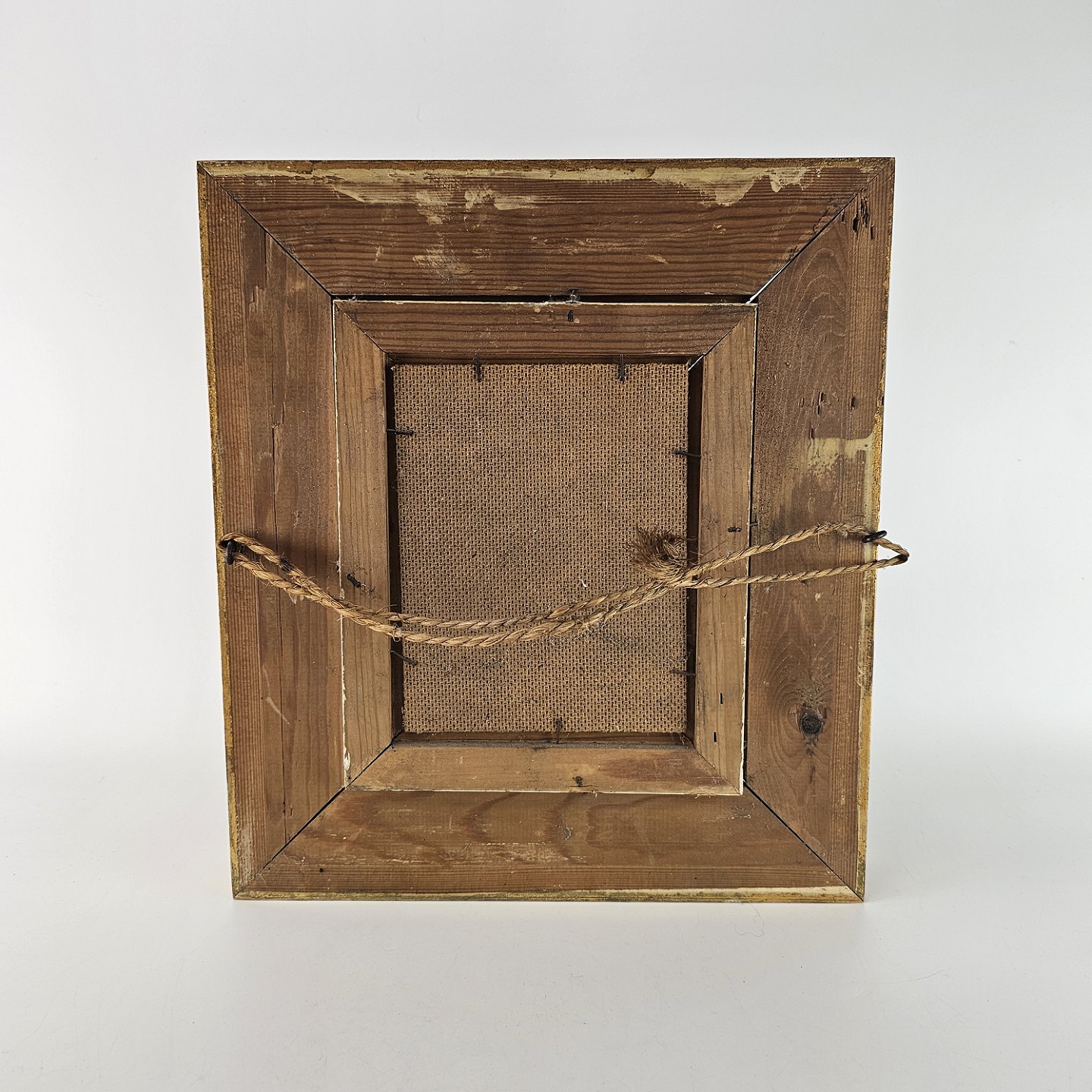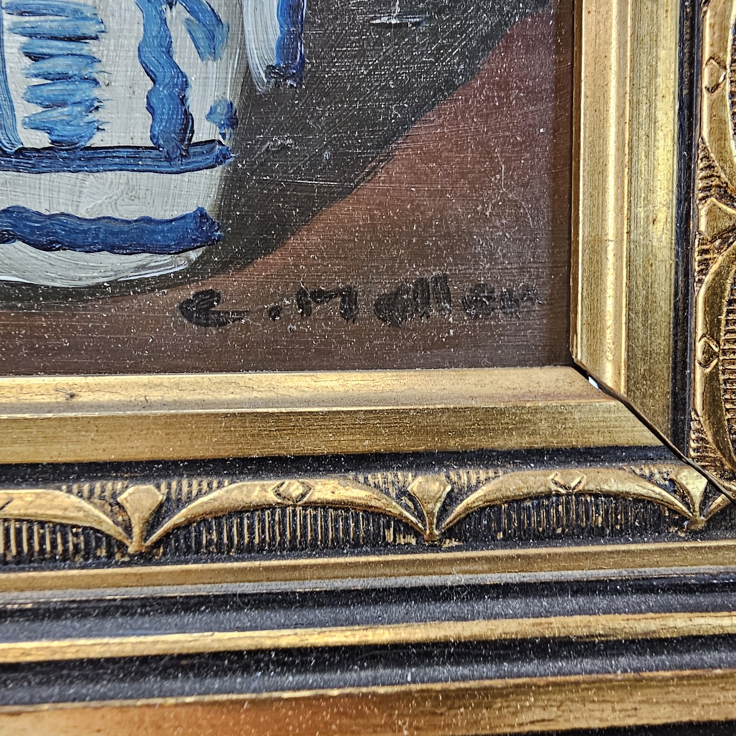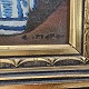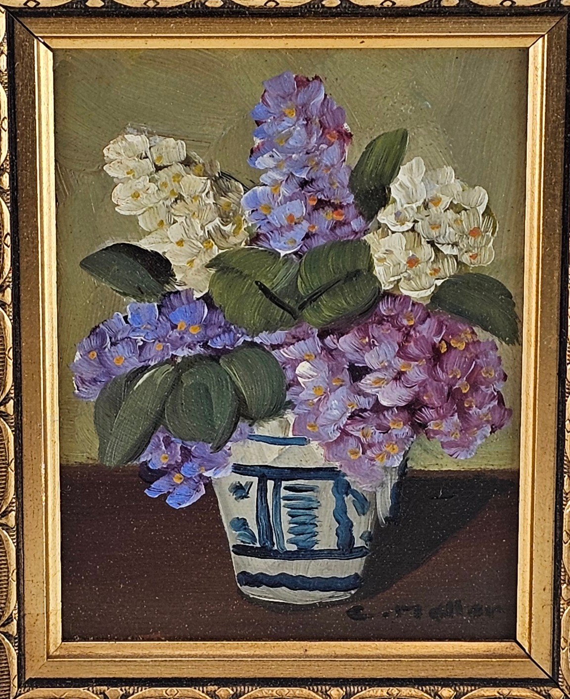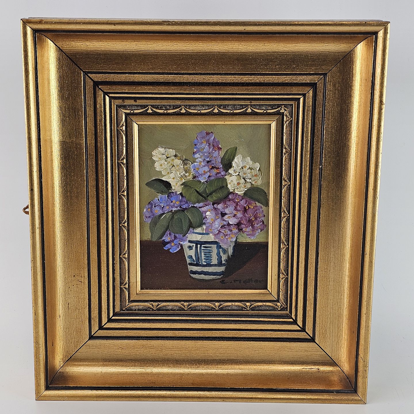 Indrammet maleri, oliemaling på plade i træramme, med motiv af en buket med lilla og hvide blomster.