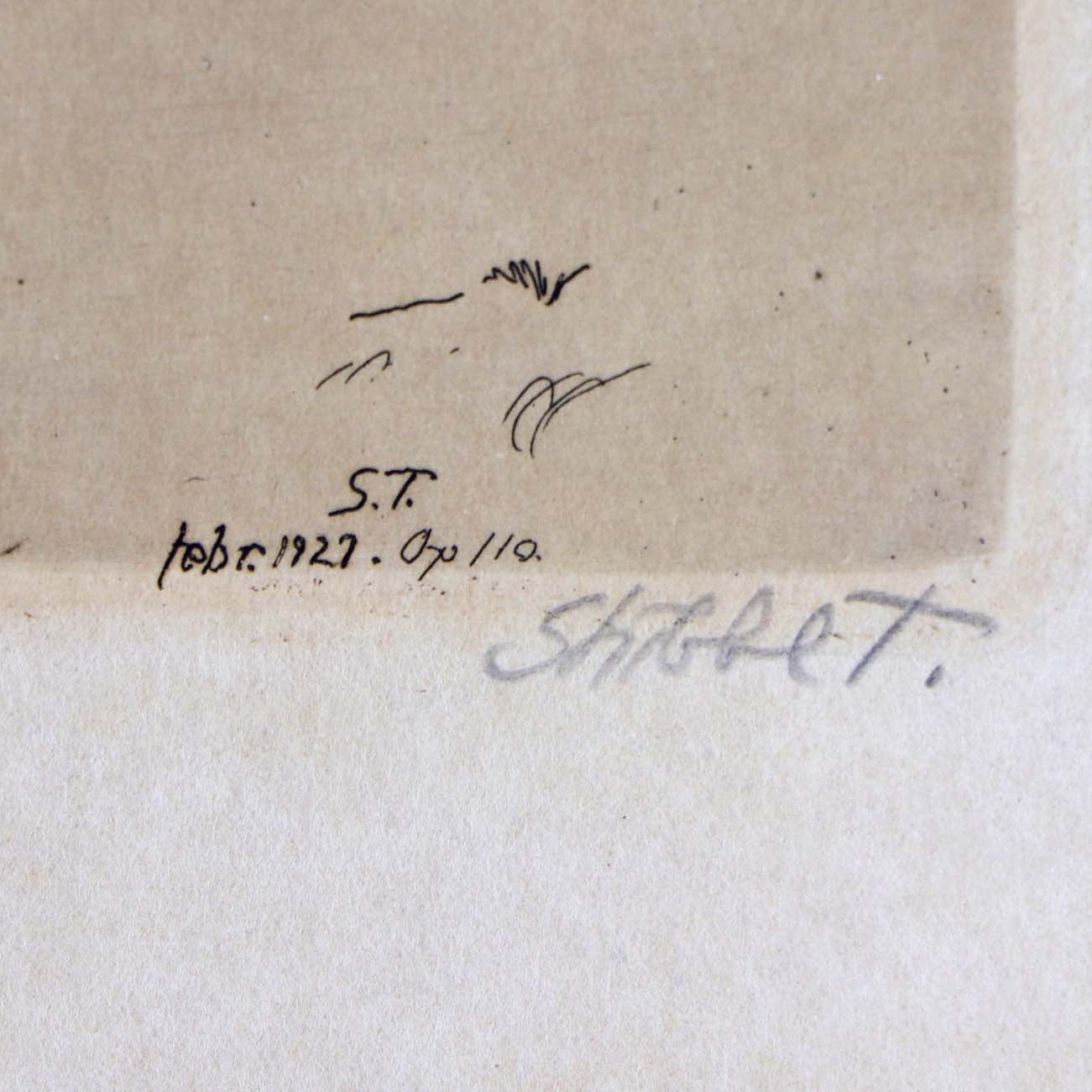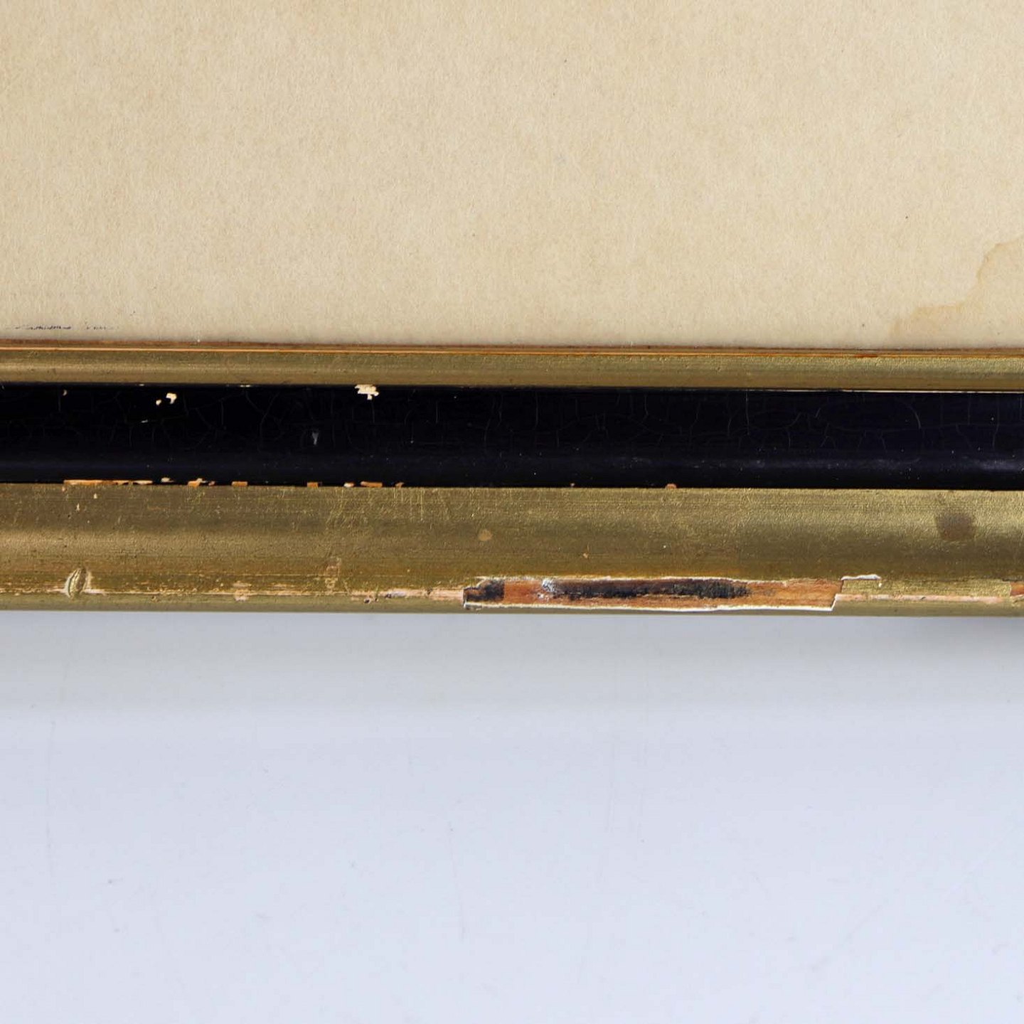 Indrammet litografi i sort- og guldmalet træramme med landskabsmotiv med titlen Den bøjede eg på Trelde. Nr. 23 ud af 25 tryk.
