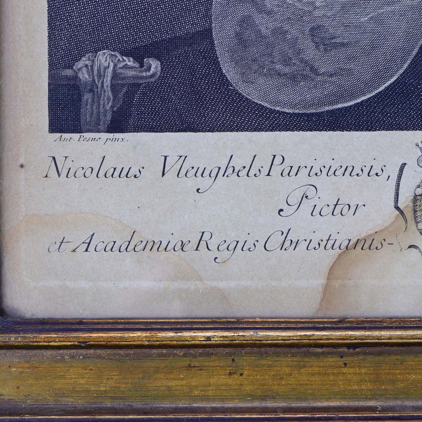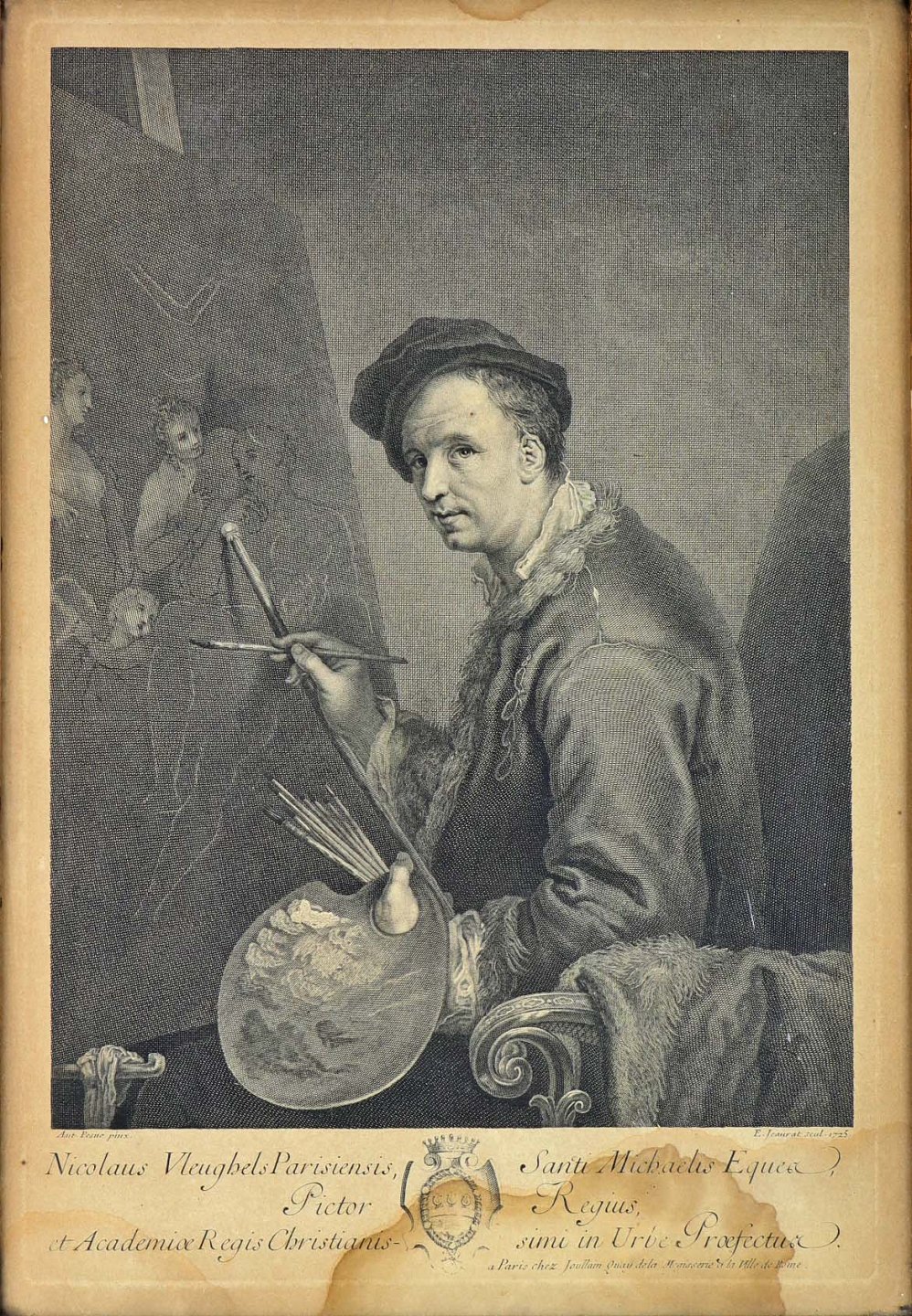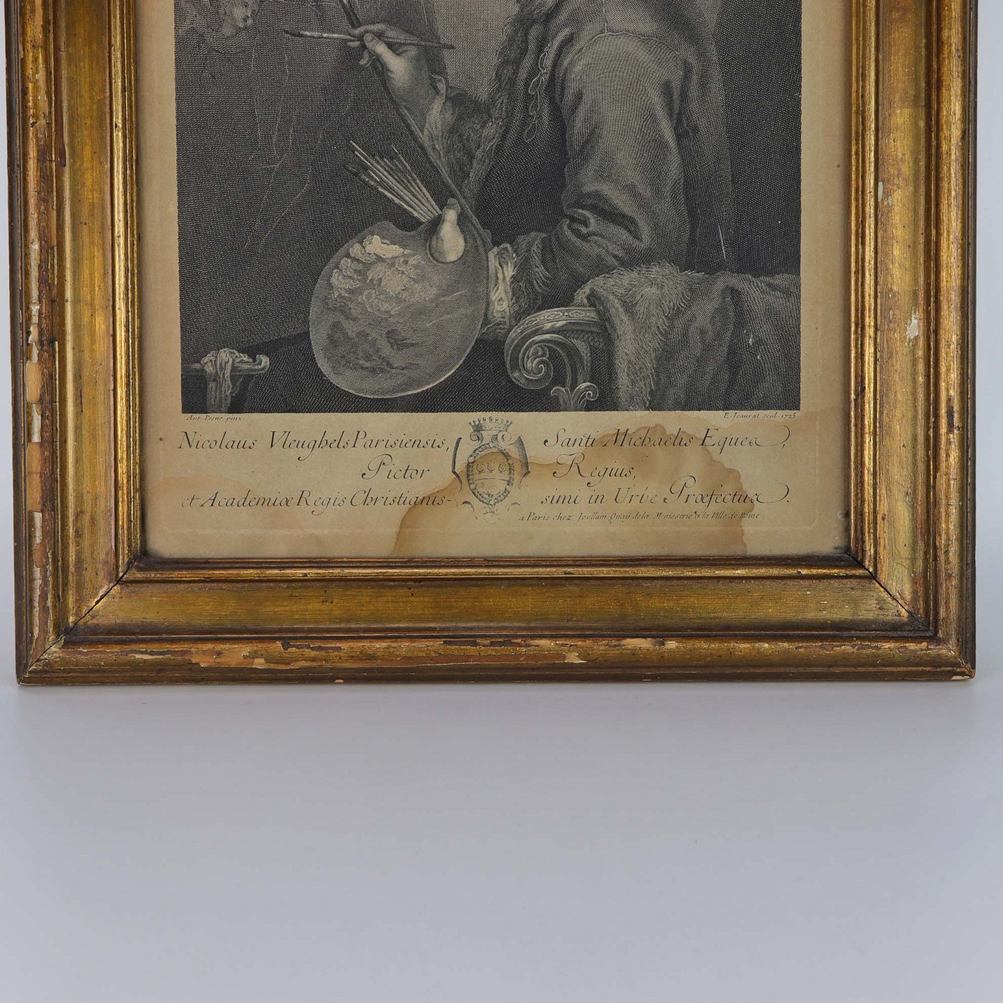 Indrammet radering i guldmalet træramme med motiv af den franske maler Nicolas Vleughels (1699-1737)