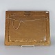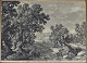 Indrammet bogtryk i guldmalet struktureret træramme med motiv af grupper af mennesker i landskabsområde.