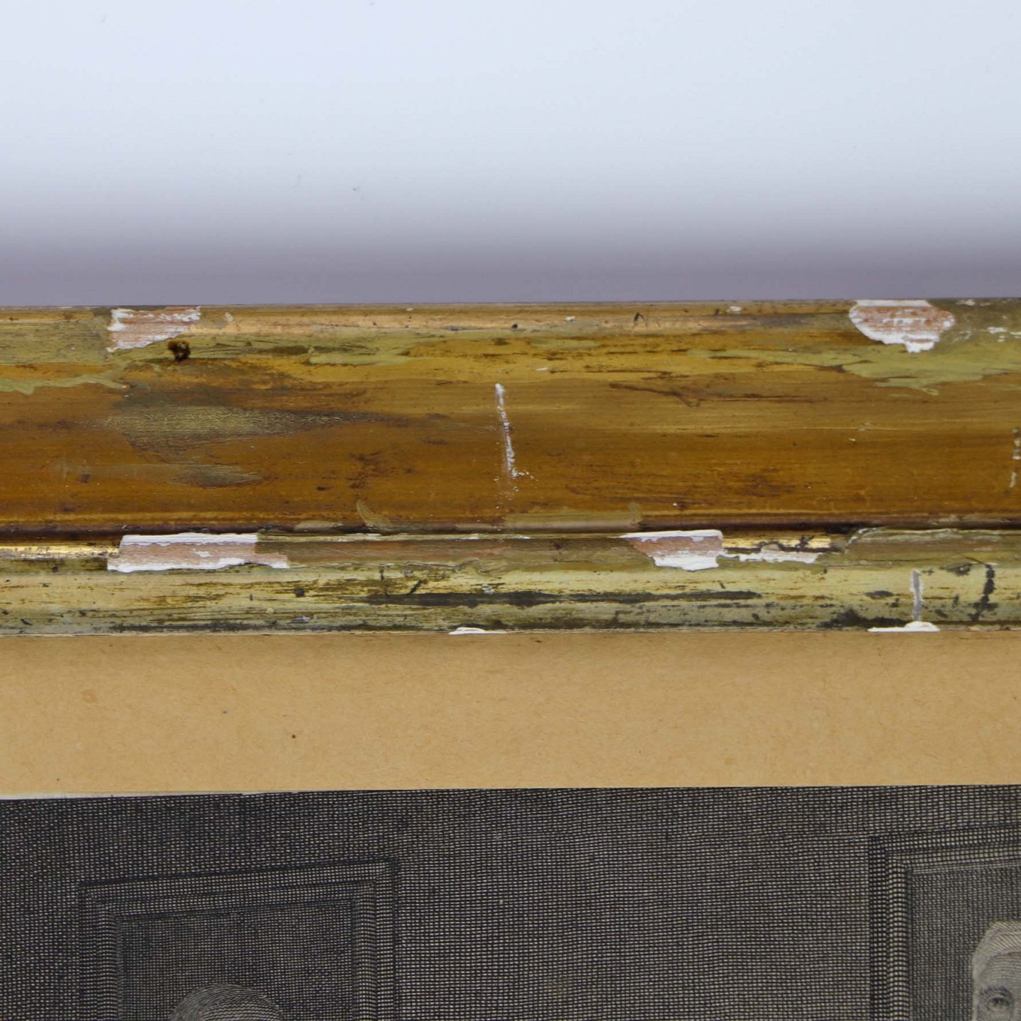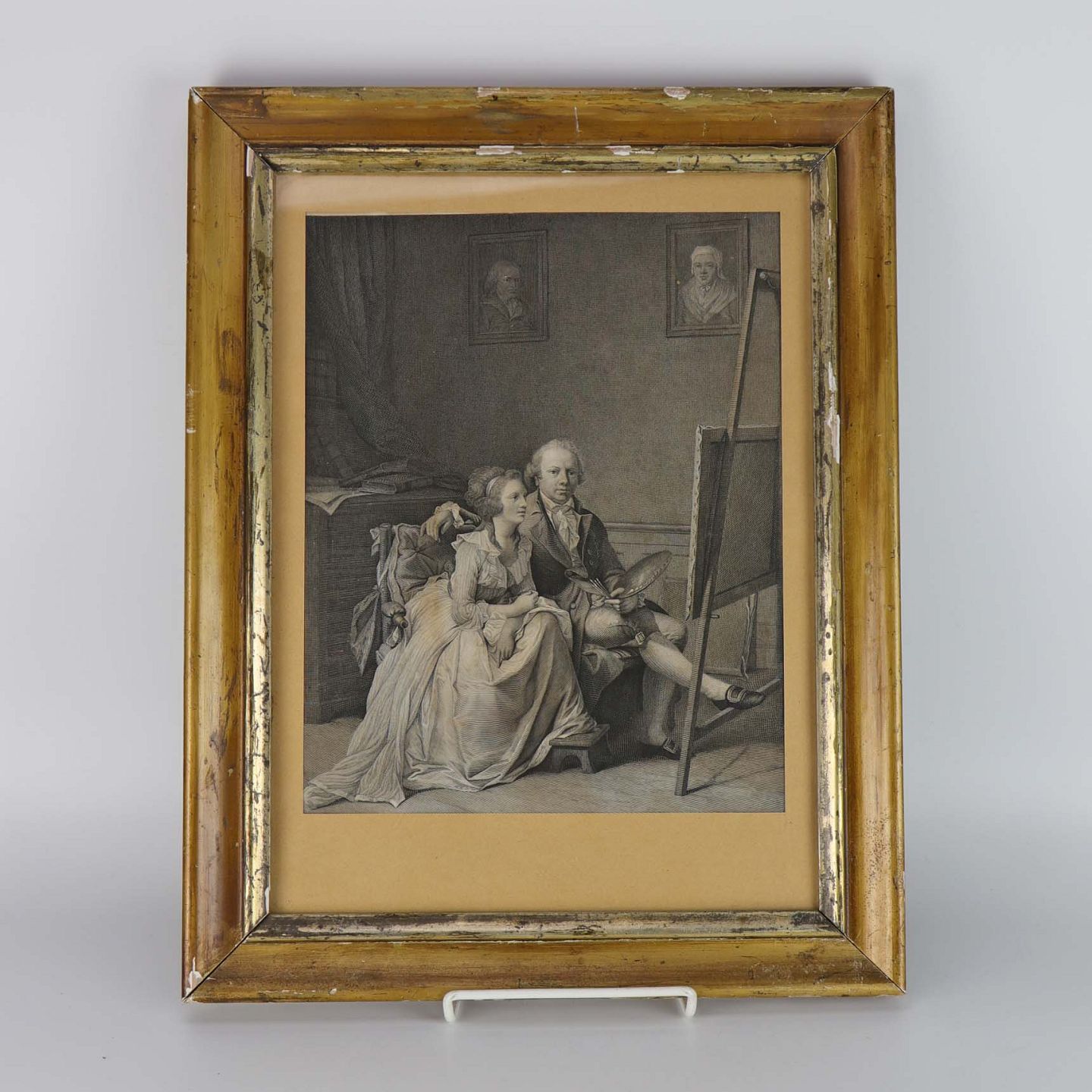 Indrammet kobberstik med passepartout i guldmalet træramme med motiv af den danske kunstmaler Jens Juel og hans kone ved staffeli
