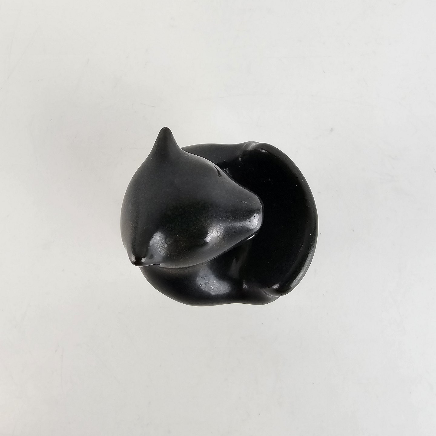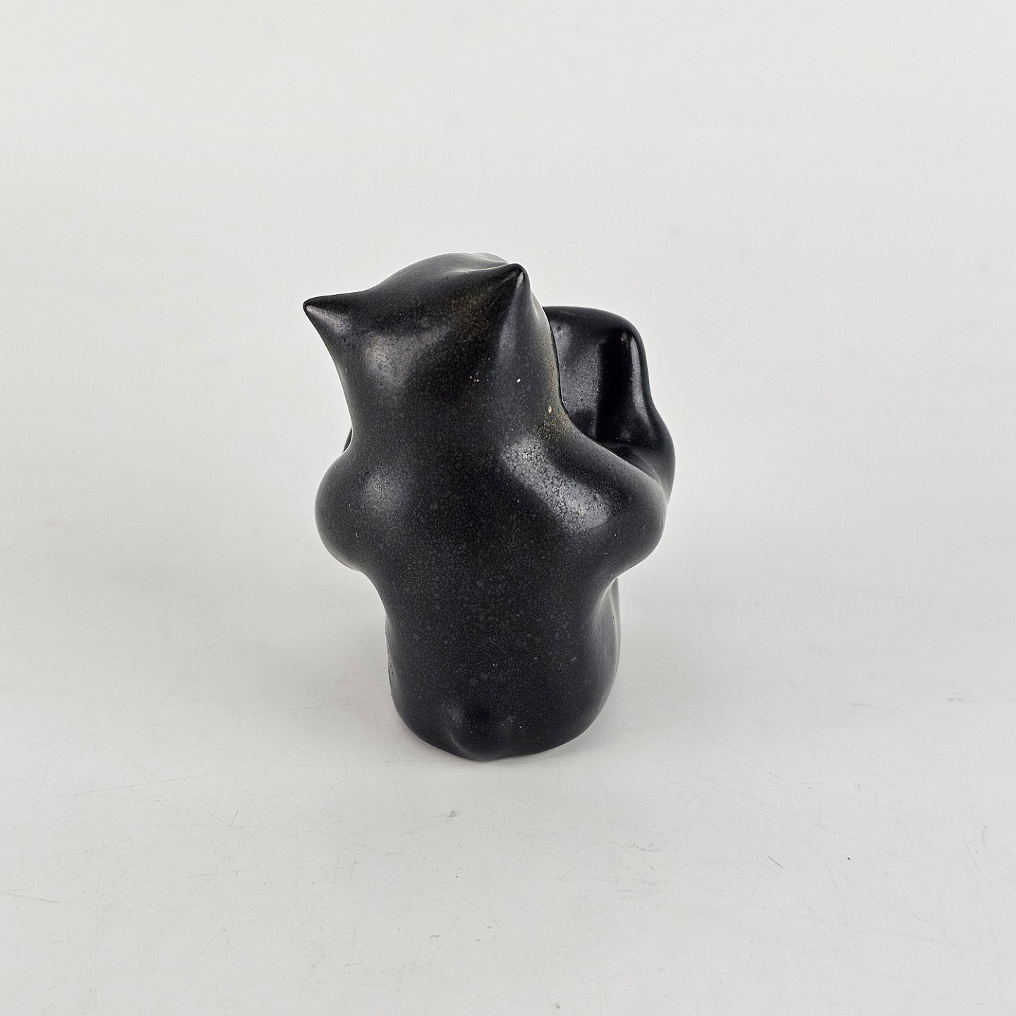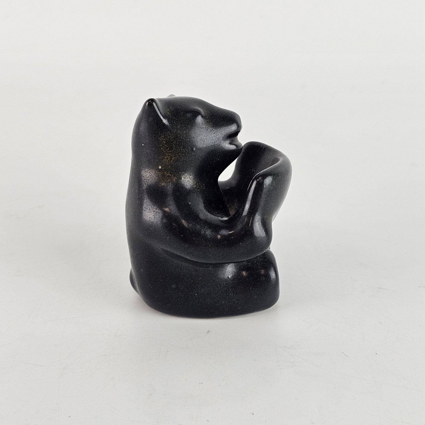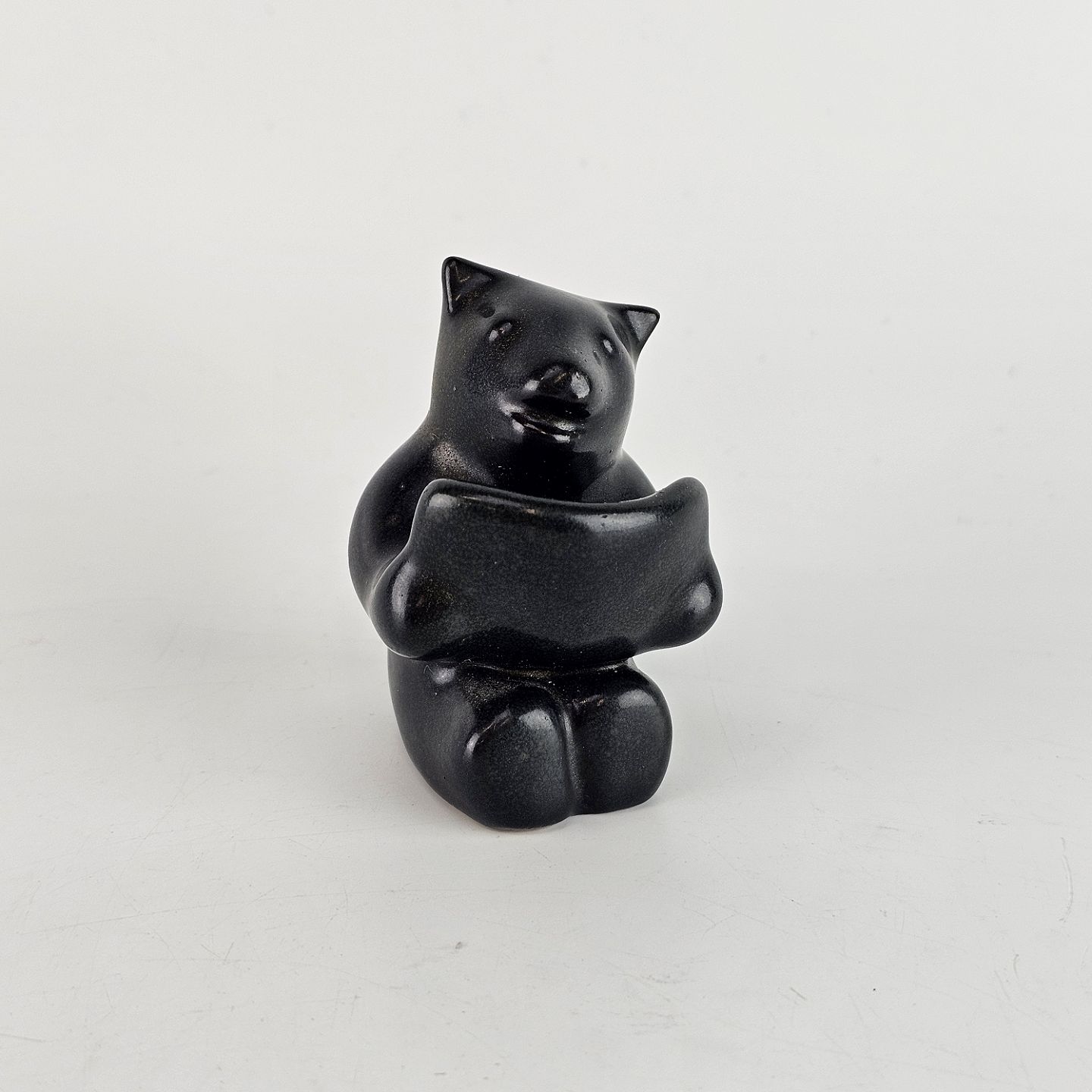 Sortglaseret keramikfigur med motiv af en bjørn som læser en bog.