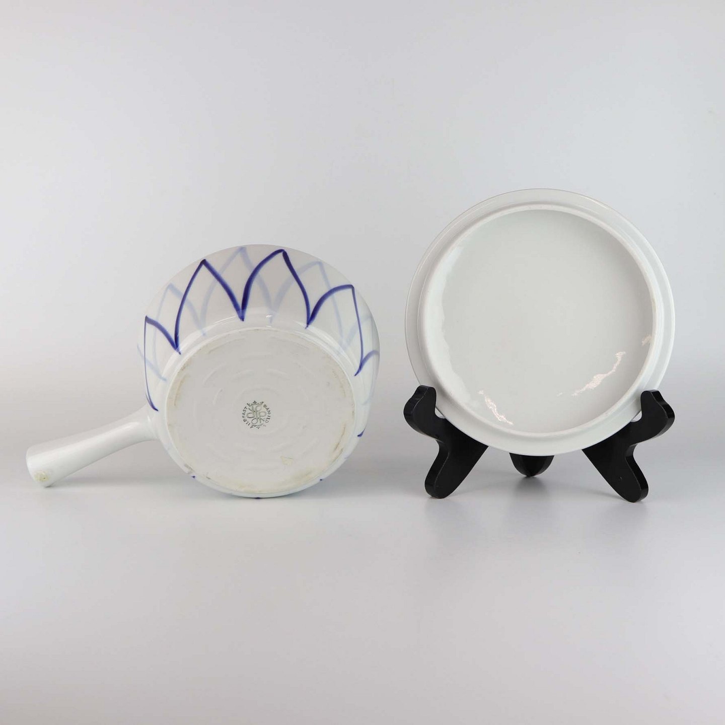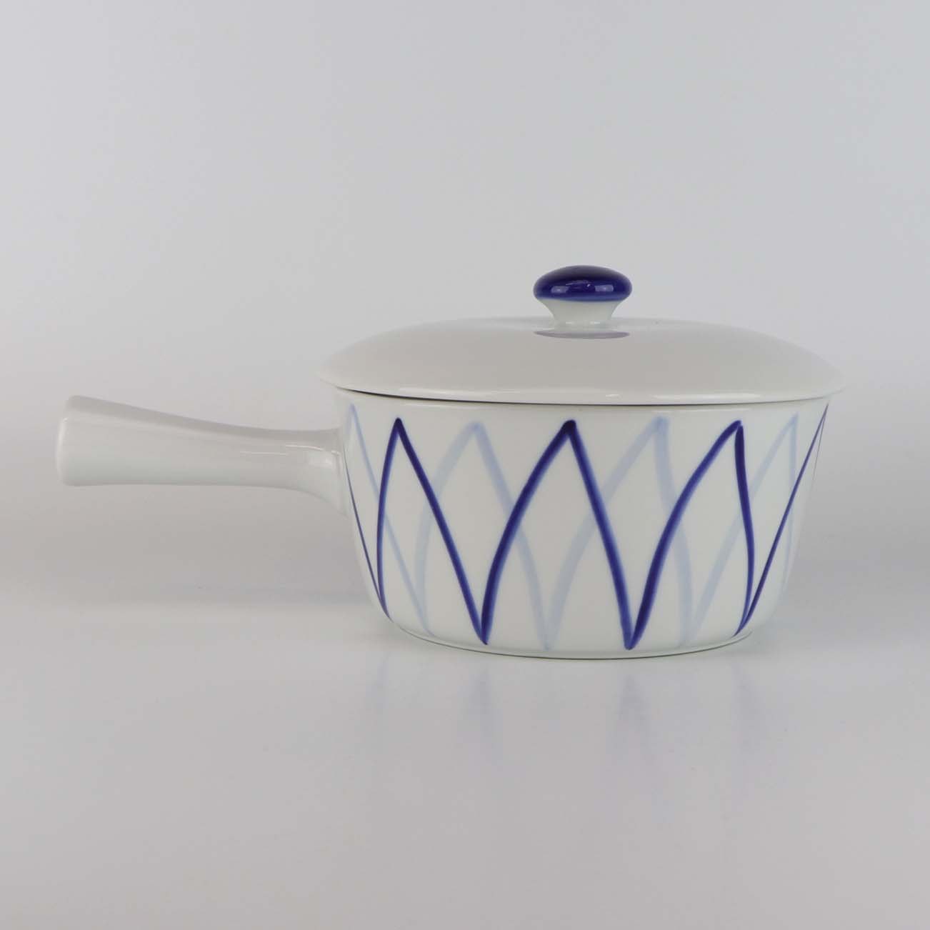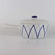 Lille gryde med låg i porcelæn fra stellet Dan-Ild 40, som også er kendt under navne som Blå Flamme eller Harlekin.