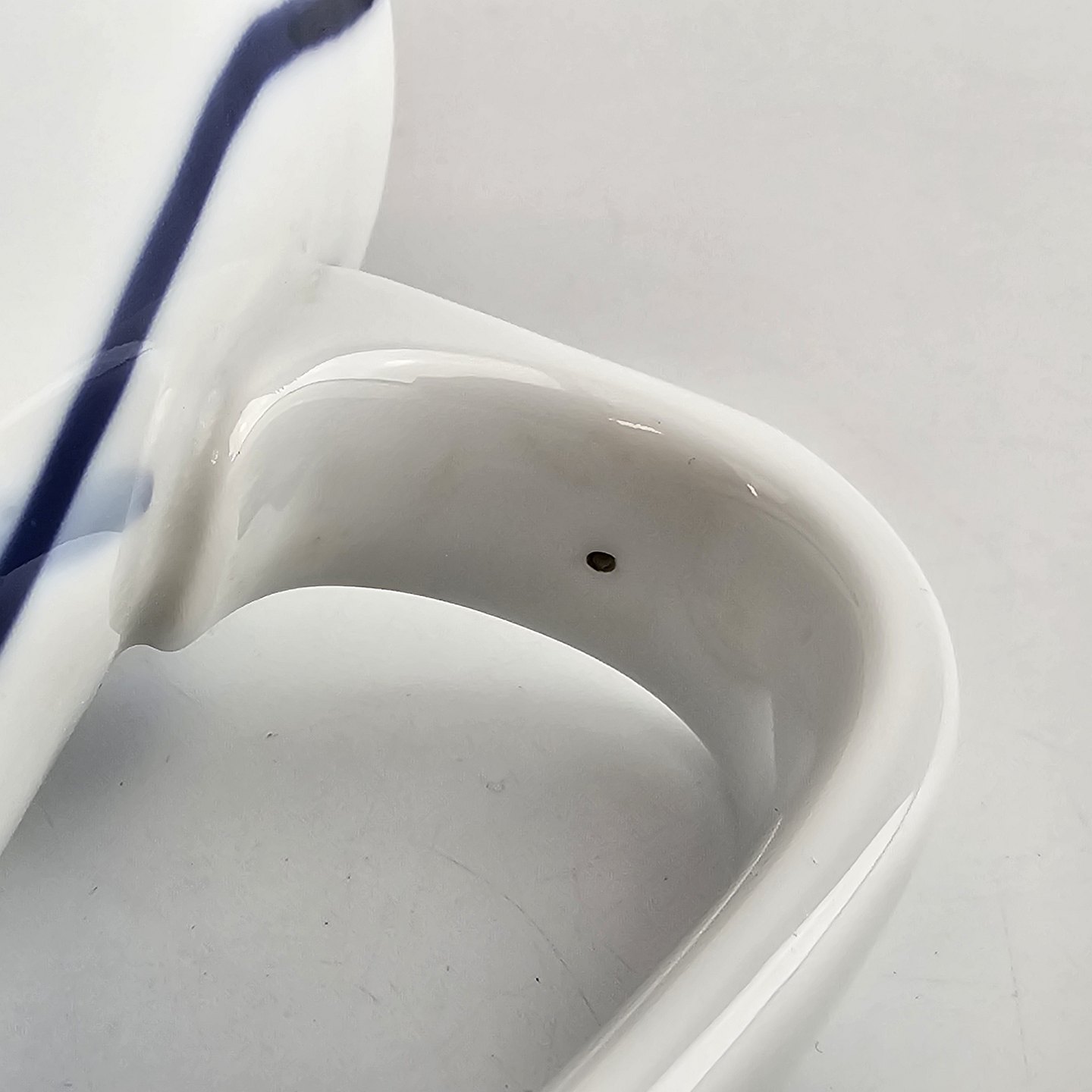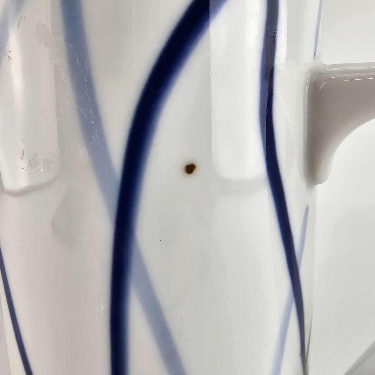 Blå Flamme er hvidt ildfast porcelæn, dekoreret med blå striber, der ligner flammer.