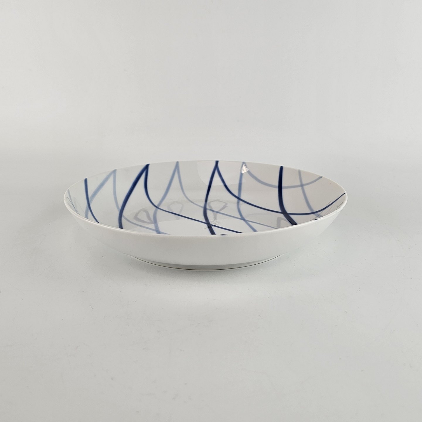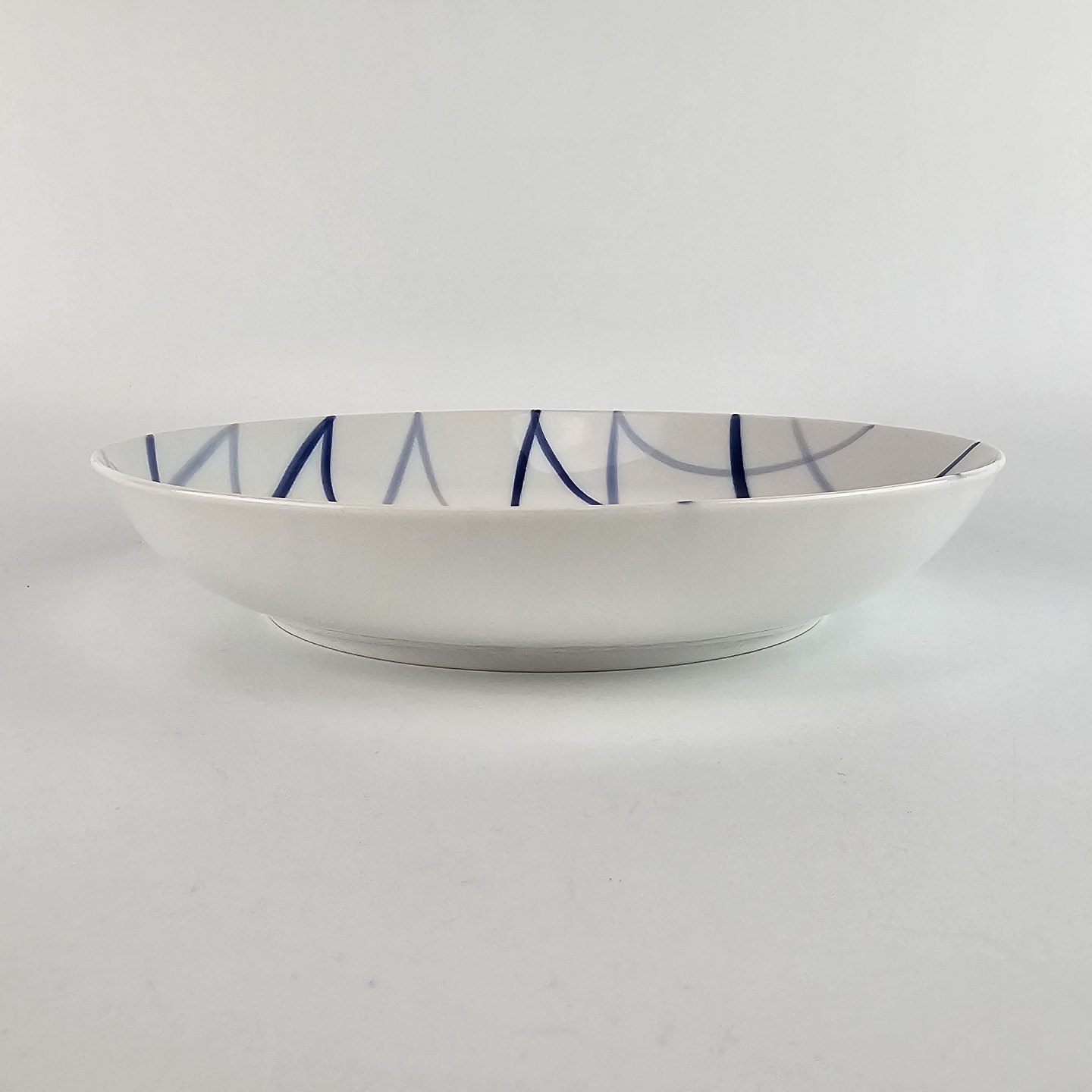 Blå Flamme er hvidt ildfast porcelæn, dekoreret med blå striber, der ligner flammer.