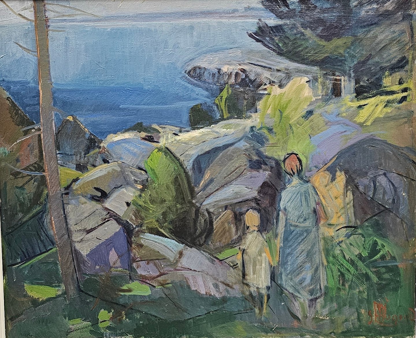 Oliemaleri på lærred, med motiv af en kvinde og et barn i et landskab med sten.