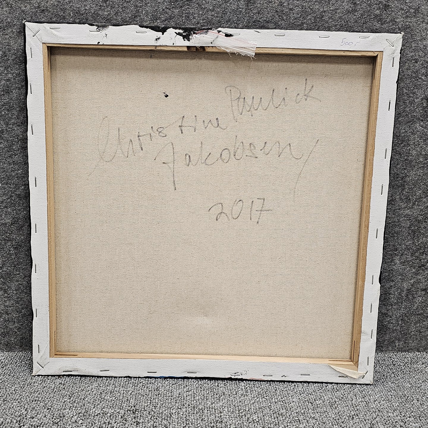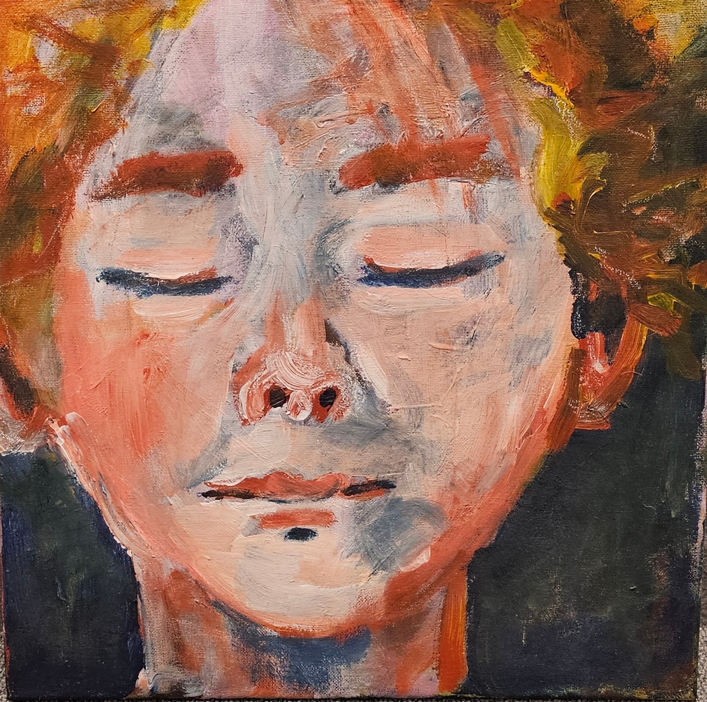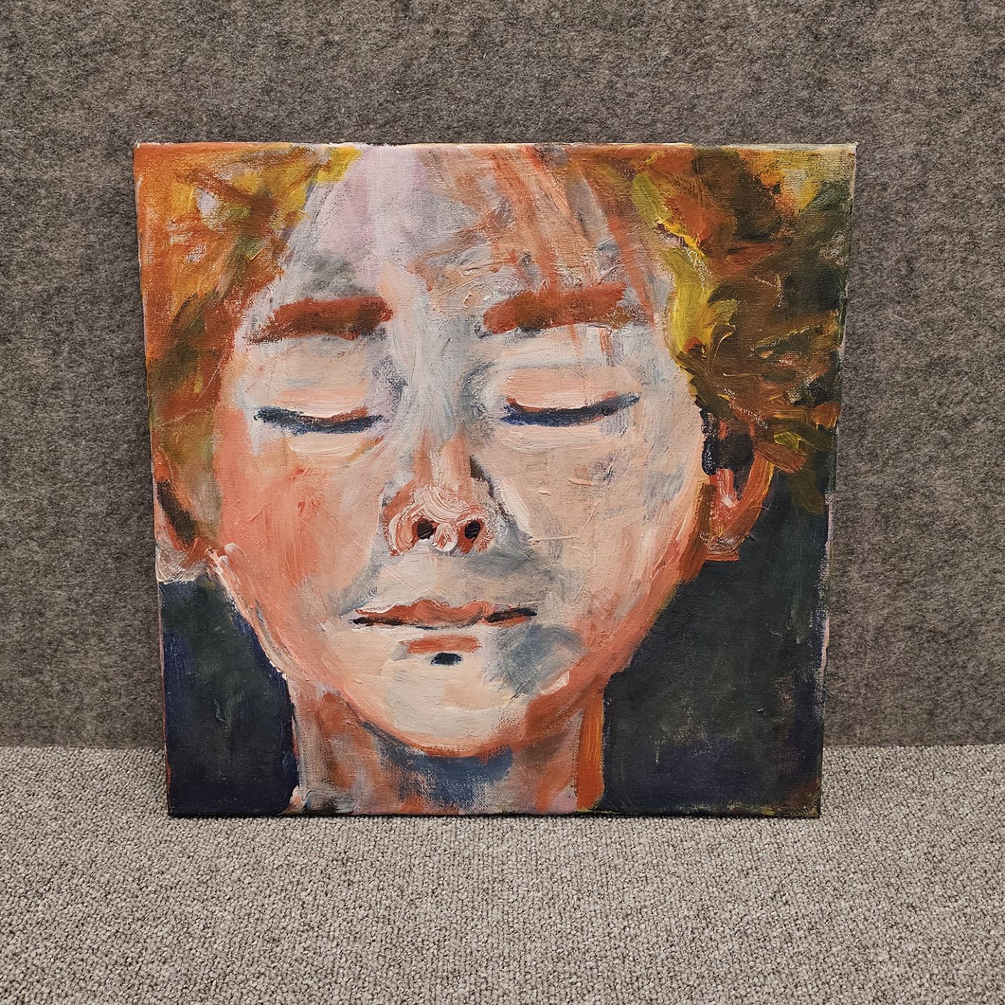 Oliemaleri på lærred, med motiv af et ansigt med lukkede øjne.