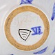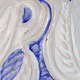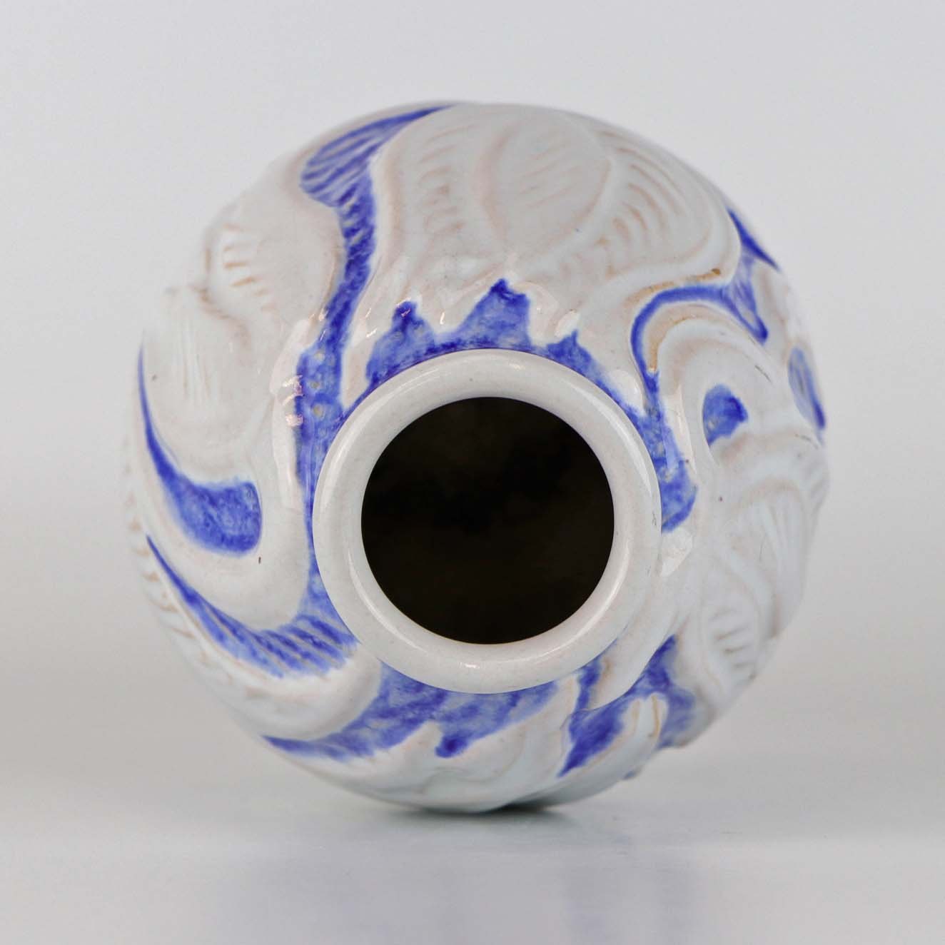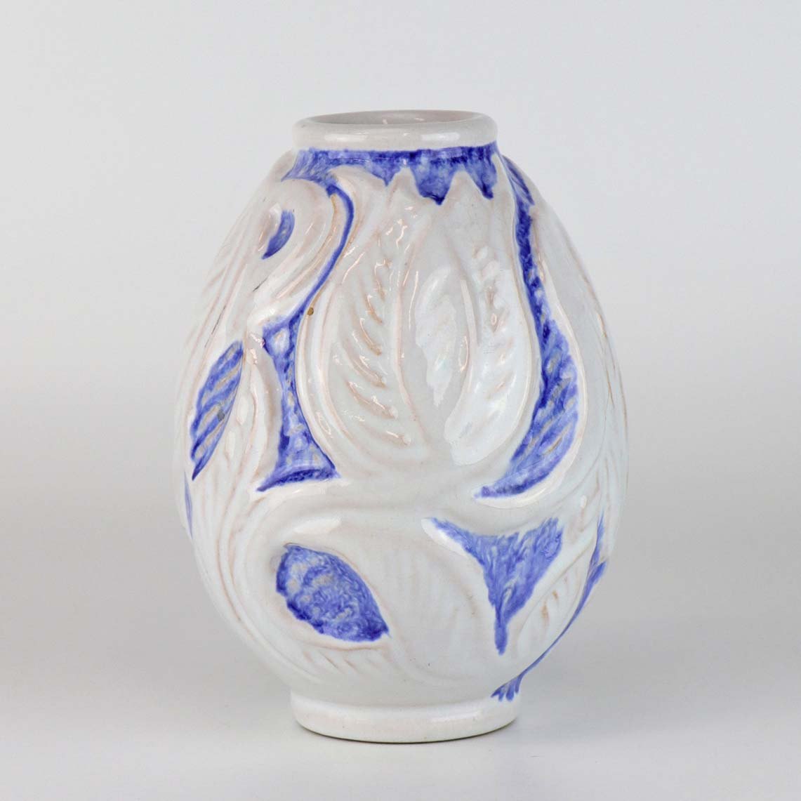 Æggeformet vase i keramik med motiv af hvidglaserede blomster og blade på blåglaseret baggrund. Nr. 5125-1