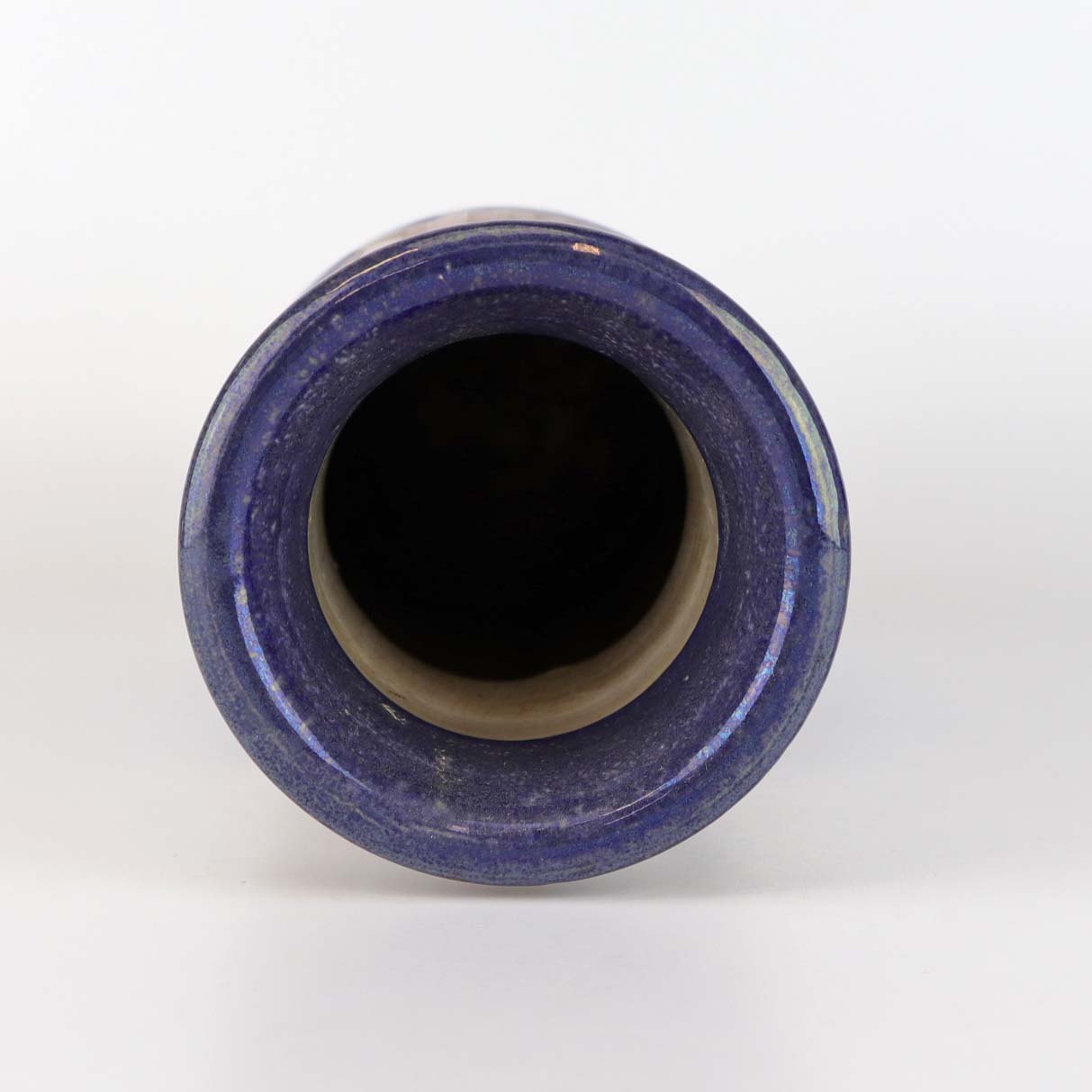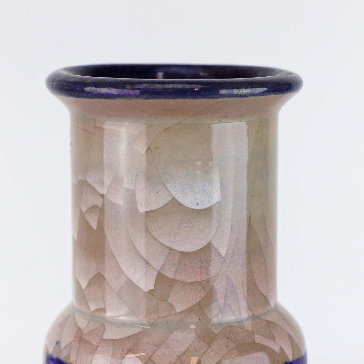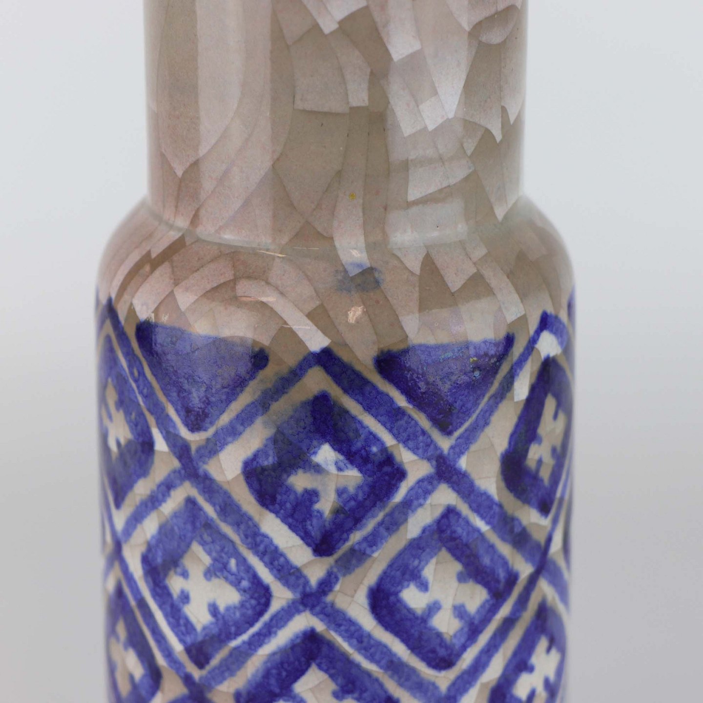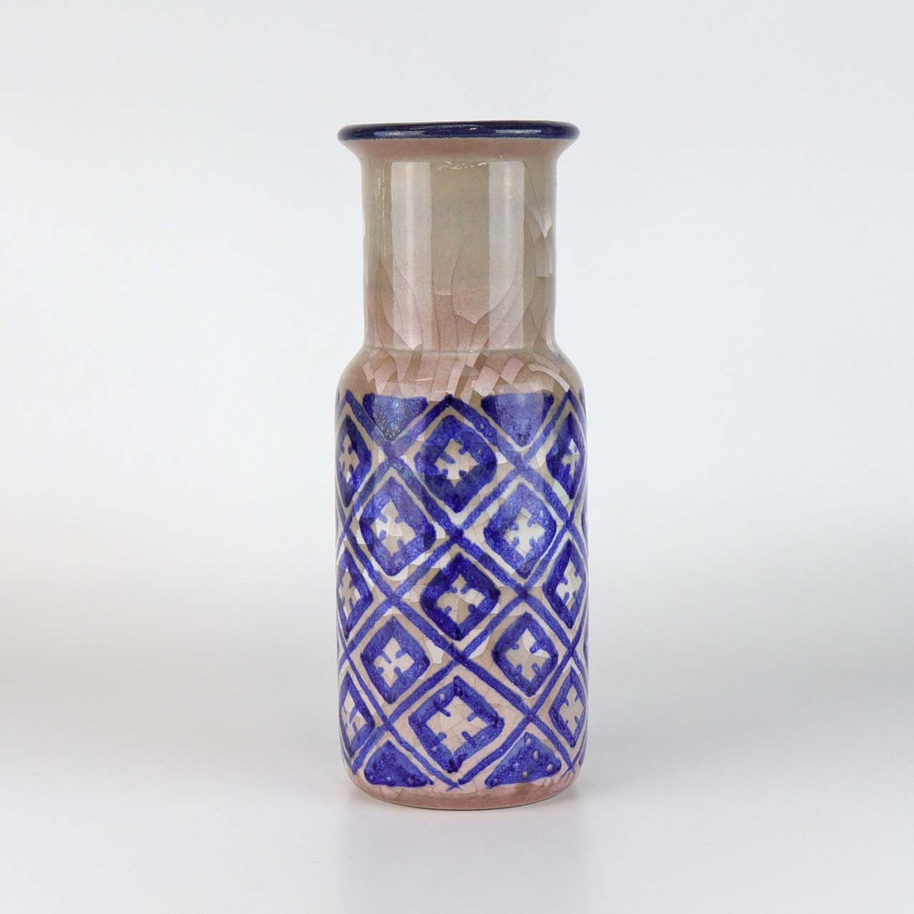 Vase i glaseret keramik med blåt geometrisk mønster på lyst facetteret baggrund. Nr. 5876-2