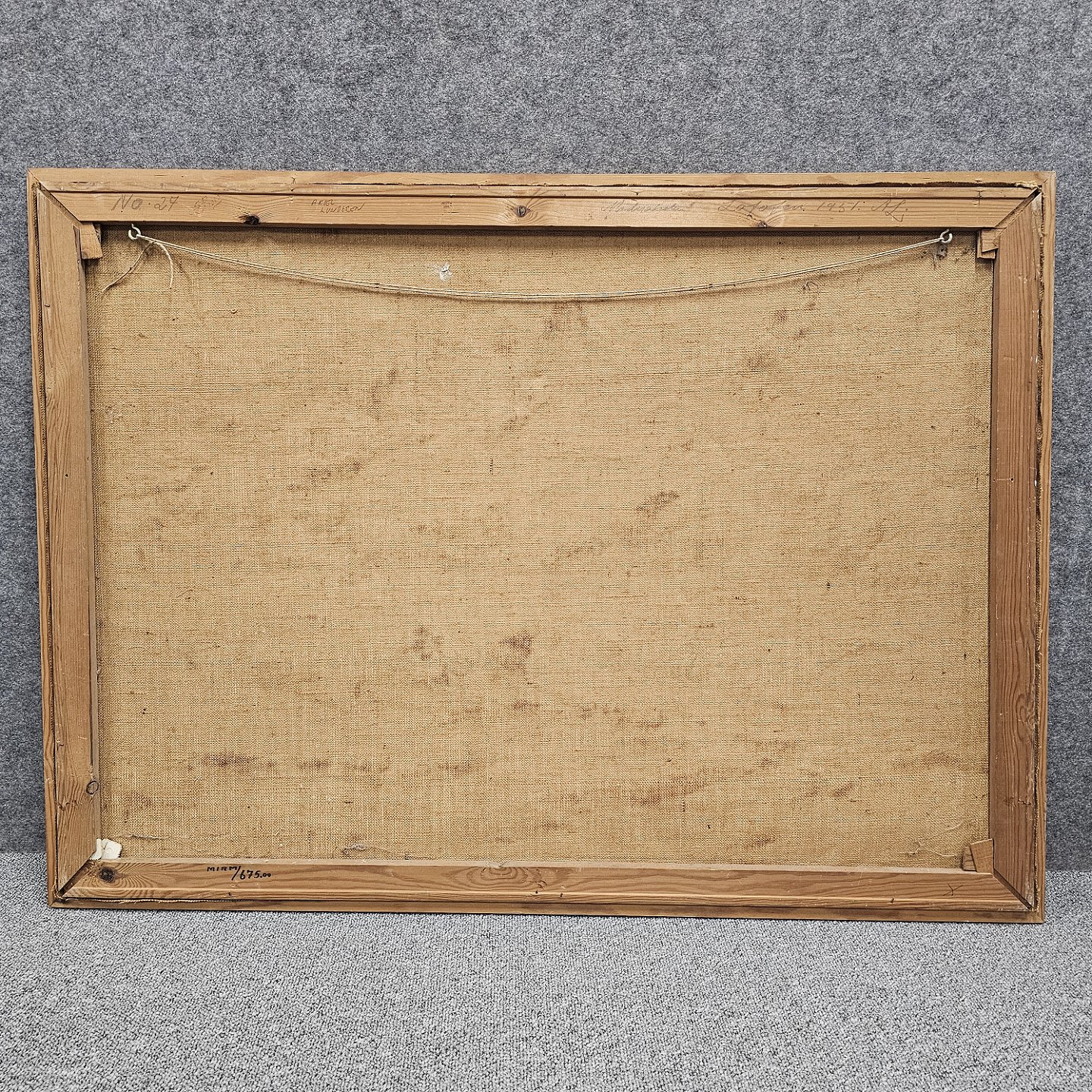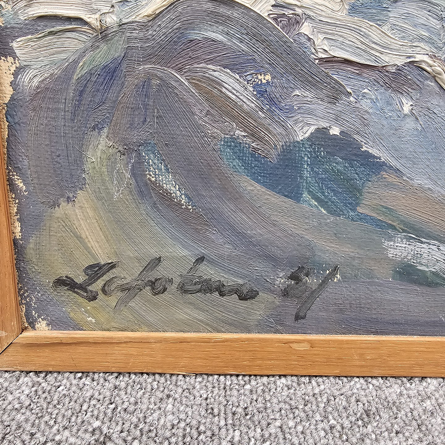 Oliemaleri på lærred, med motiv af fjeldene i Lofoten og en båd på fjorden.