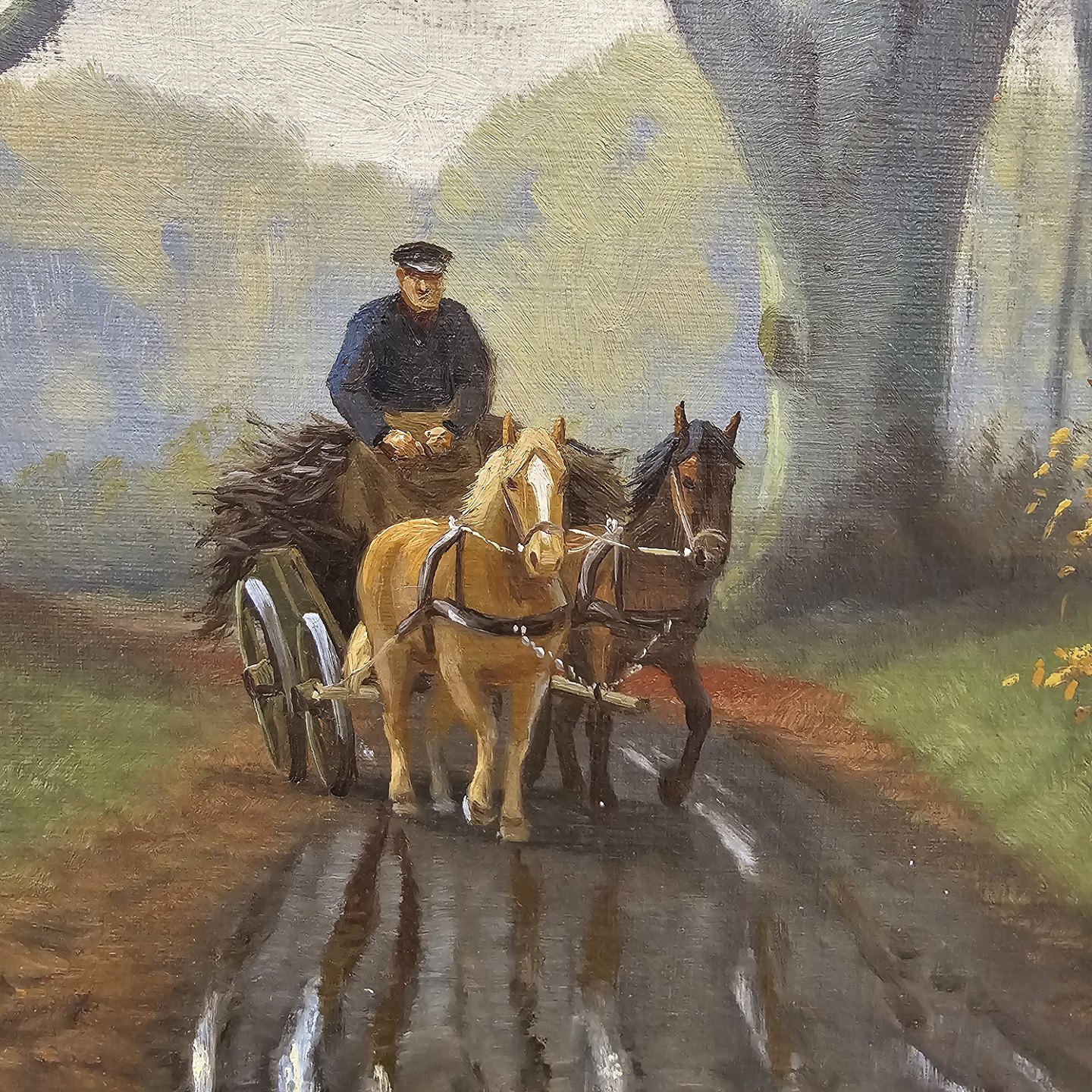 Oliemaleri på lærred, sat i guldramme, med motiv af en hestevogn som kører på en mudret vej gennem en skov.