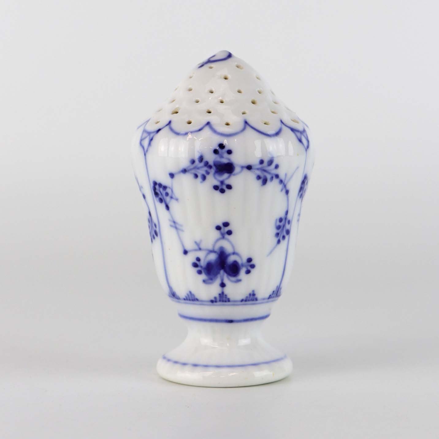 Peberstrø af kongelig porcelæn fra stellet Musselmalet riflet. Nr. 1/469 Peberbøssen er fra slutningen af 1800-tallet