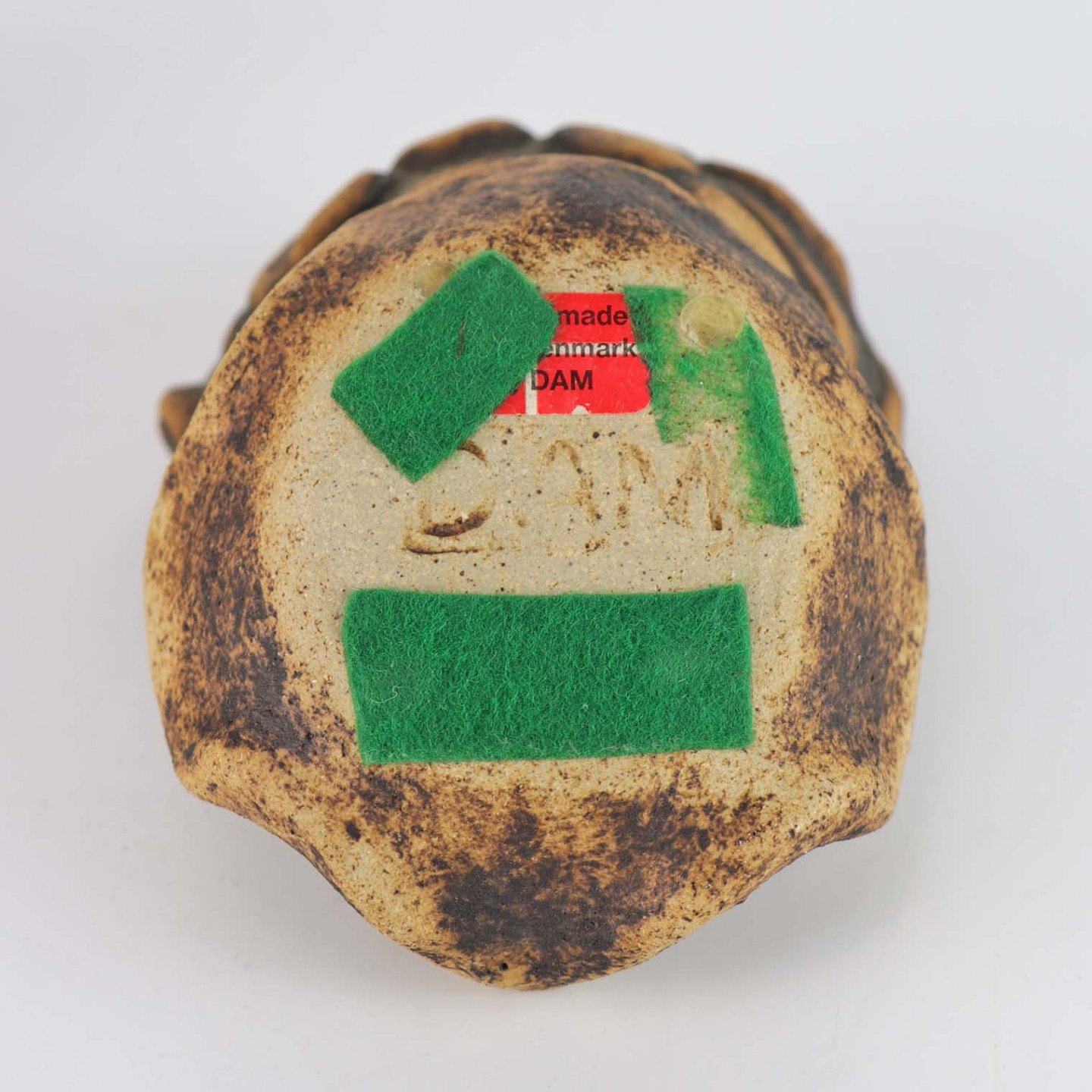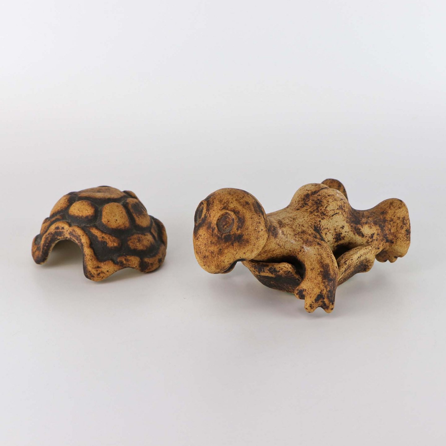 Figur i keramik med motiv af skildpadde. Figuren er tre-delt og består af over- og underskjold samt afklædt padde.