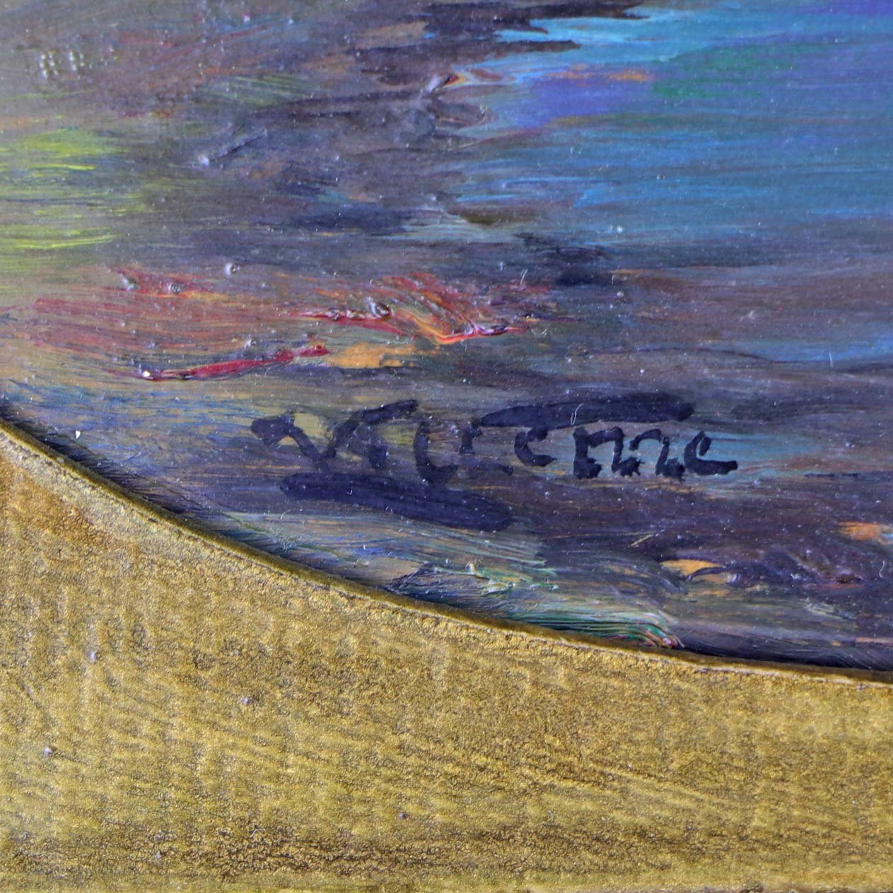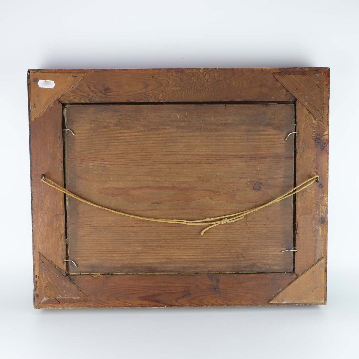 Gammel maleri på plade i malet gips ramme med motiv af både på land ved kystlinje.