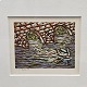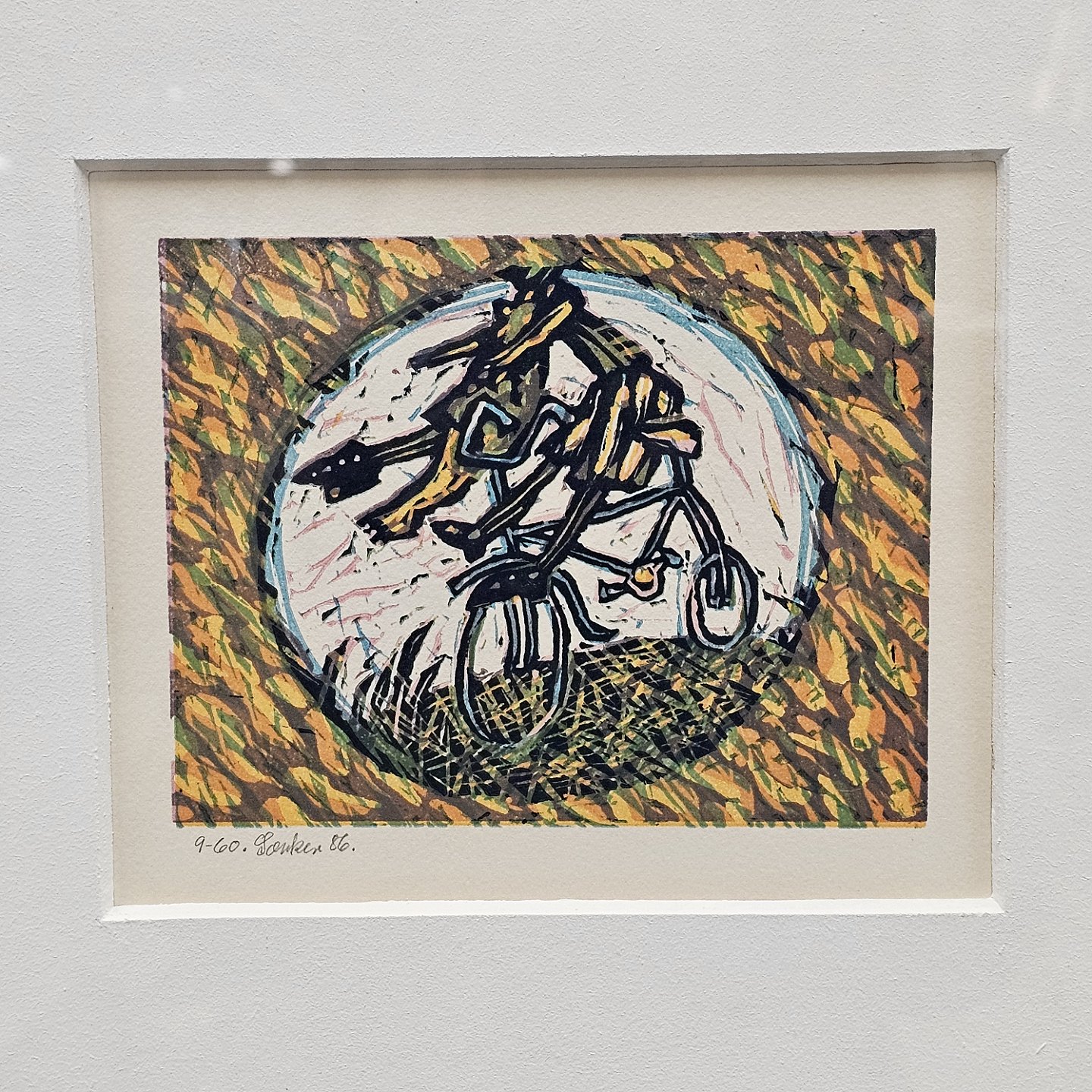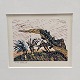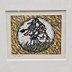 Tre små linoliumssnit i skifteramme, med forskellige motiver. Del af et sæt.