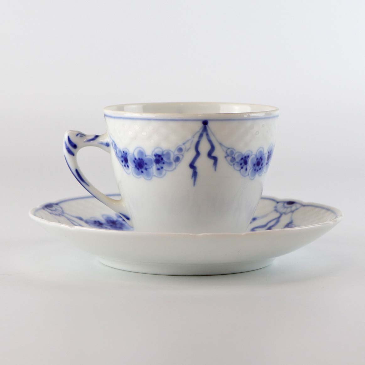Service i hvidt porcelæn med skelform og motiv af guirlander med blå blomster.