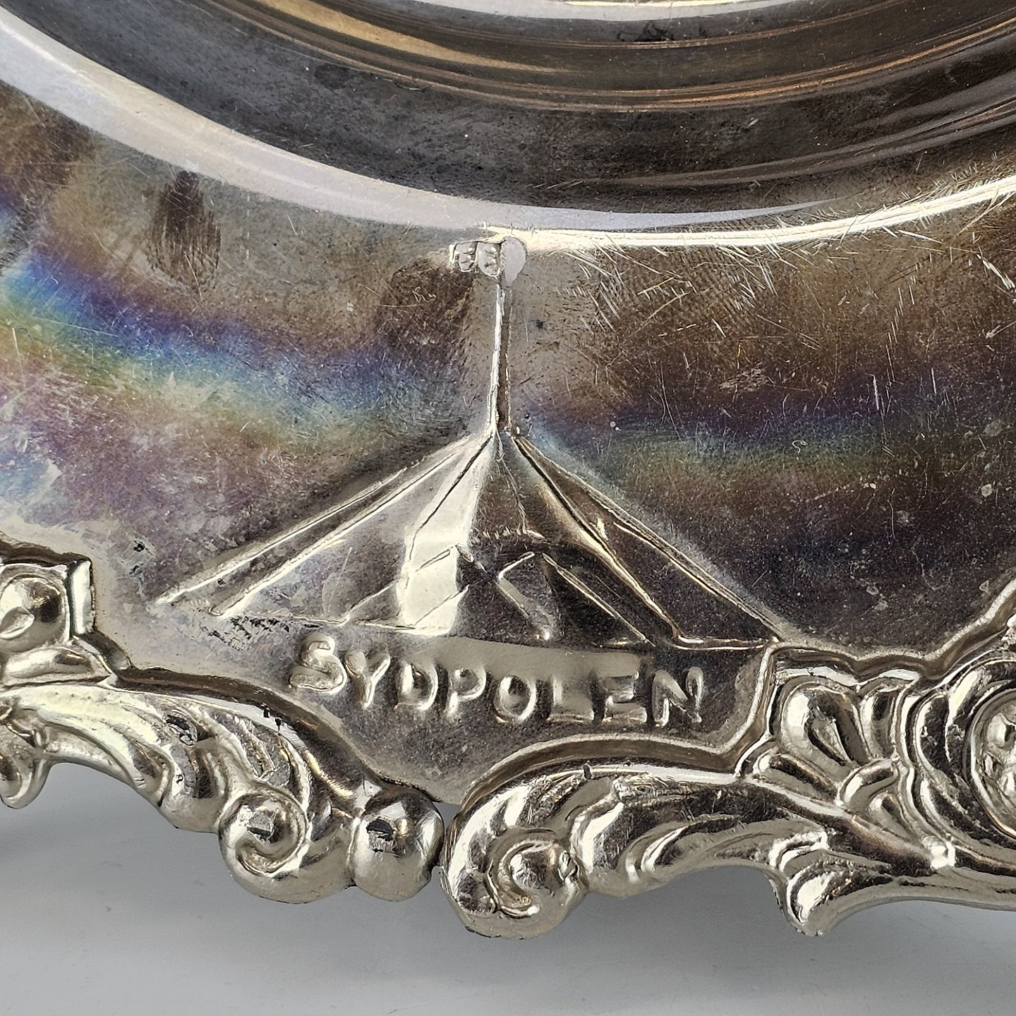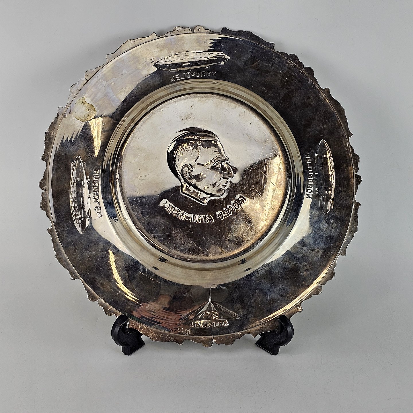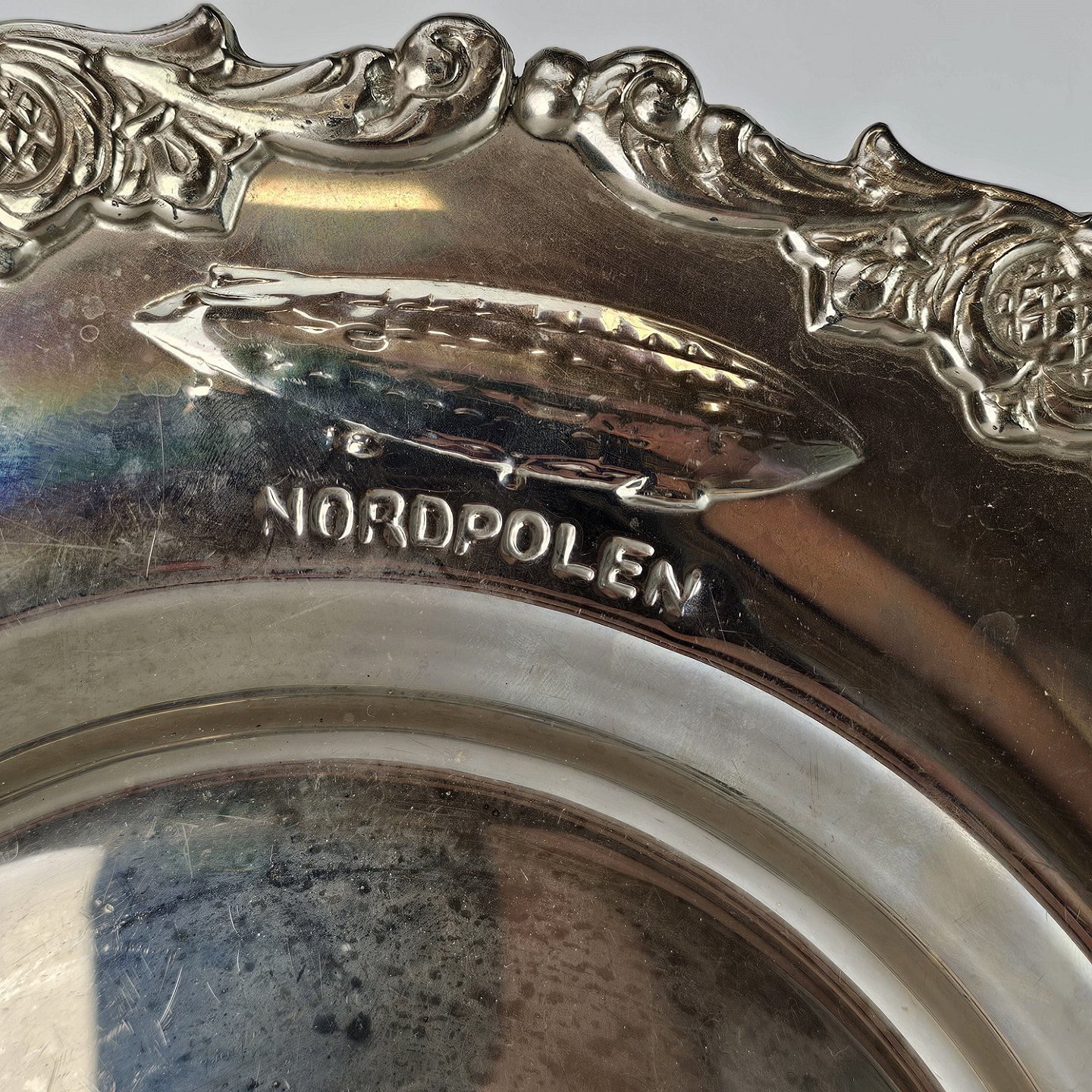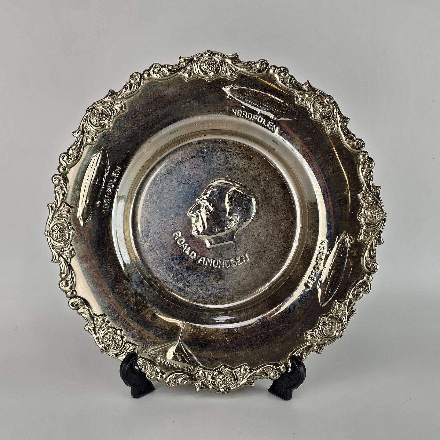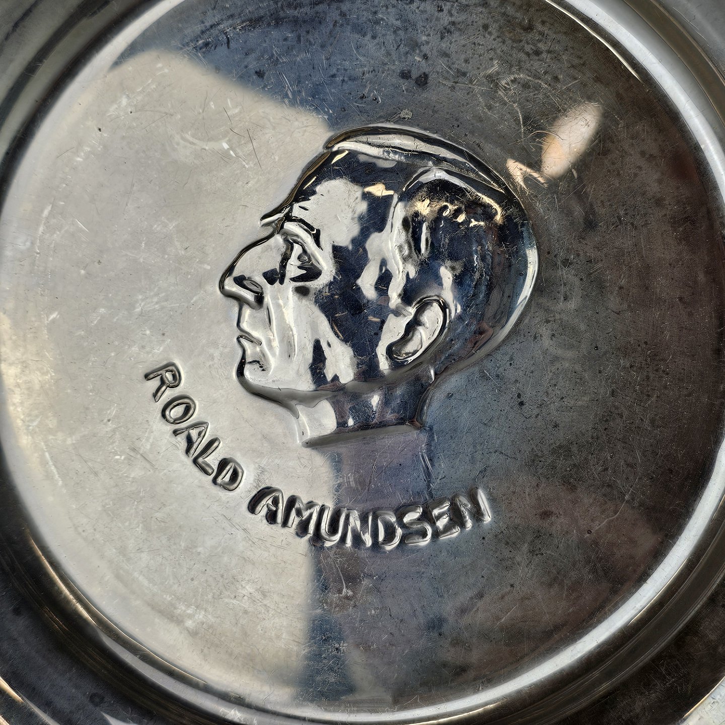 Plet sølv fad med et portræt af Roald Ammundsen.