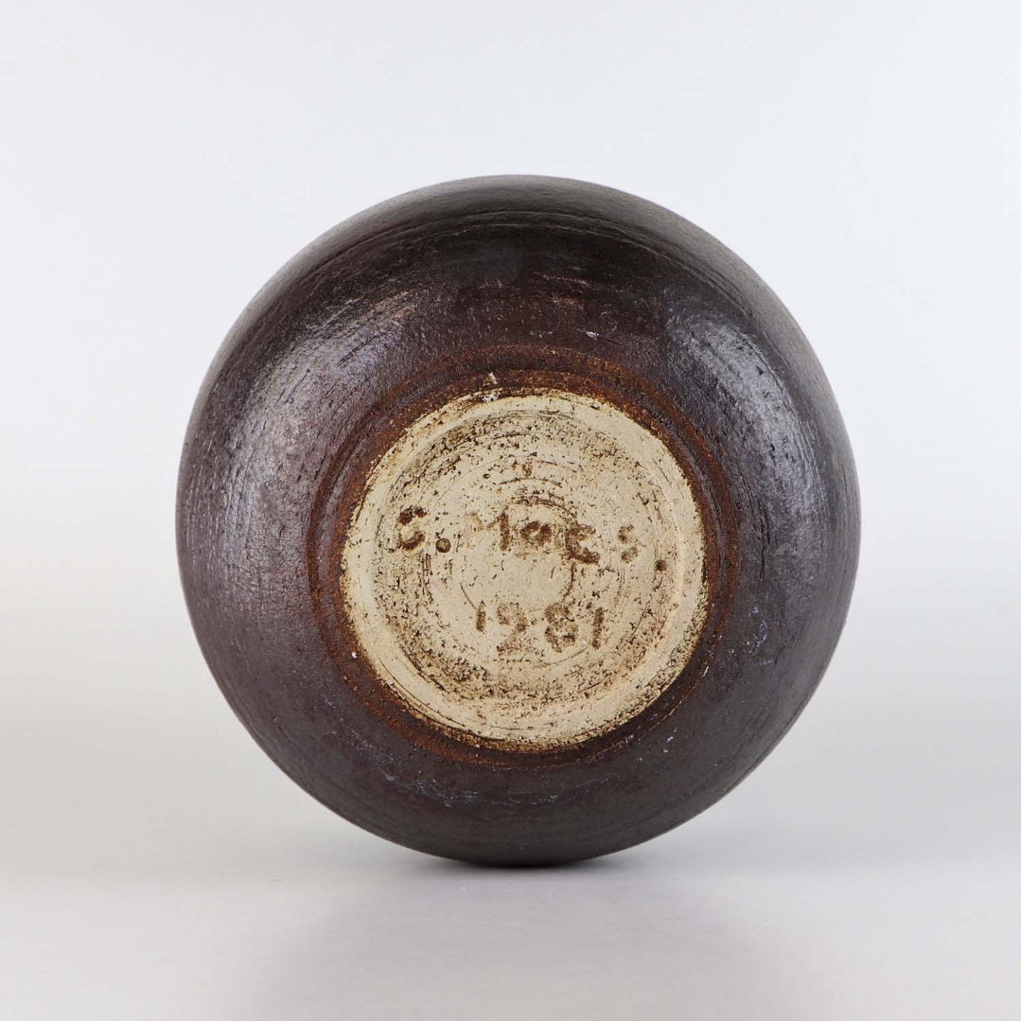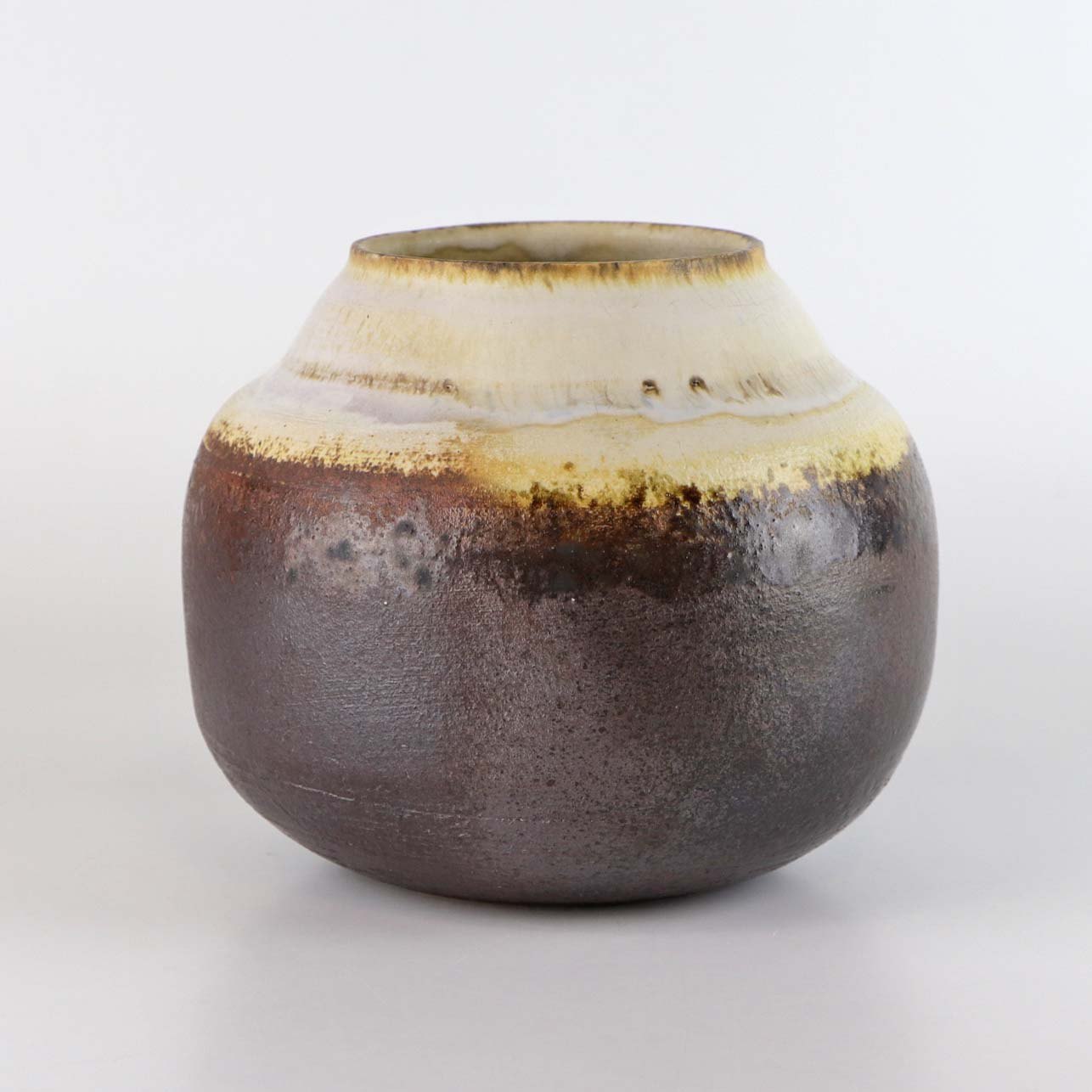 Rund vase i keramik med brun og lys glasur fra år 1981. Vasen har lys glasur på indvendig side.