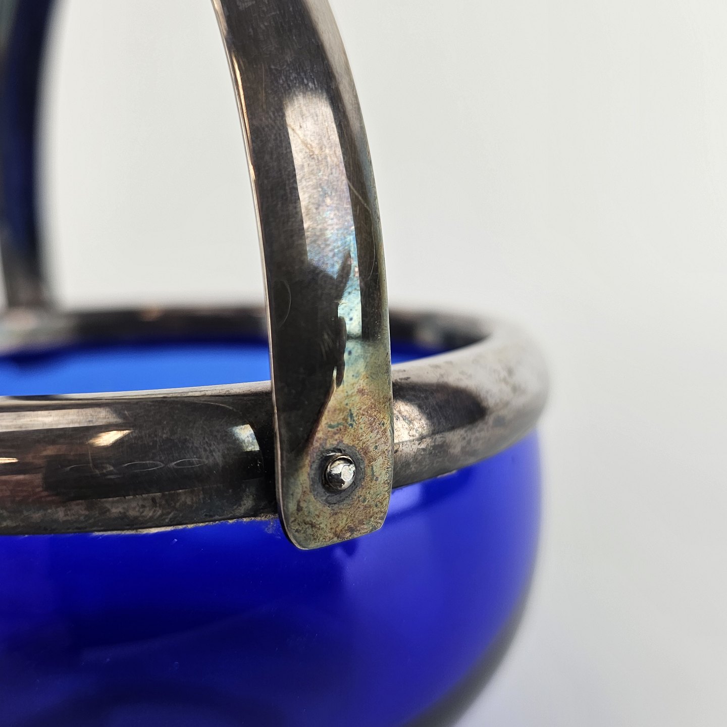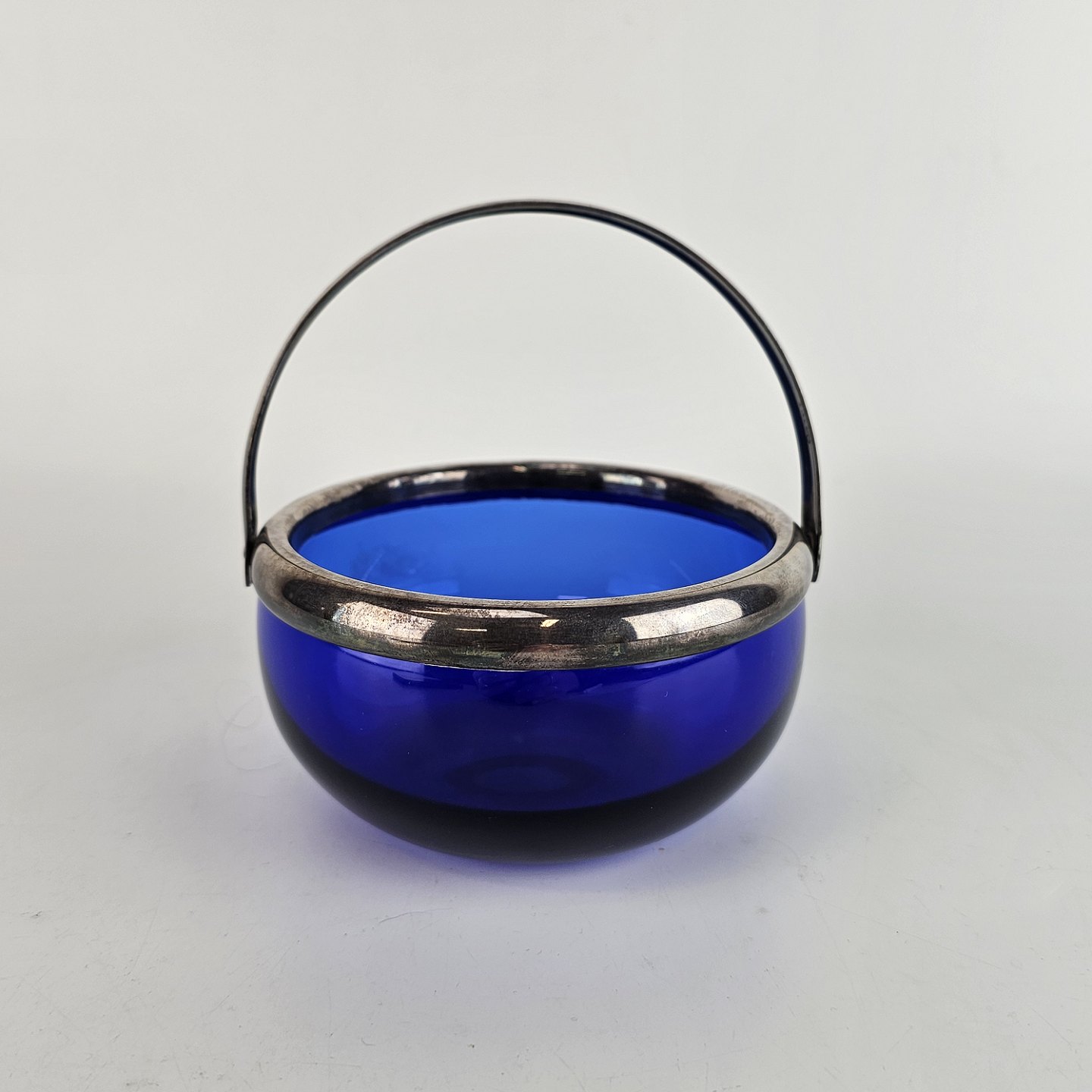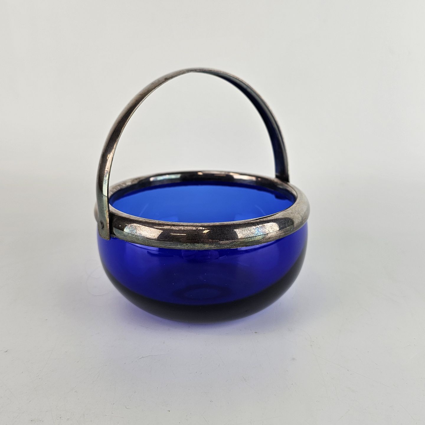 Sukkerskål i blåt glas, med kant og hank af pletsølv