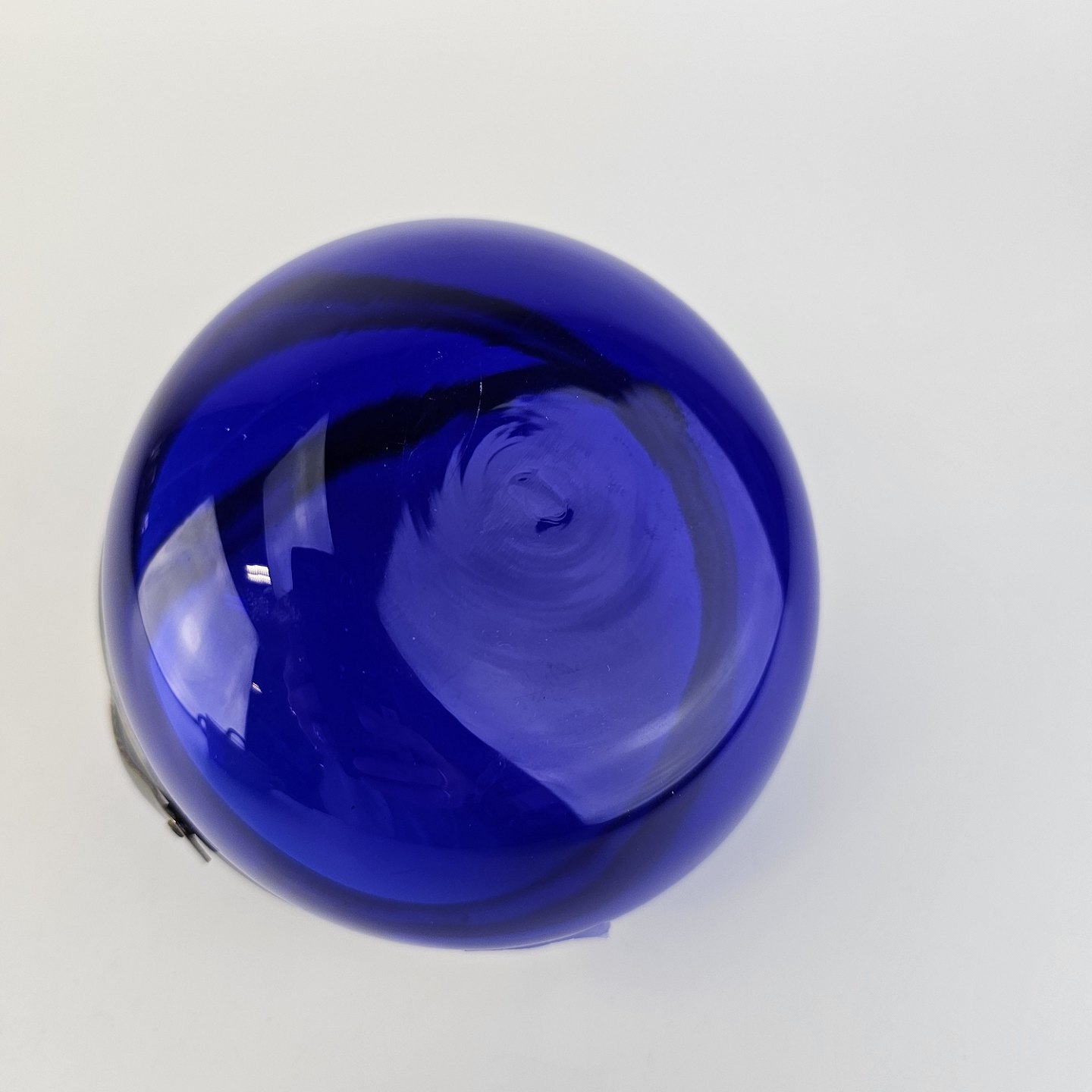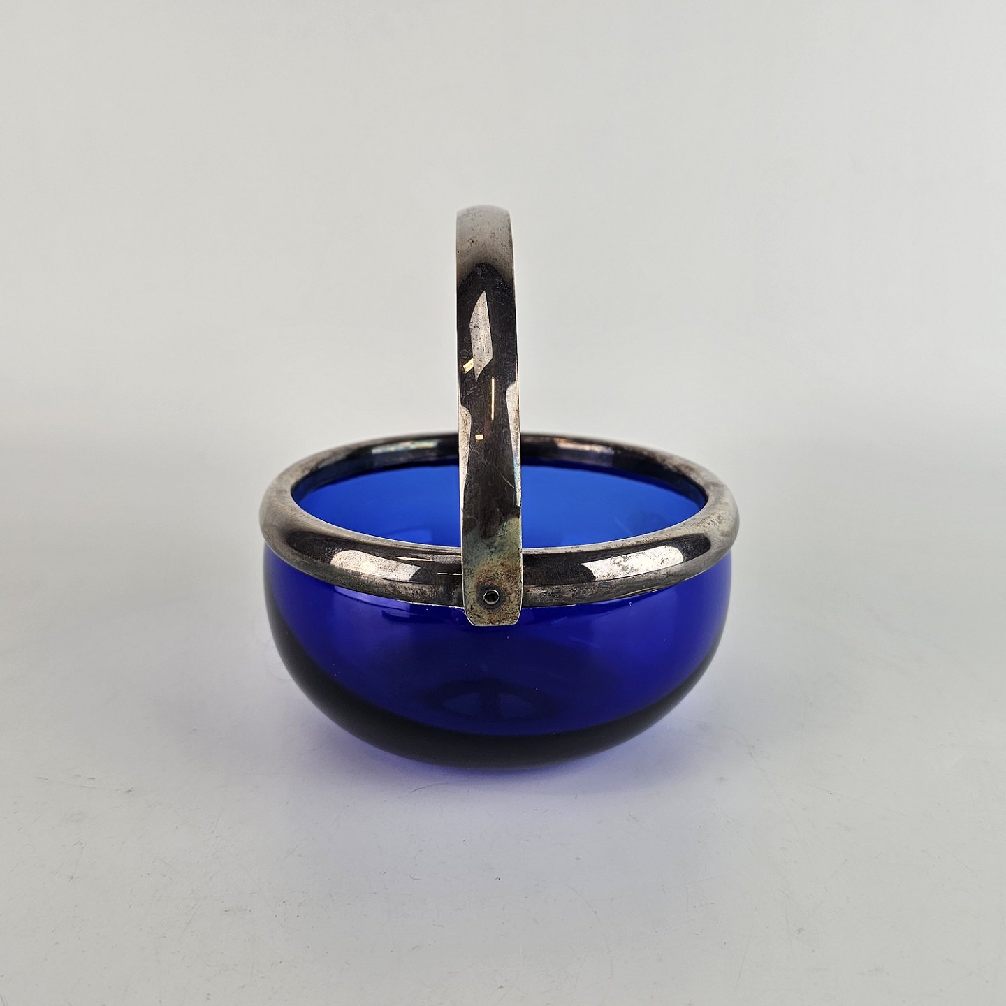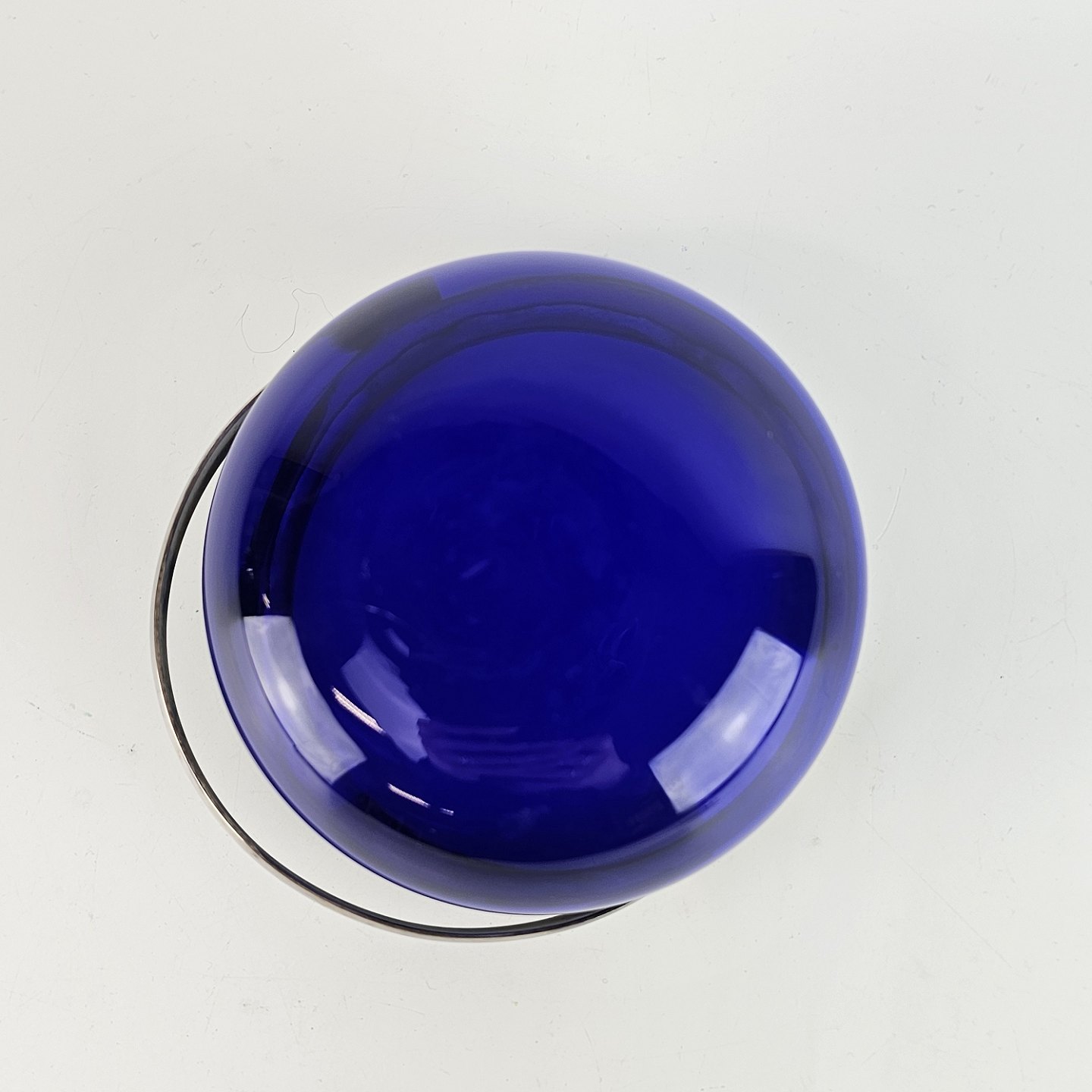 Sukkerskål i blåt glas, med kant og hank af pletsølv