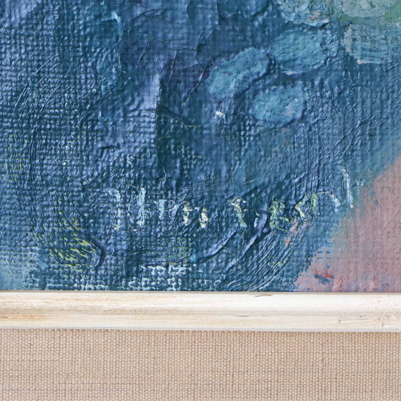 Oliemaleri på lærred i guldmalet træramme med landskabsmotiv af nøgne træer i kuperet terræn.