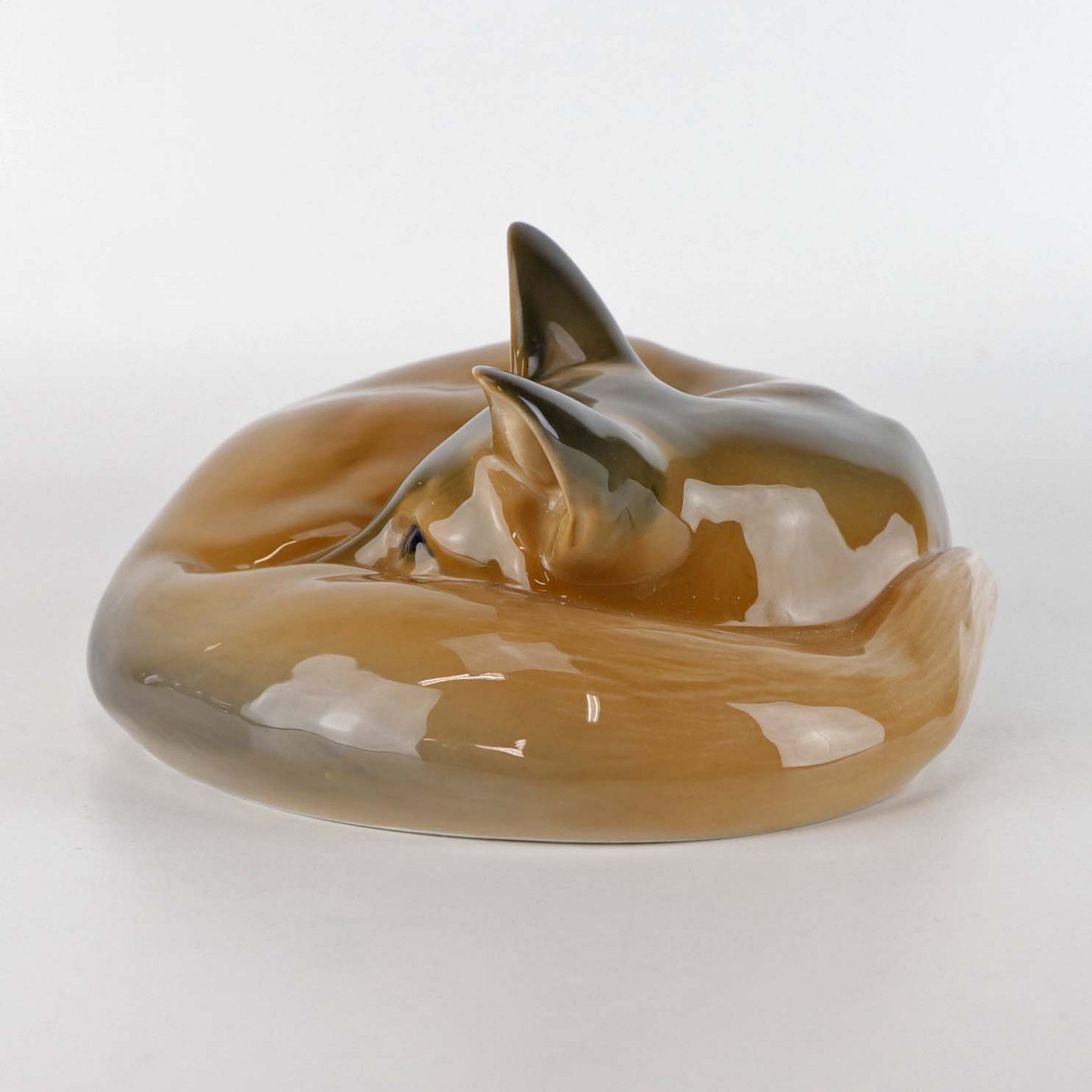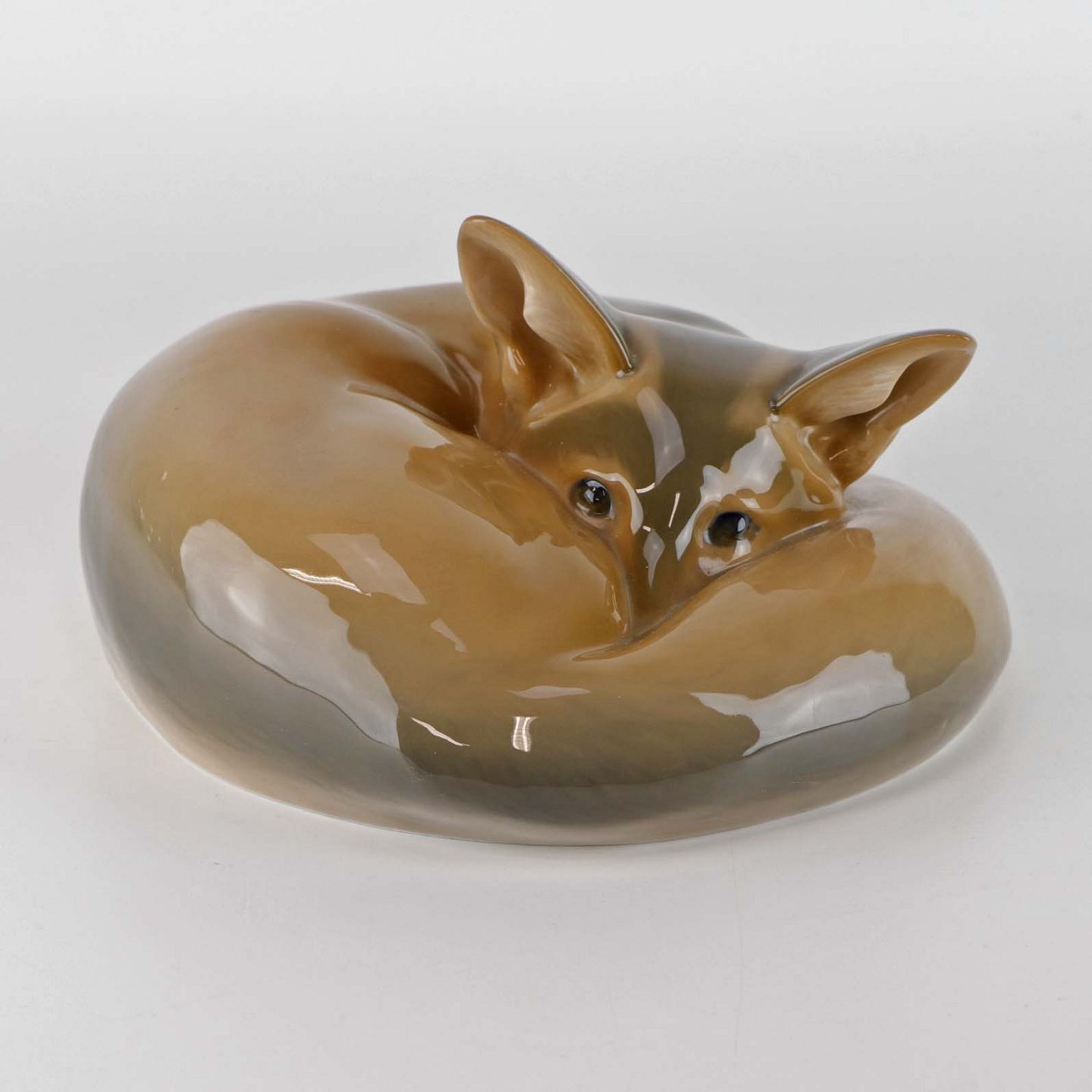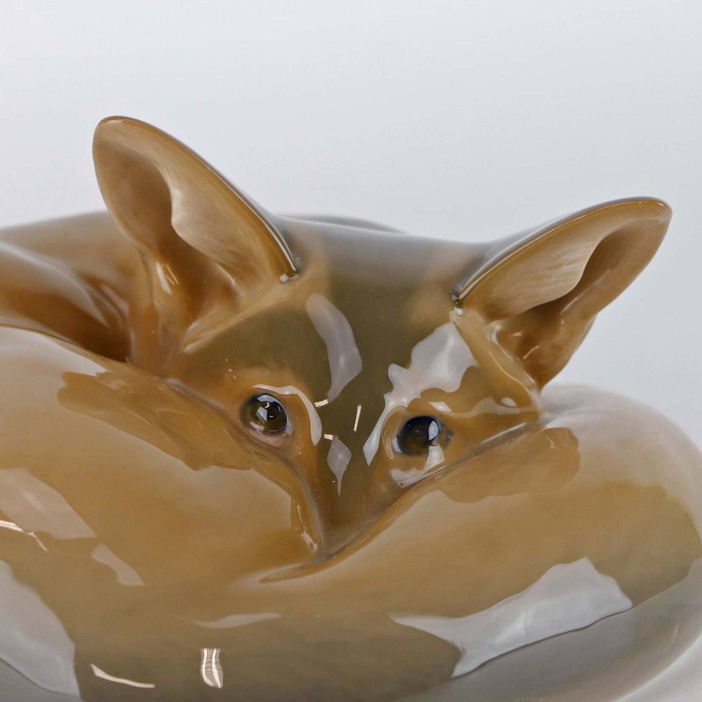 Figur i porcelæn med motiv af hvilende sammerullet ræv. Nr. 438