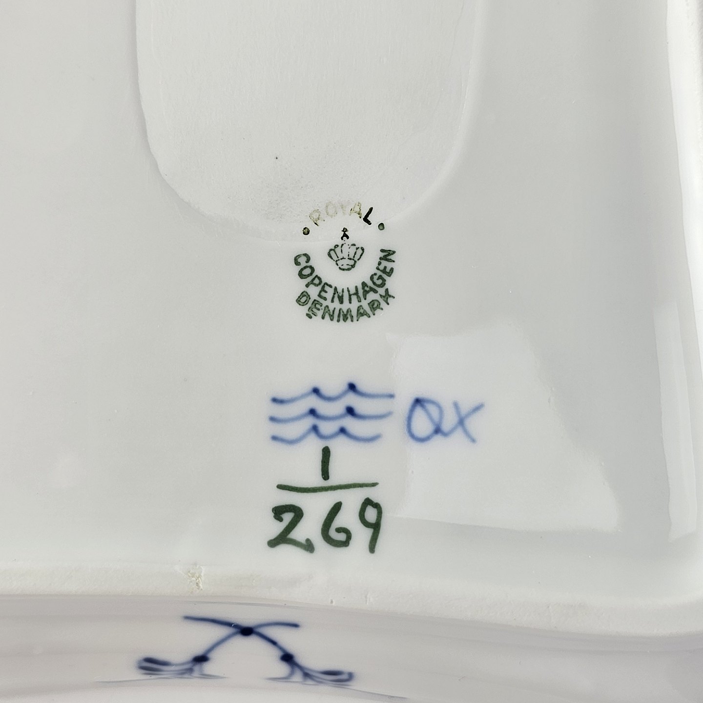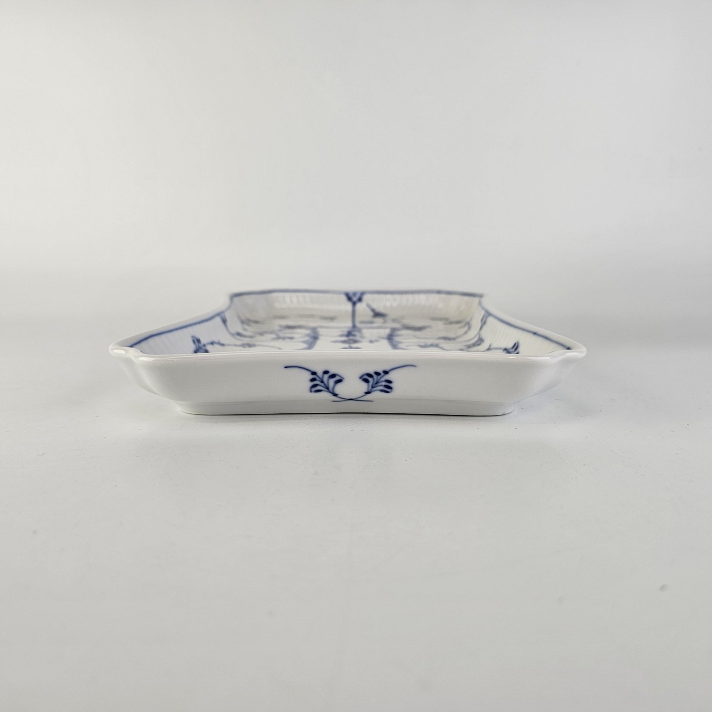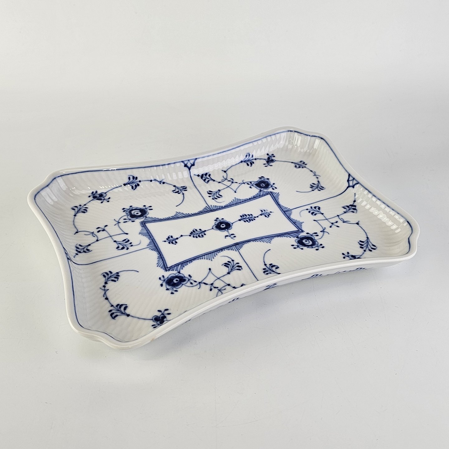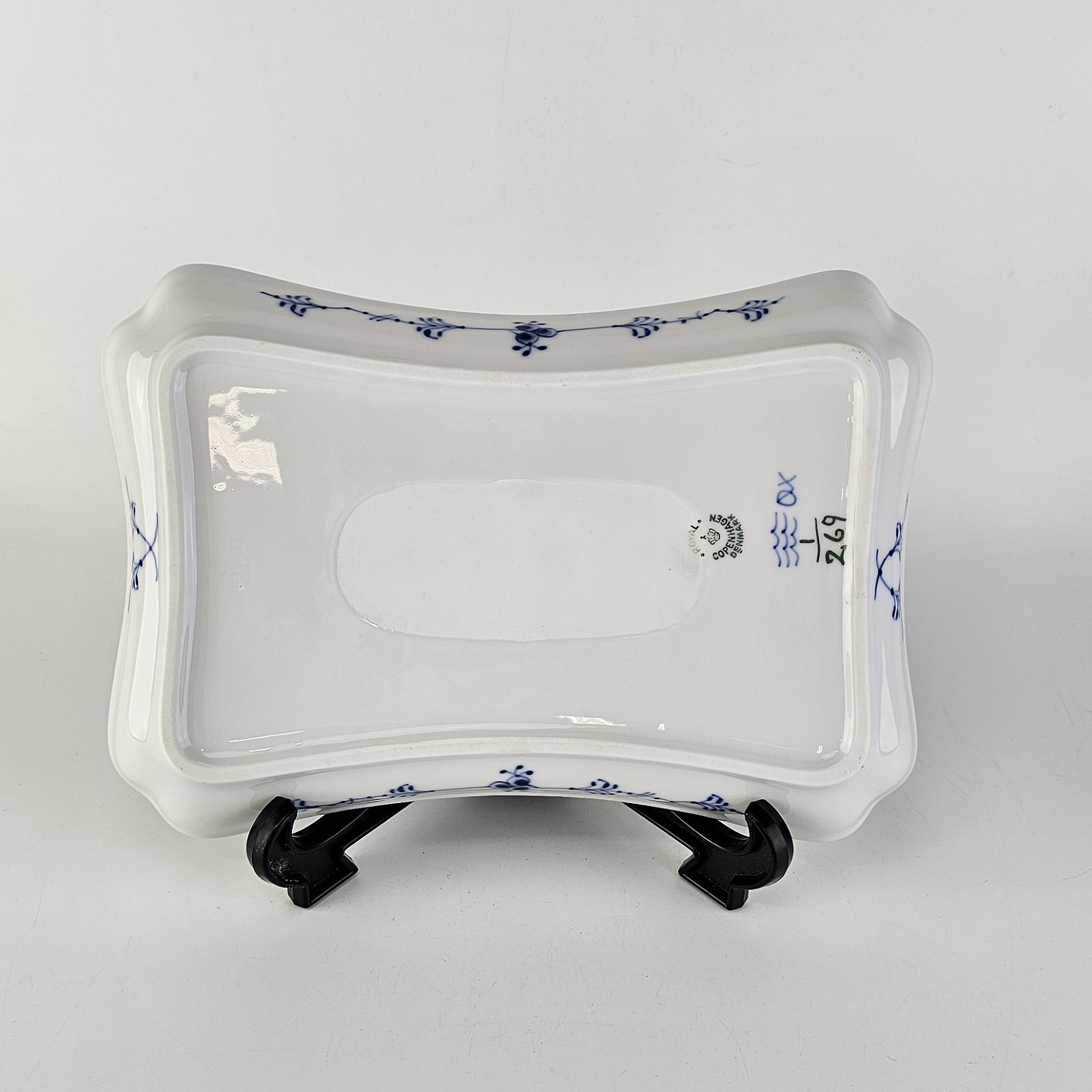 Kongeligt underfad til sukker og fløde i porcelæn, fra stellet Musselmalet Riflet. Nr. 1/269. 1. sortering