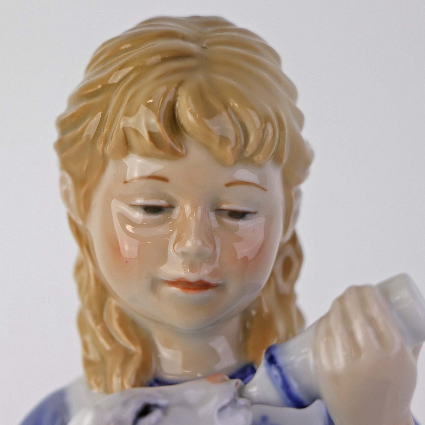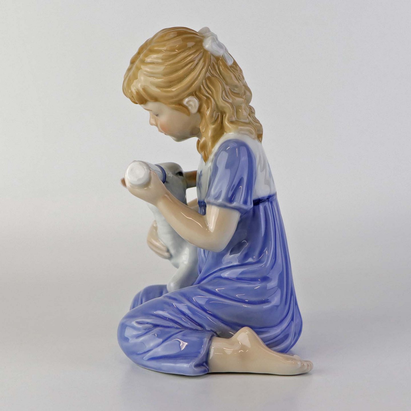 Figur i porcelæn med motiv af lille pige som giver et lam mælk med sutteflaske. Nr. 435